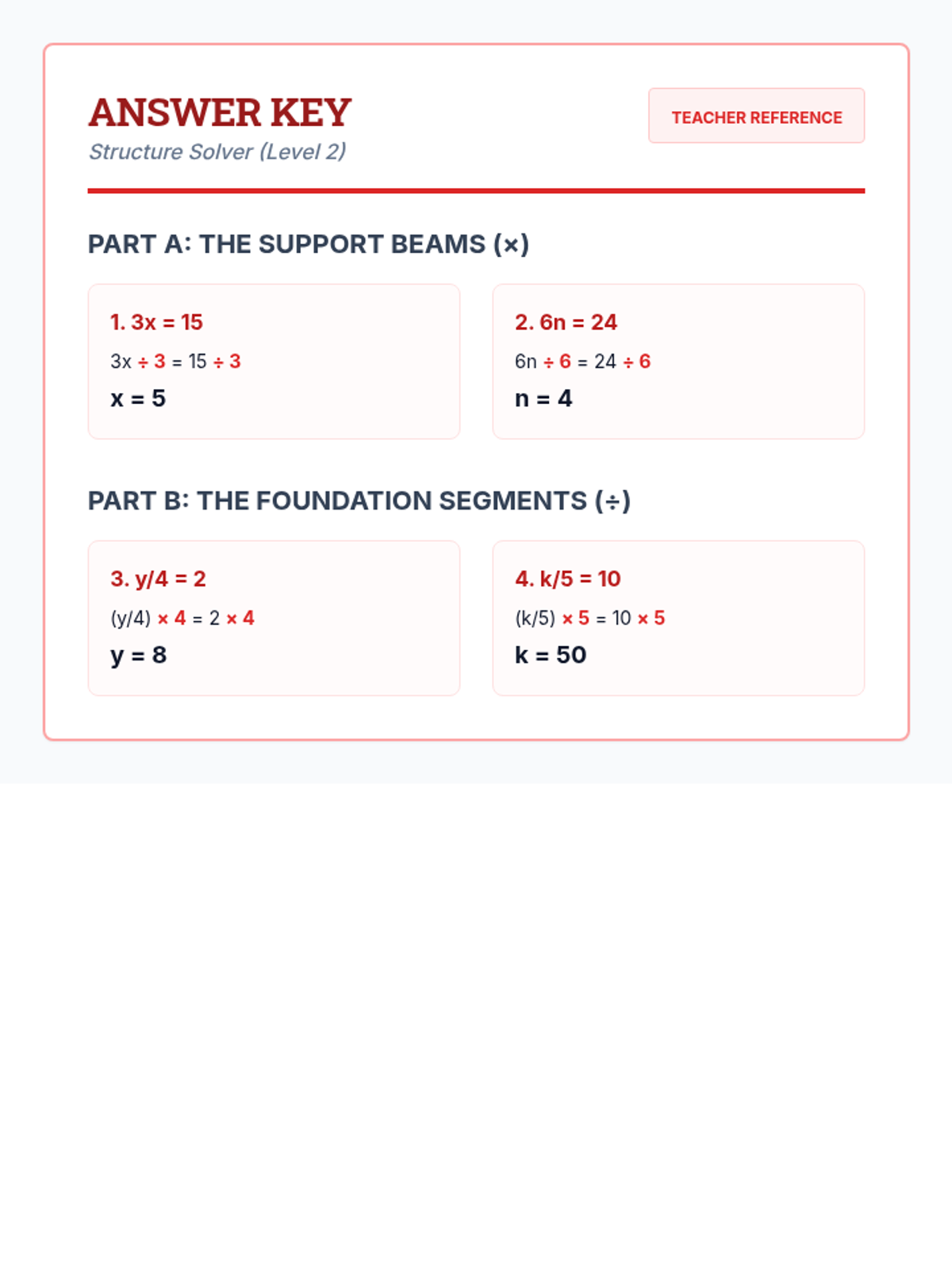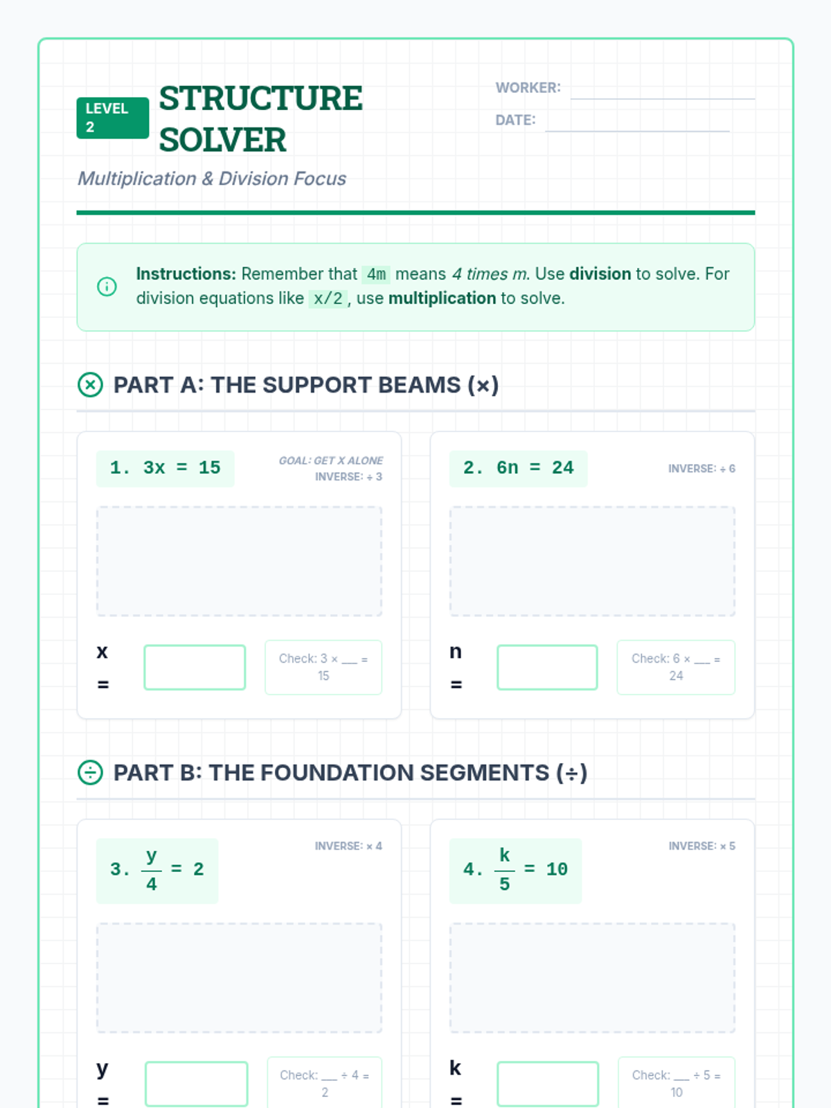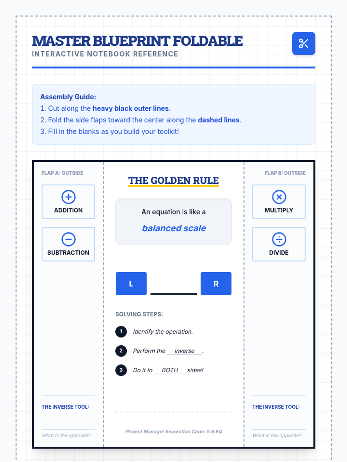 A foundational lesson on solving one-step equations using the four basic operations, designed specifically for special education students with heavy visual scaffolding and a blueprint construction theme.