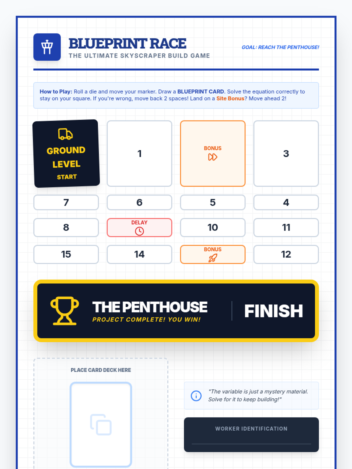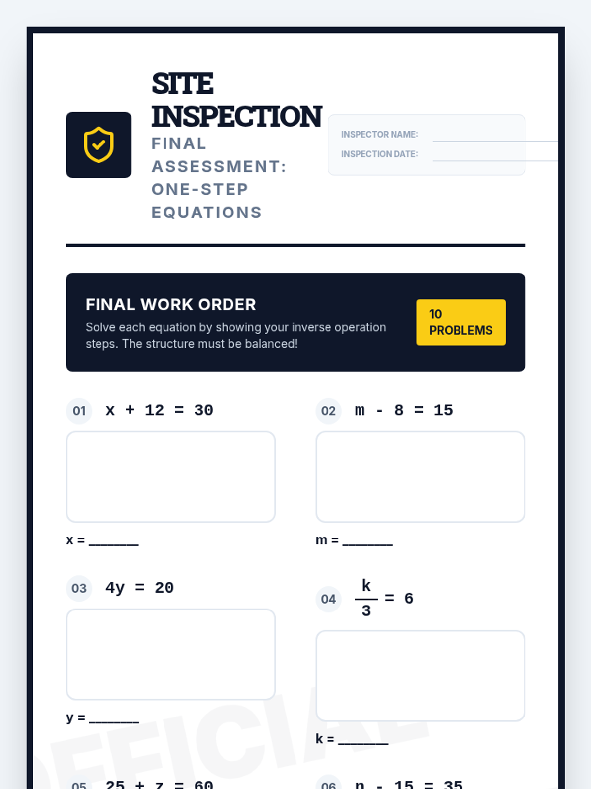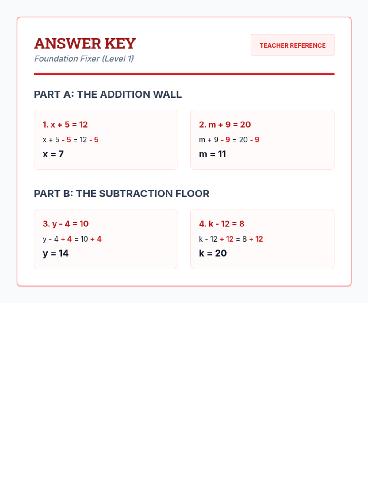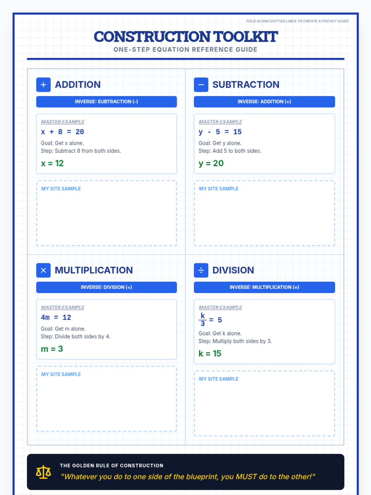 A foundational lesson on solving one-step equations using the four basic operations, designed specifically for special education students with heavy visual scaffolding and a blueprint construction theme.