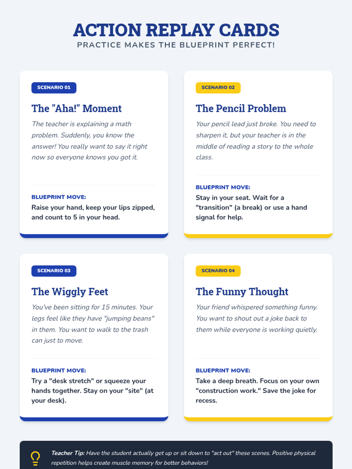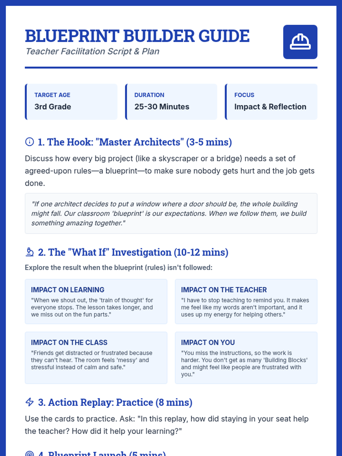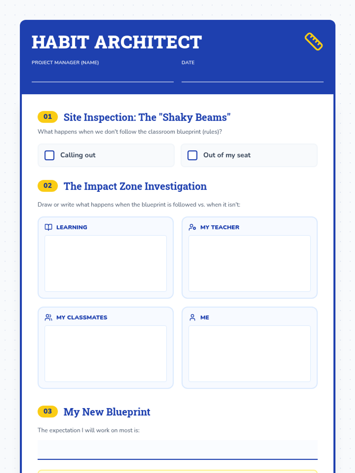 A focused lesson designed to help a 3rd-grade student recognize and improve classroom behaviors like calling out and staying in their seat through reflection and goal-setting.