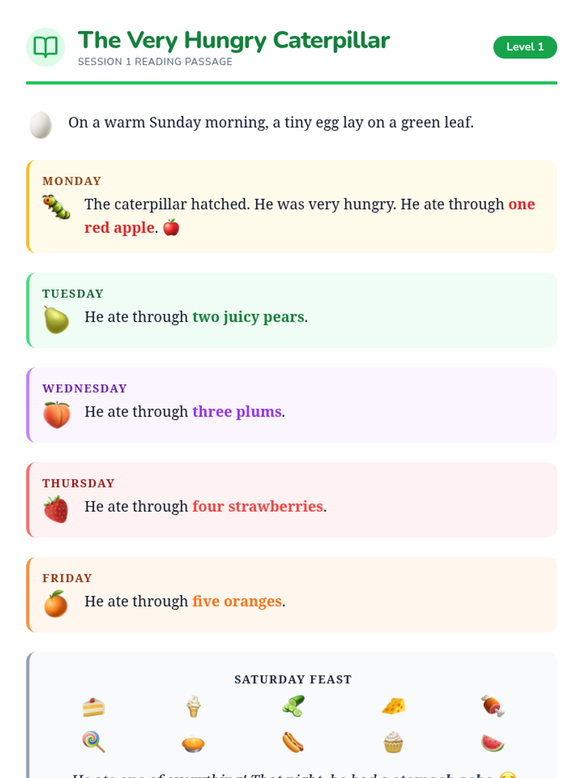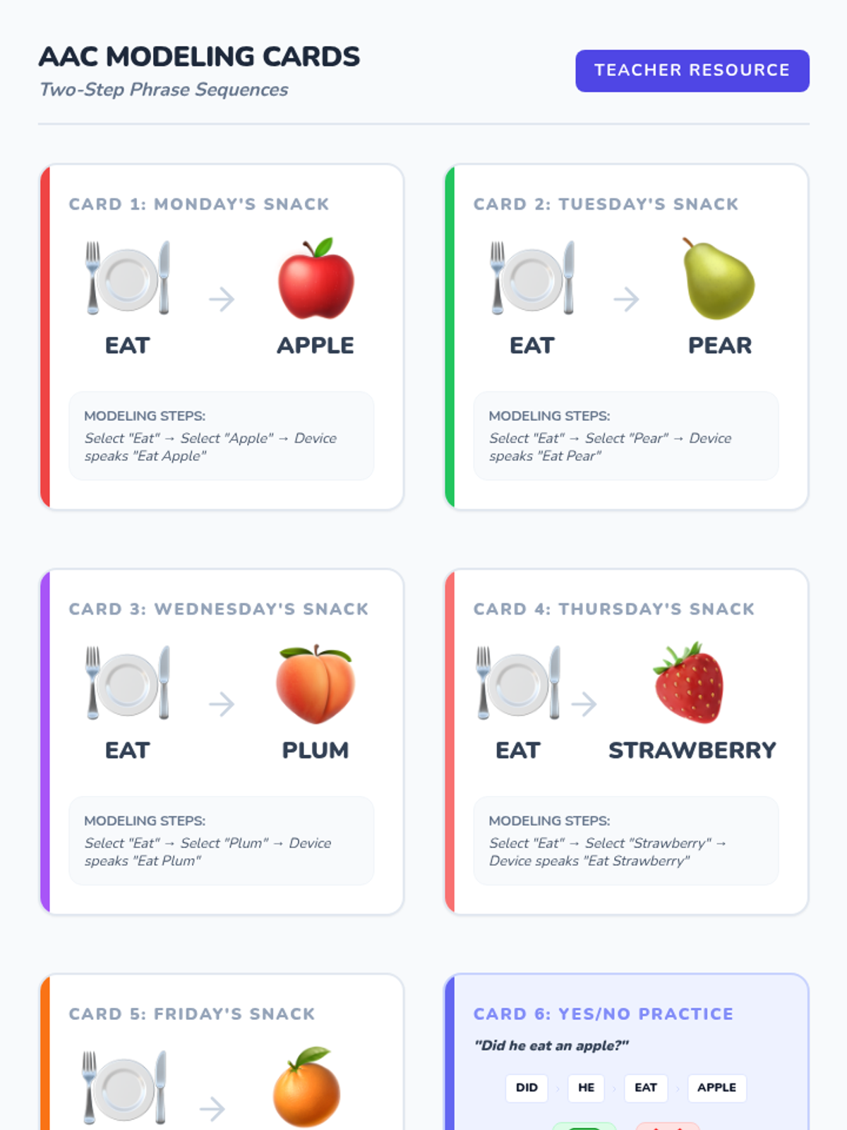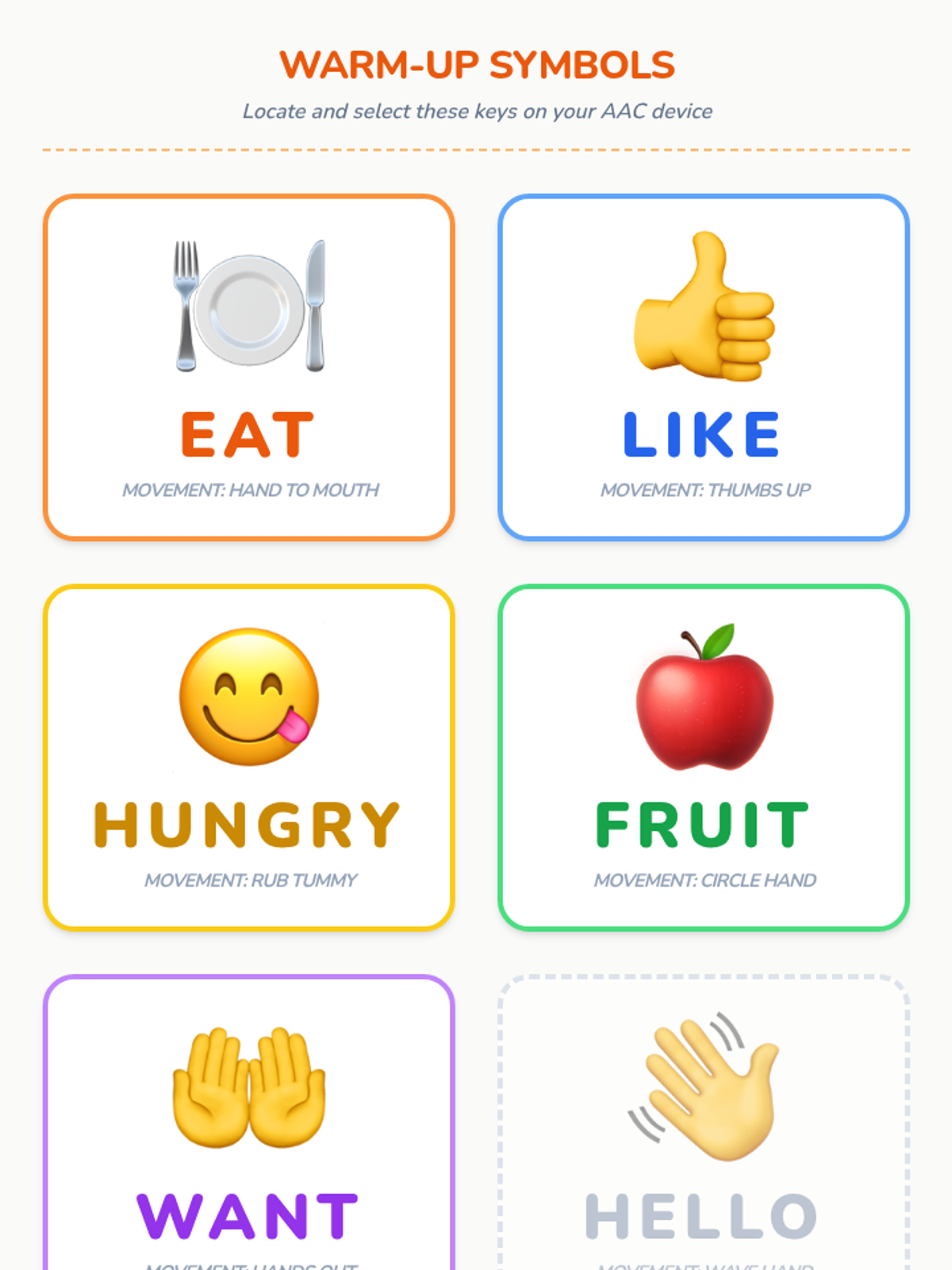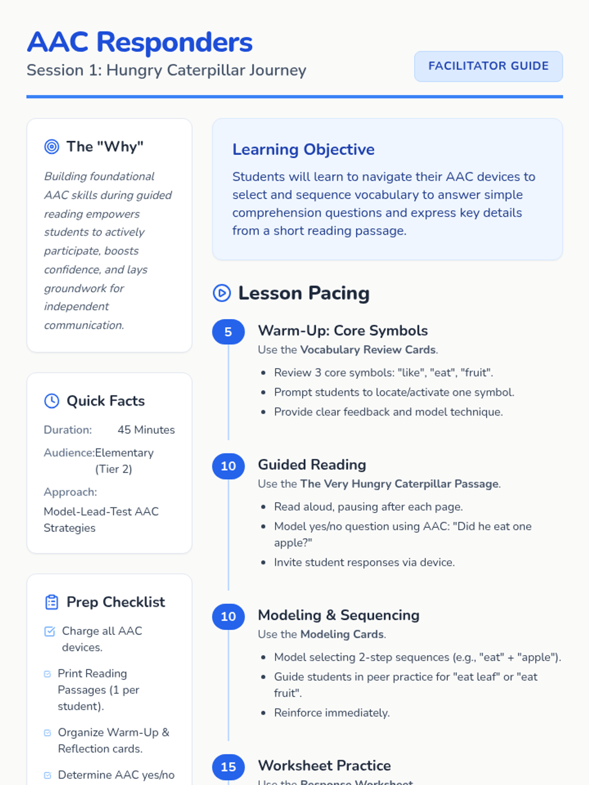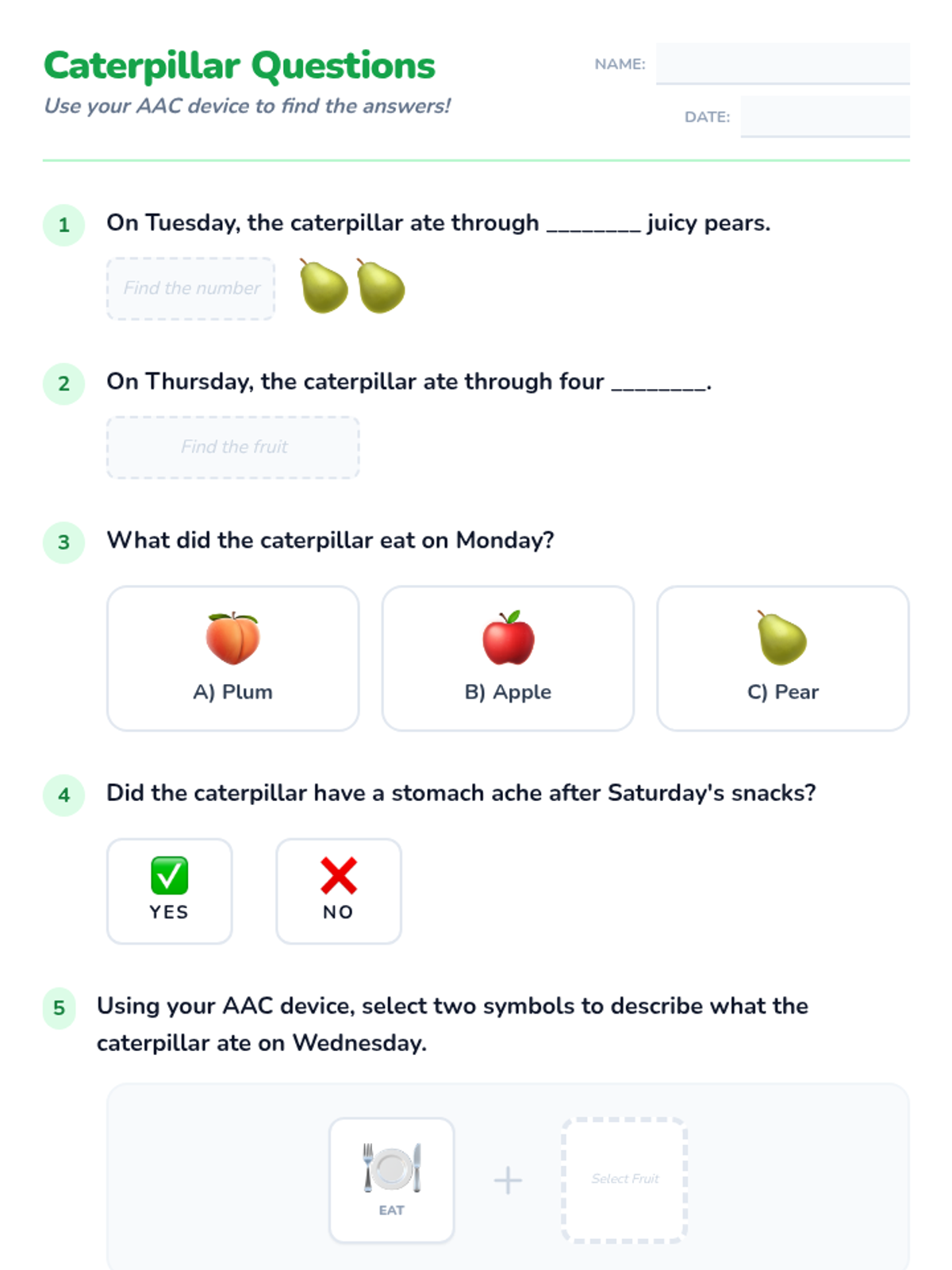 Students explore 'The Very Hungry Caterpillar' while learning to navigate their AAC devices for simple comprehension, sequencing two-step phrases, and expressing feelings about their learning.