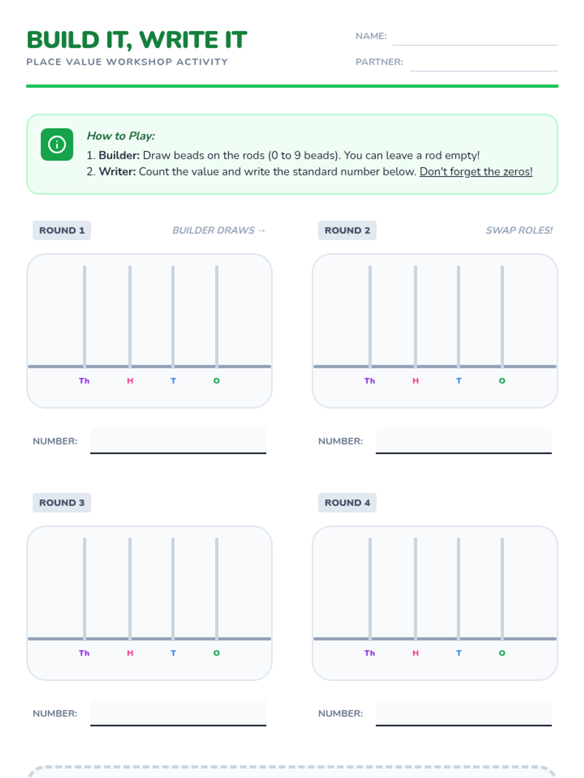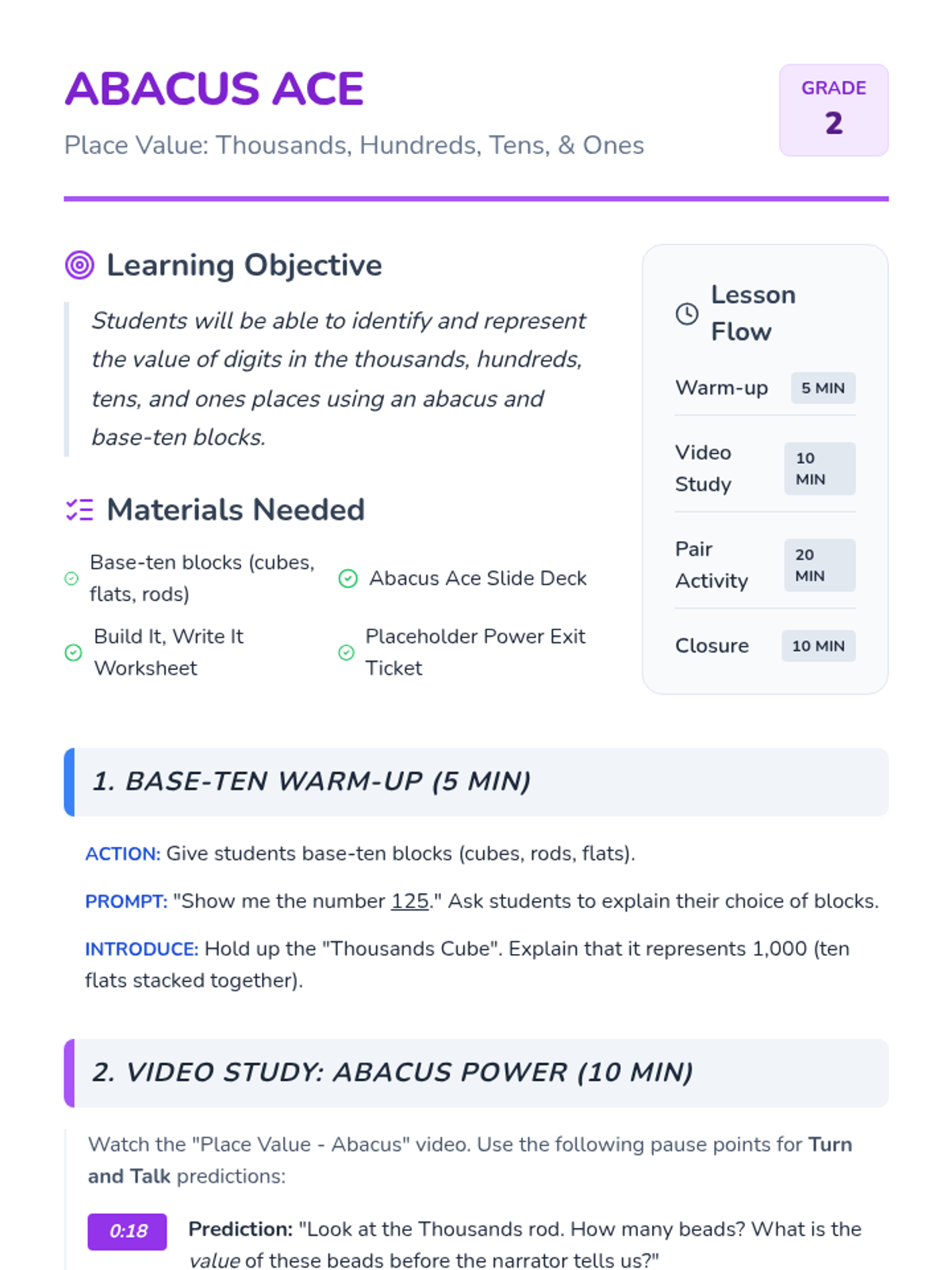 A comprehensive lesson introducing thousands, hundreds, tens, and ones using an abacus and base-ten blocks, featuring interactive video pauses and a collaborative "Build It, Write It" activity.