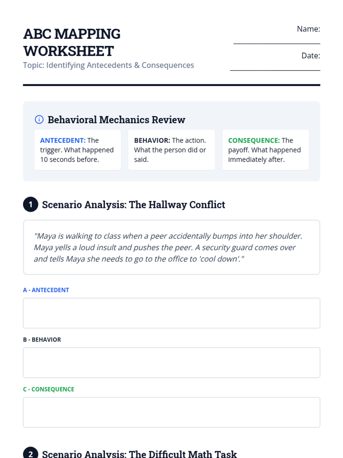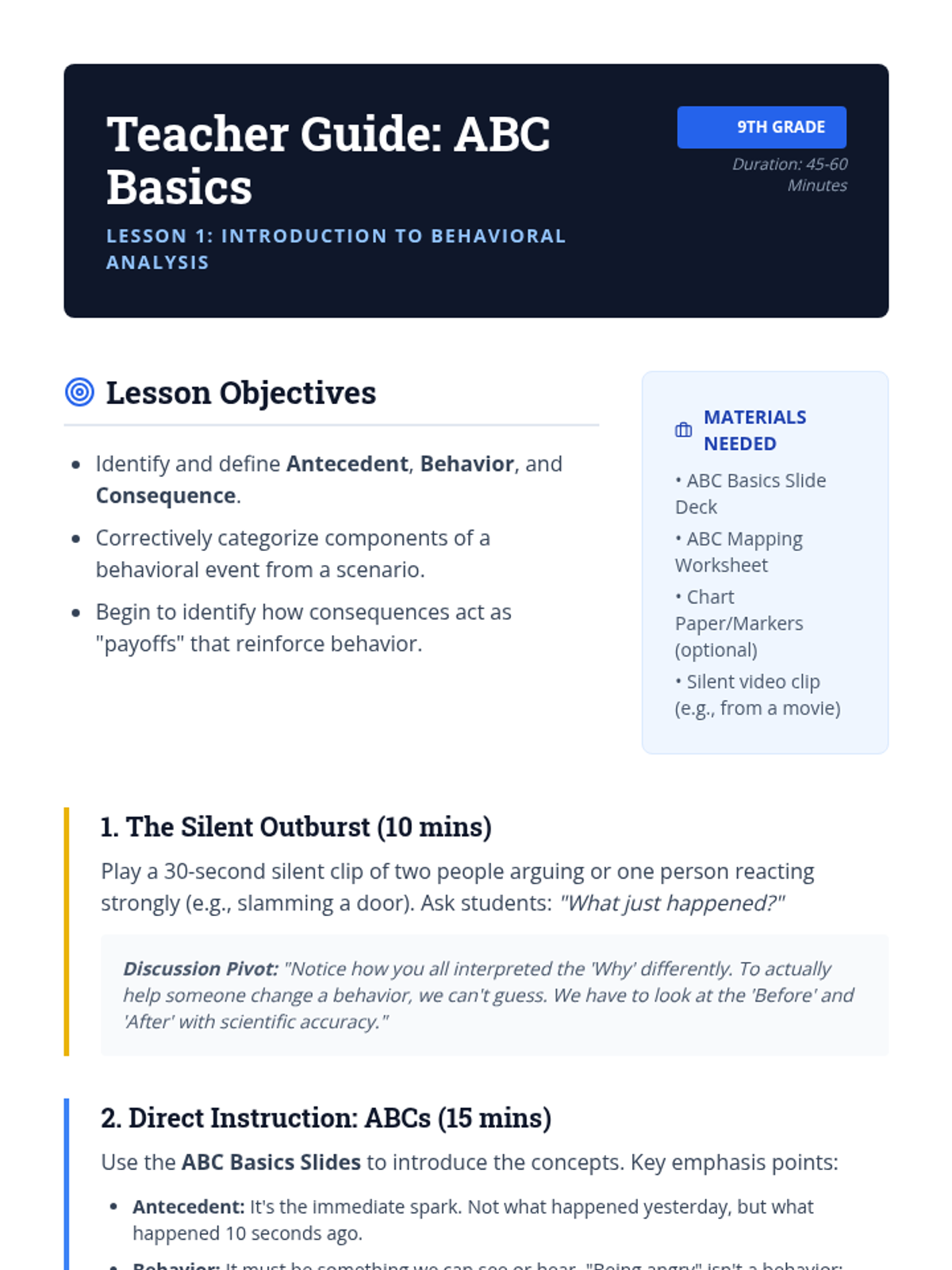An introductory lesson defining the Antecedent-Behavior-Consequence (ABC) model and practicing basic categorization of behavioral events.