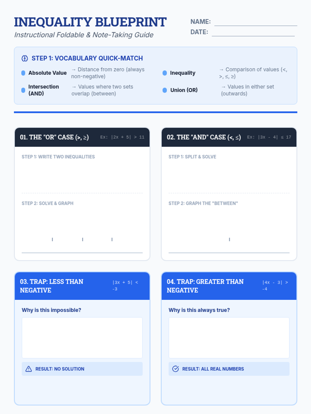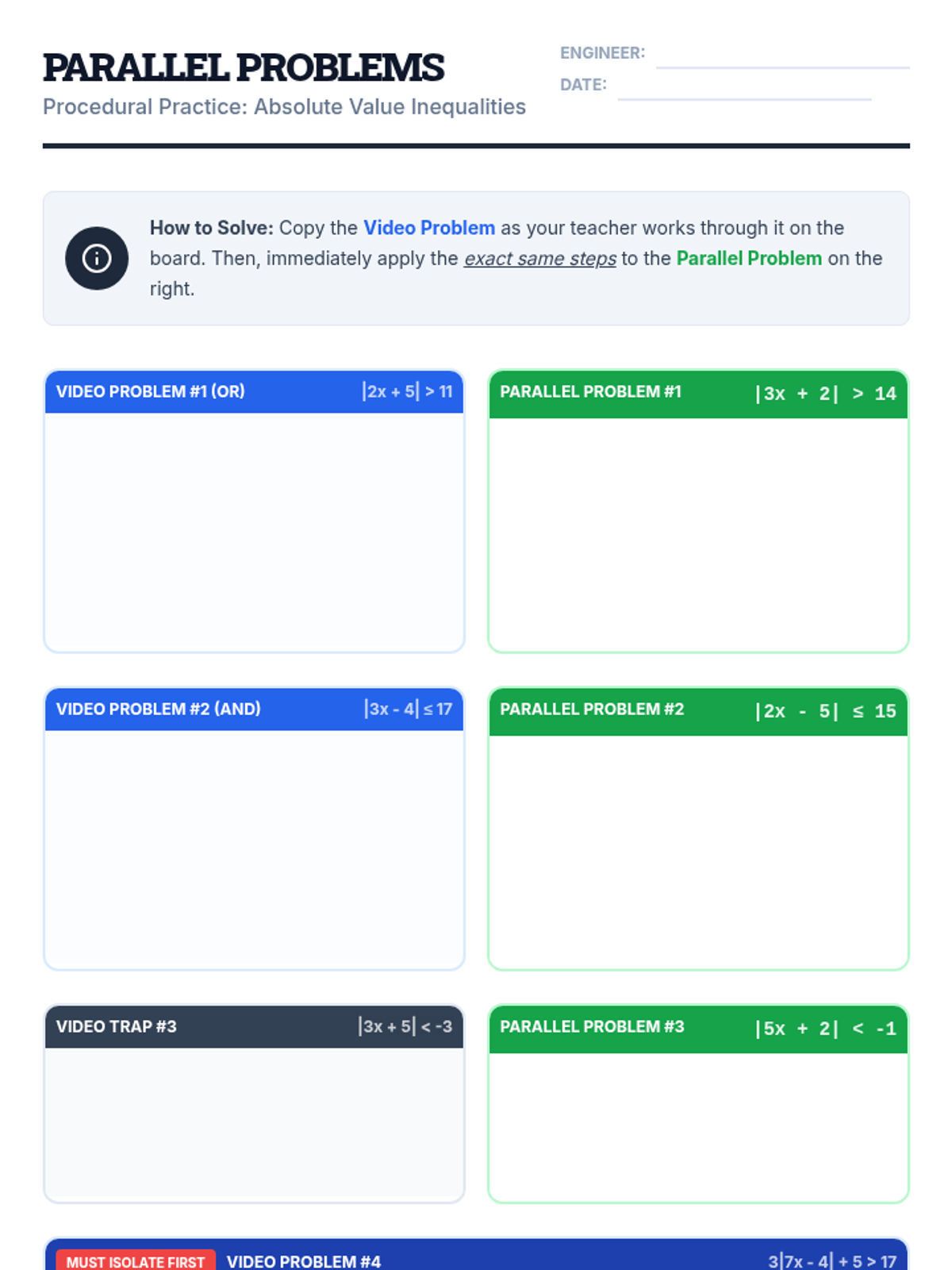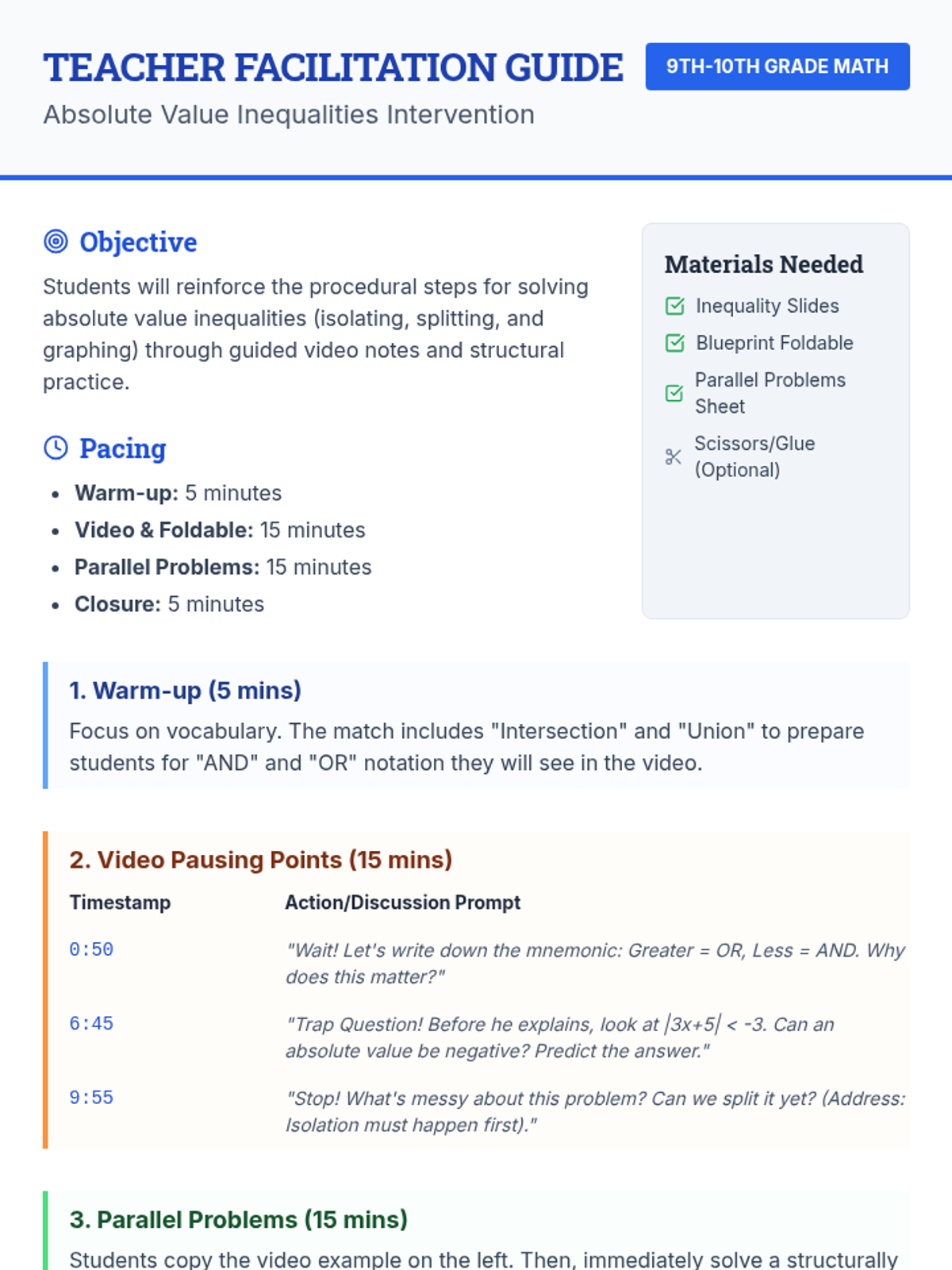 A math intervention lesson focused on the procedural steps for solving absolute value inequalities, featuring guided video notes and parallel practice.