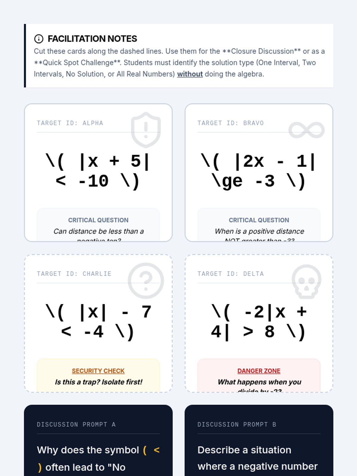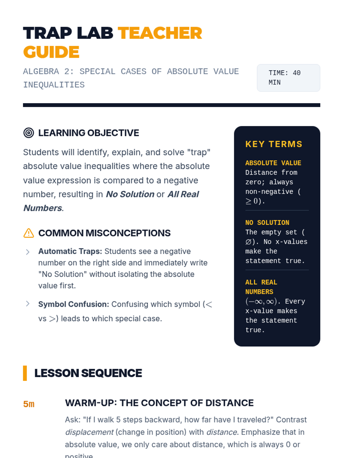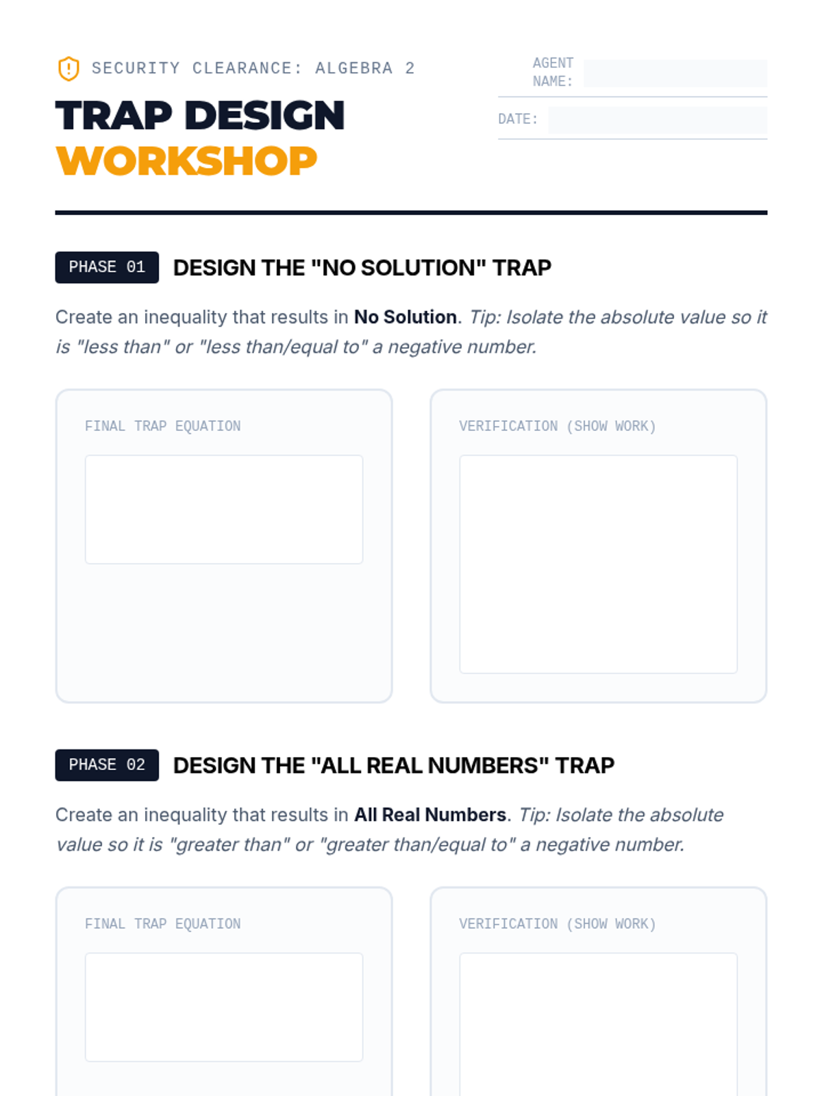 Students will investigate 'trap' absolute value inequalities involving negative numbers, learning to identify No Solution and All Real Numbers cases through video analysis and a peer-design workshop.