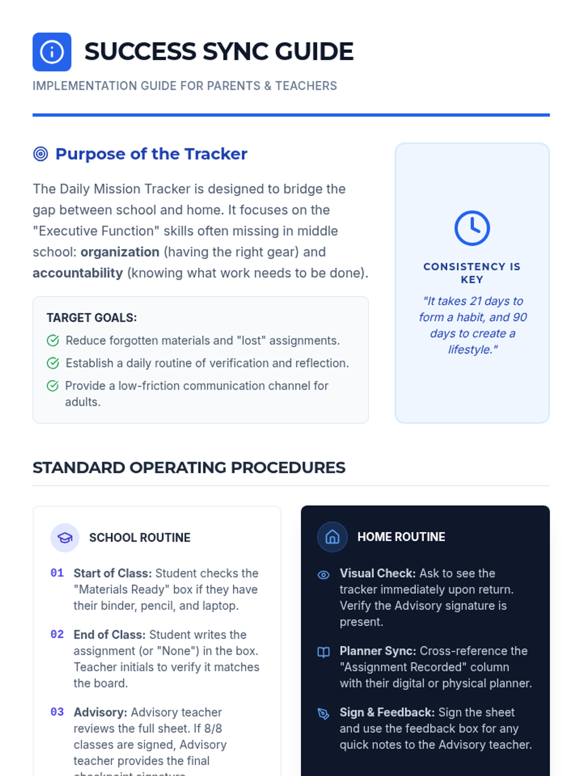 A communication system designed to support middle school students in developing organizational habits and accountability through daily teacher and parent check-ins.