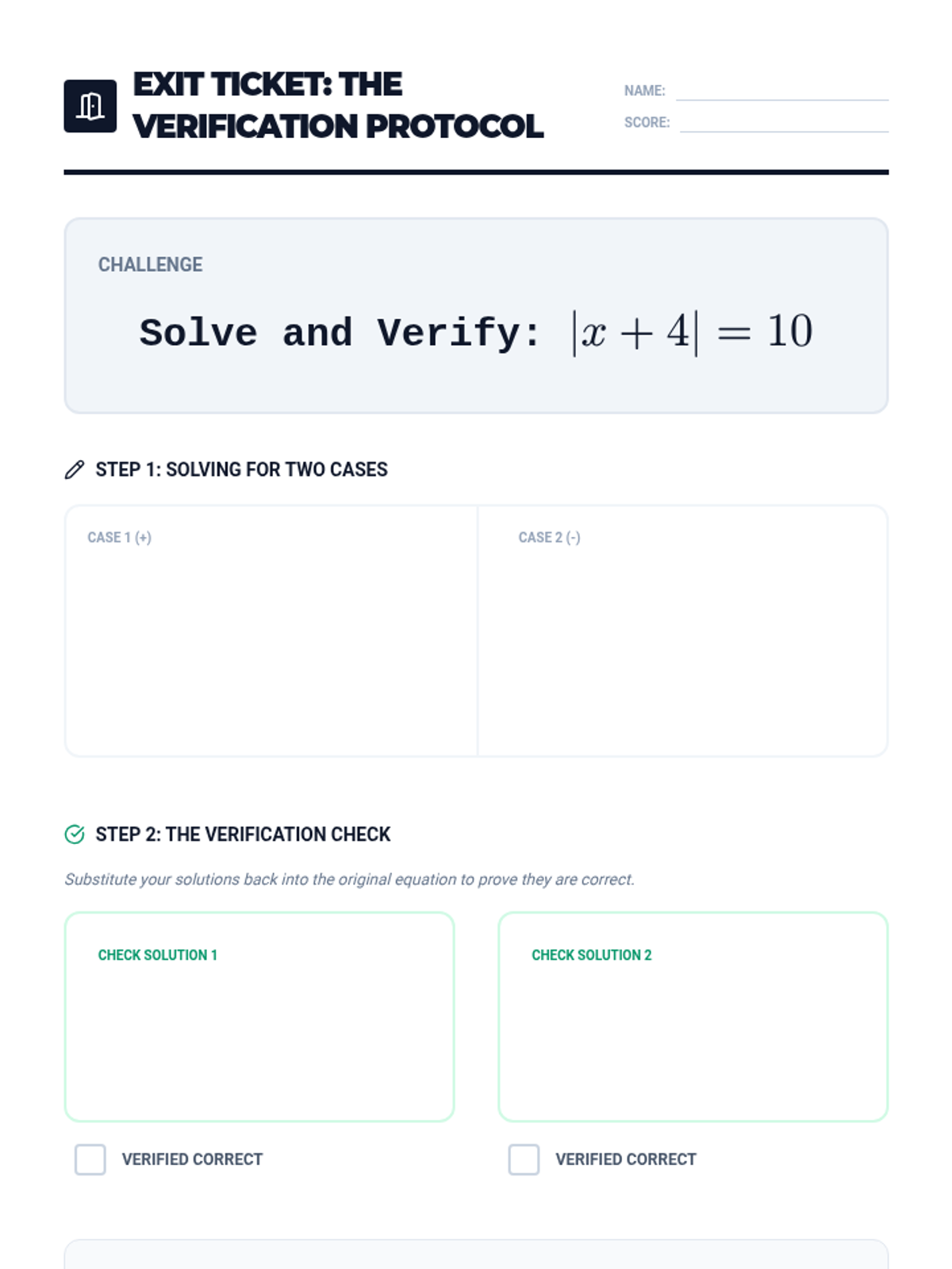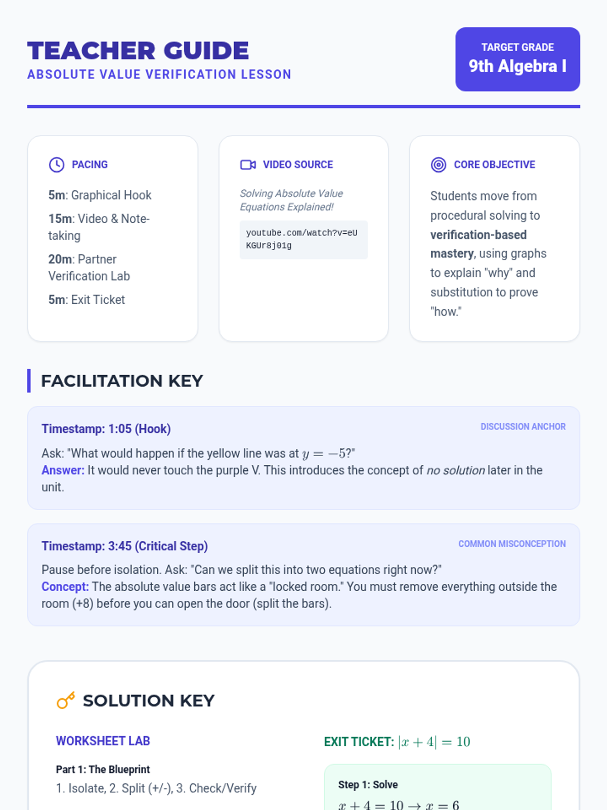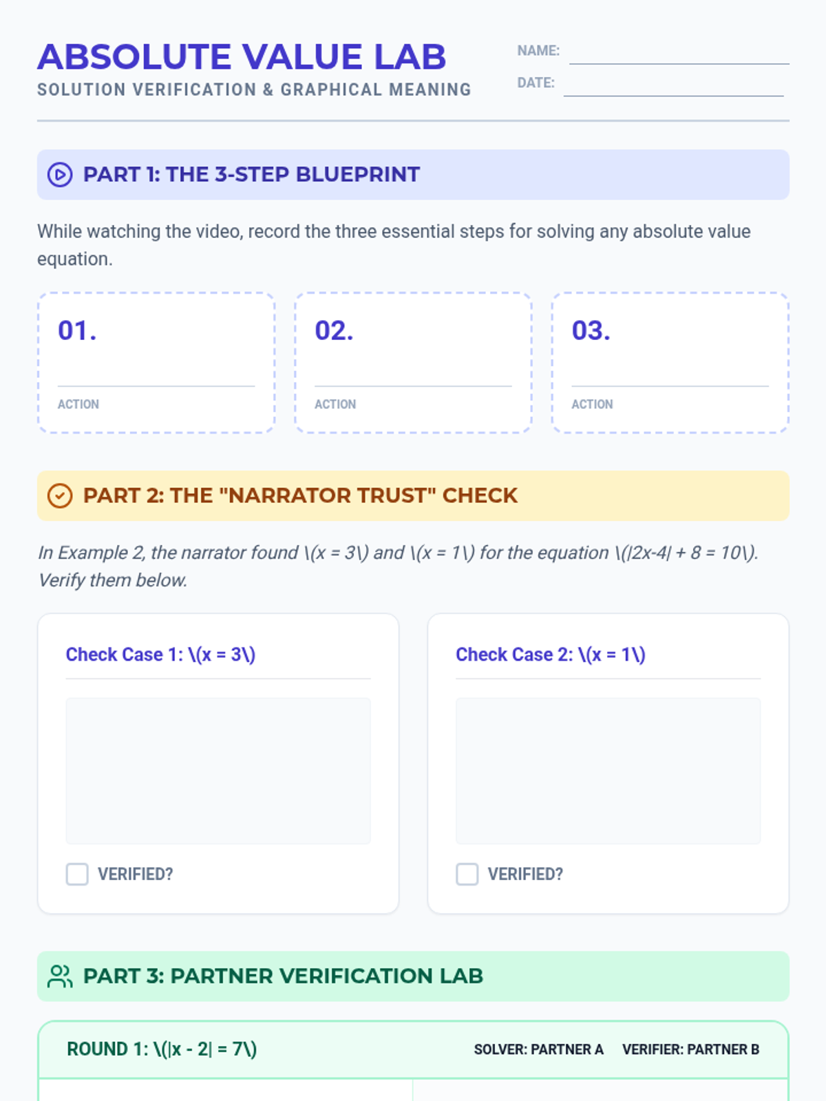 A comprehensive lesson where students learn to solve and verify absolute value equations through graphical interpretation and algebraic substitution. Includes a video-guided hook, partner verification lab, and exit ticket assessment.