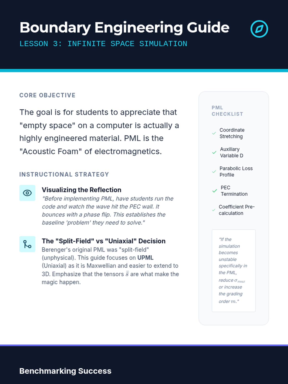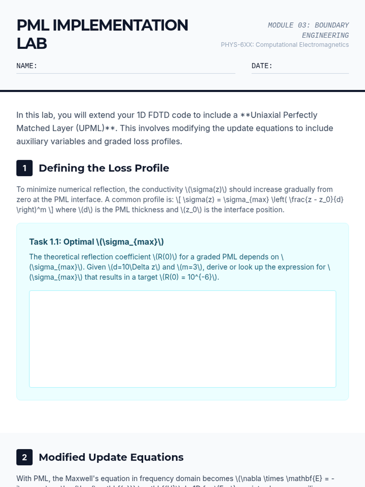 Implementation of Absorbing Boundary Conditions (ABC) and Perfectly Matched Layers (PML) to simulate open-space propagation within a finite grid.