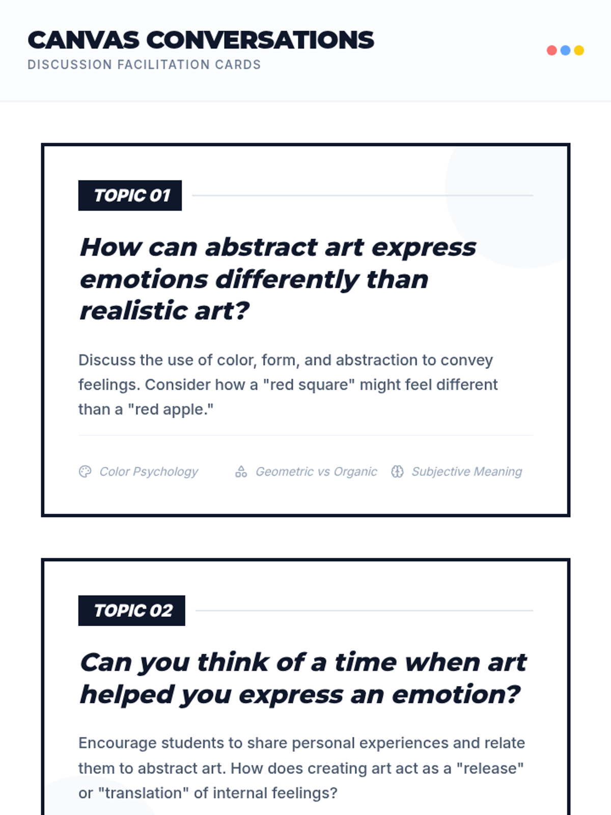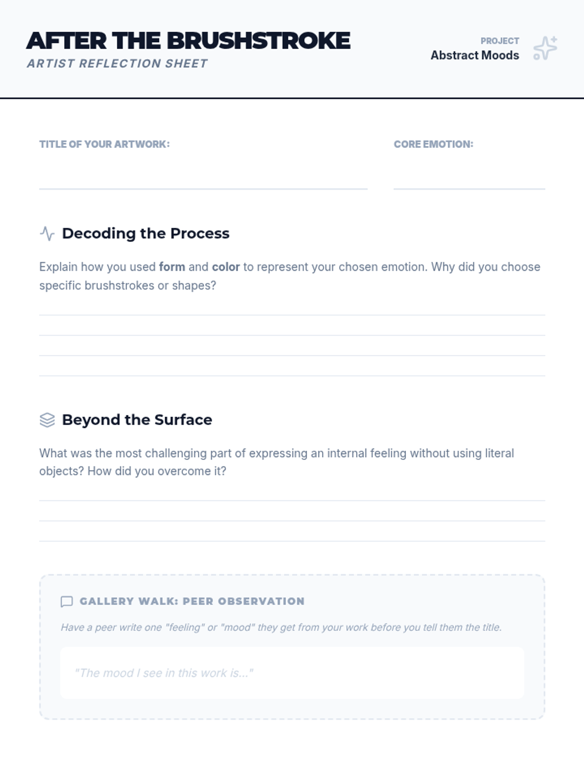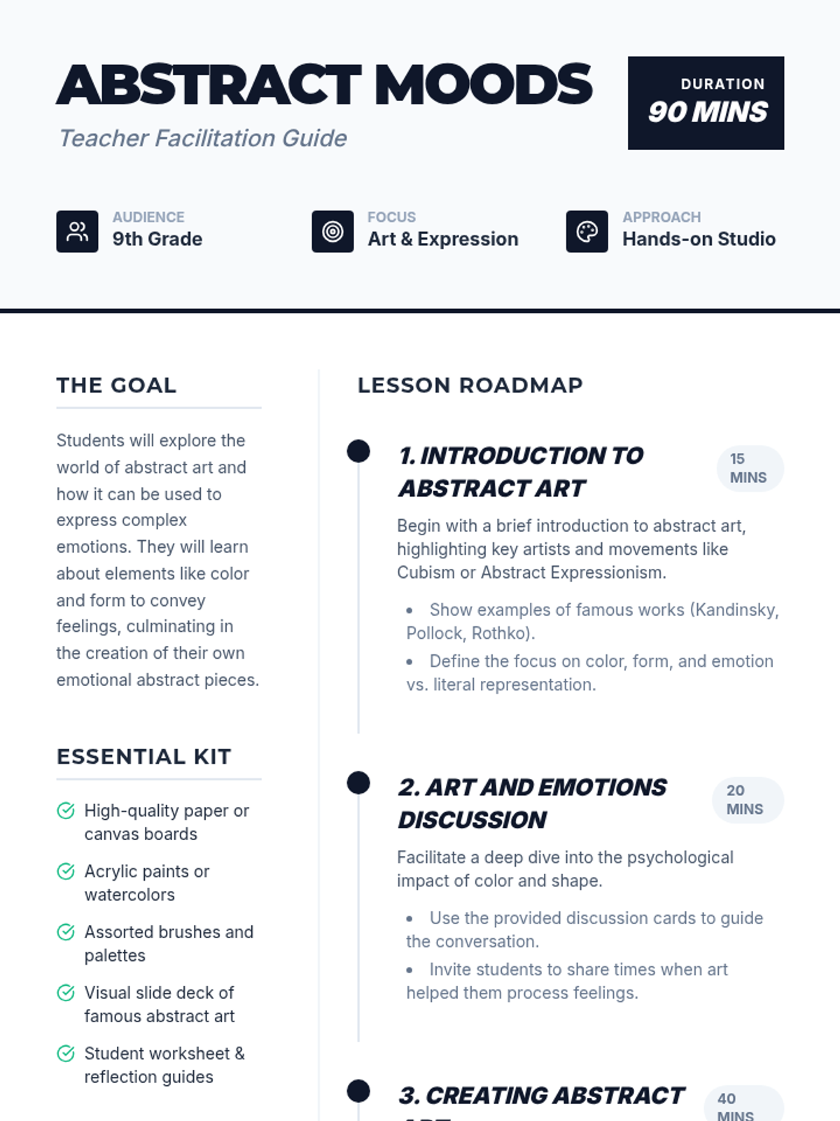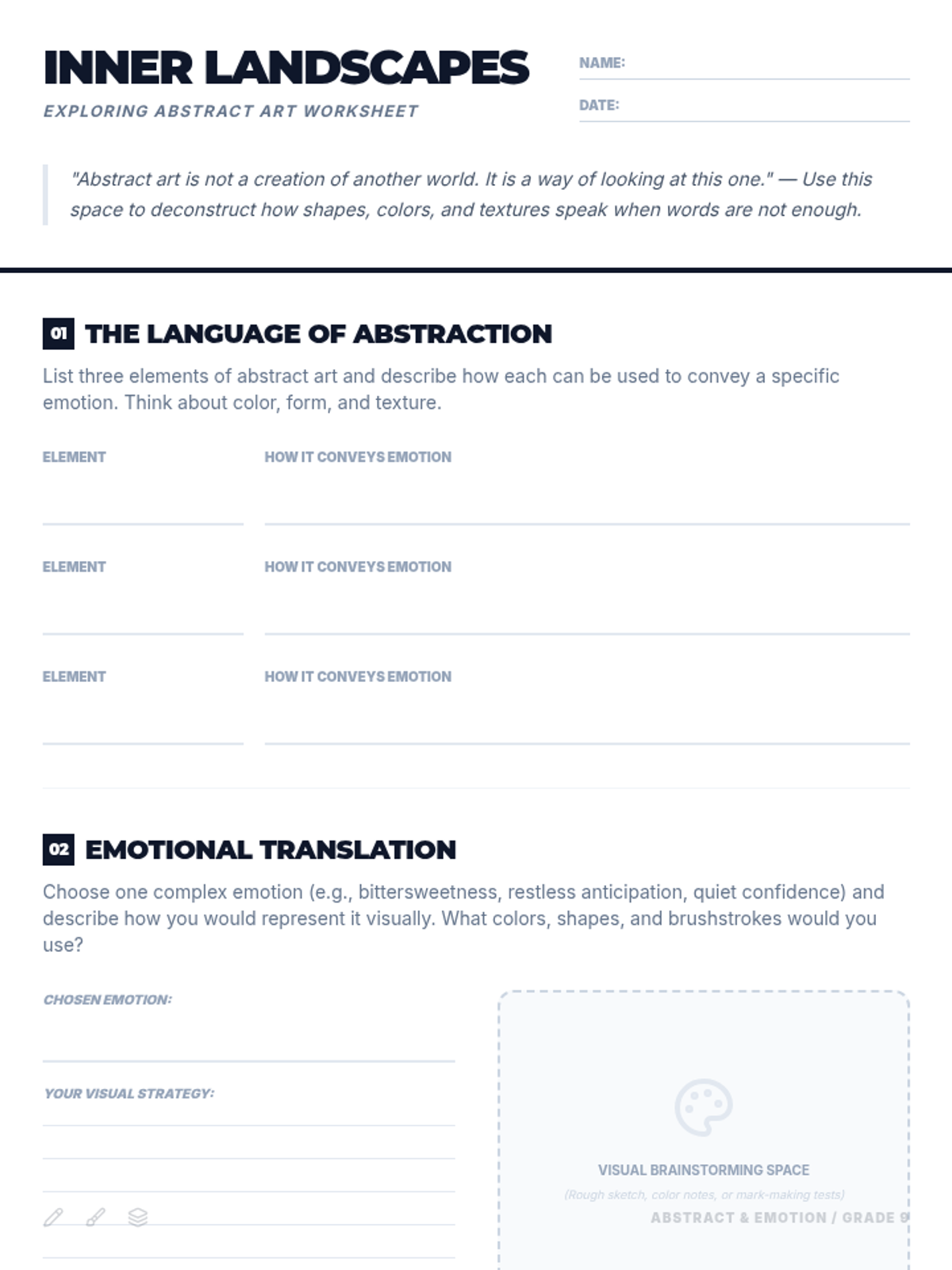A comprehensive lesson for 9th-grade students to explore the intersection of abstract art and emotional expression through analysis and hands-on creation.