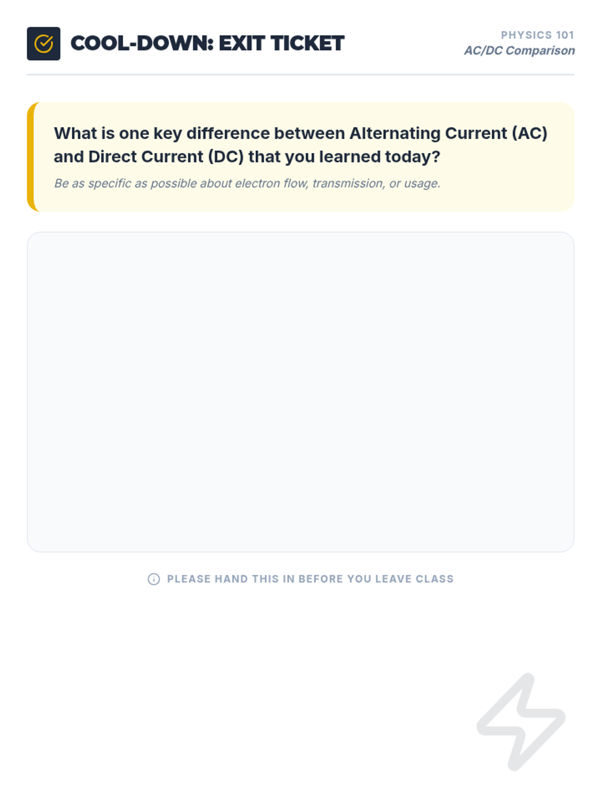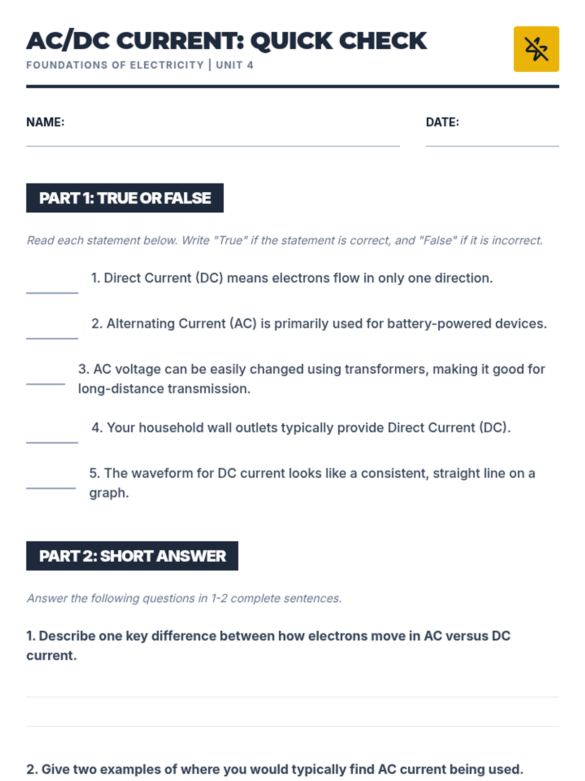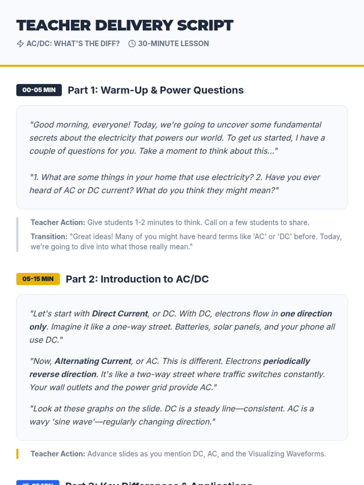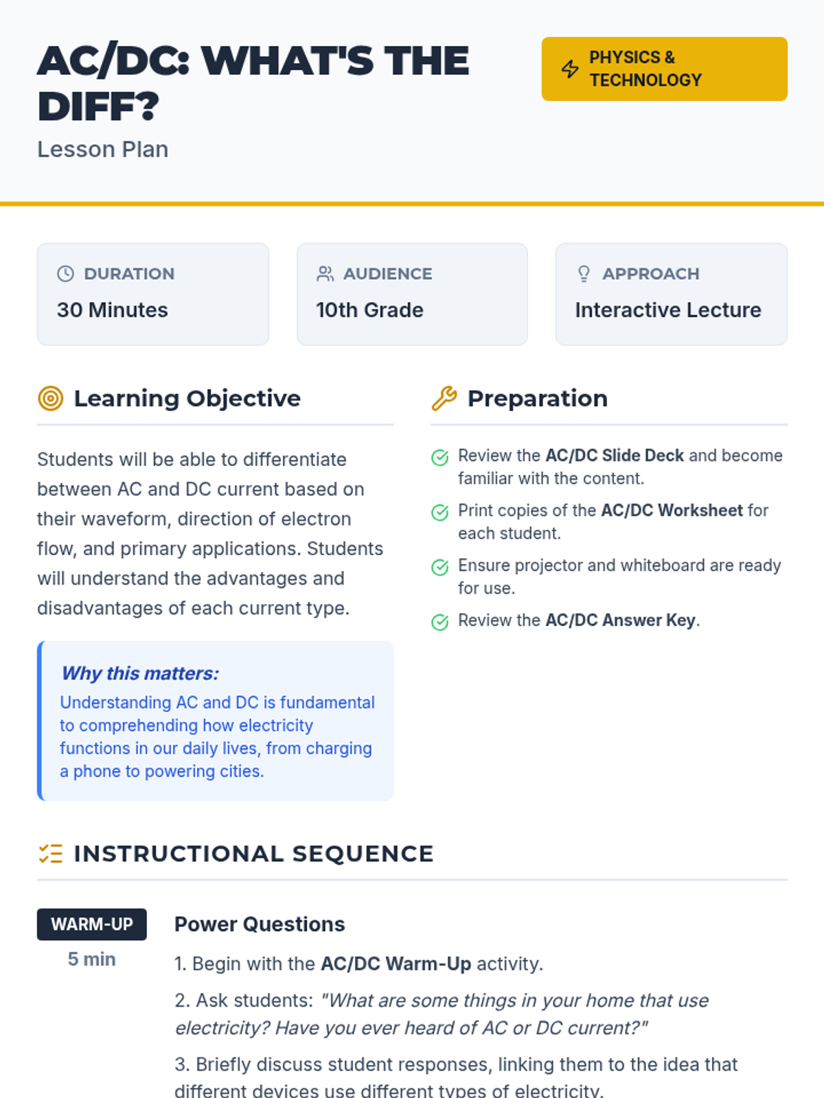 This 30-minute lesson for 10th-grade students clarifies the fundamental electrical differences between Alternating Current (AC) and Direct Current (DC), covering waveforms, electron flow, and real-world applications.