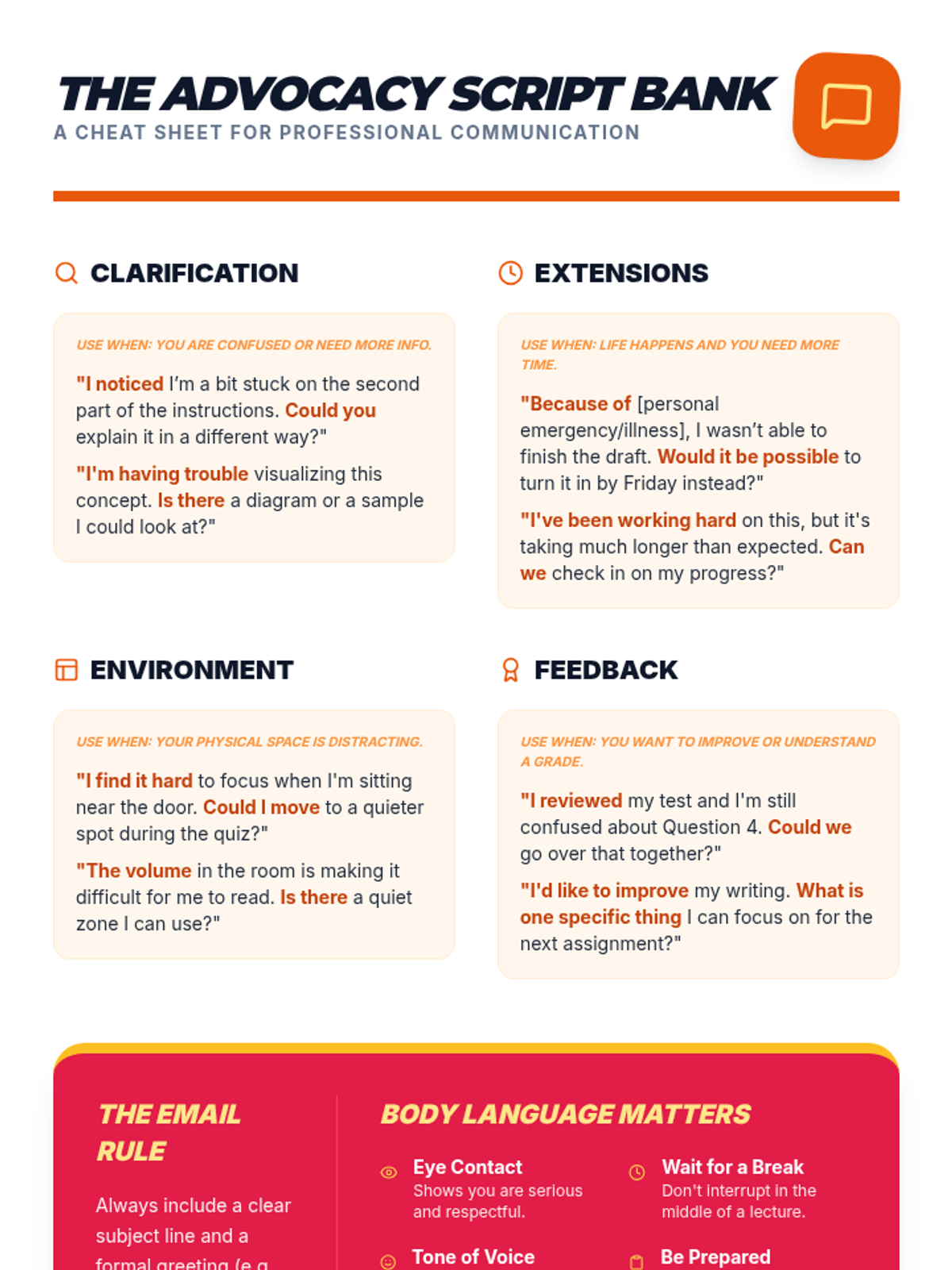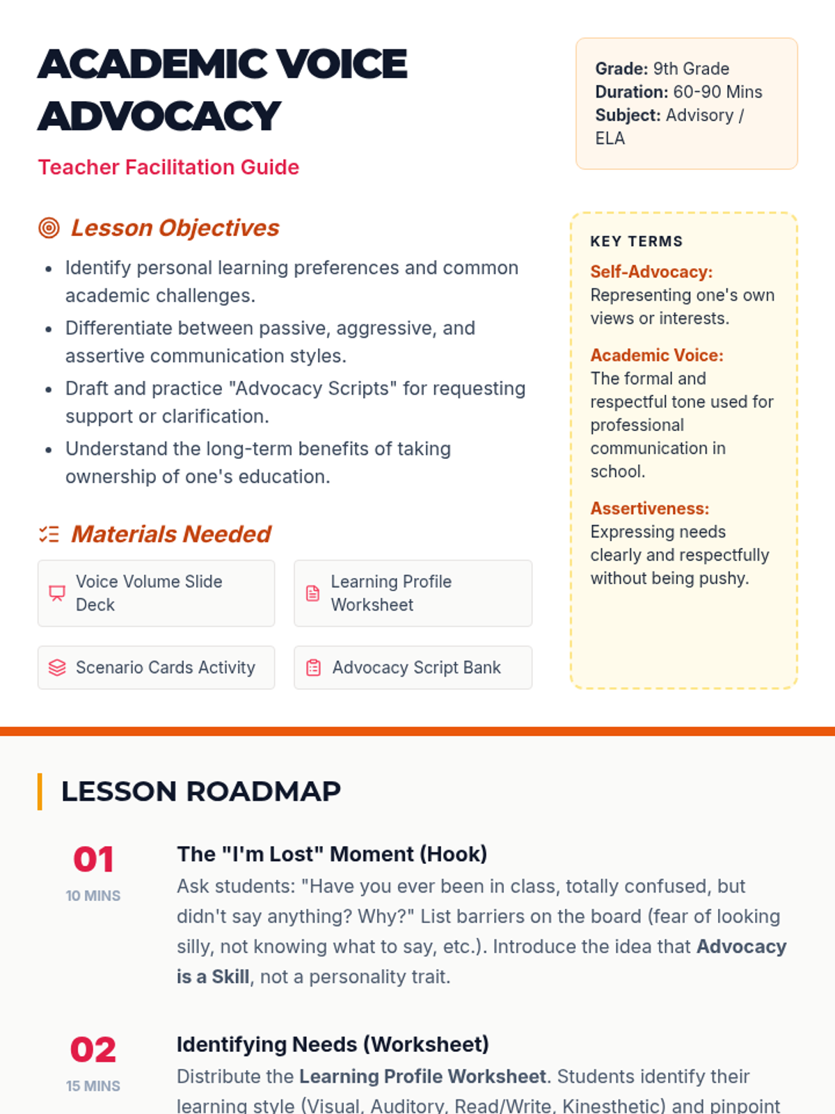 A comprehensive lesson designed to empower 9th-grade students with the communication skills and self-awareness needed to advocate for their academic needs effectively and respectfully.