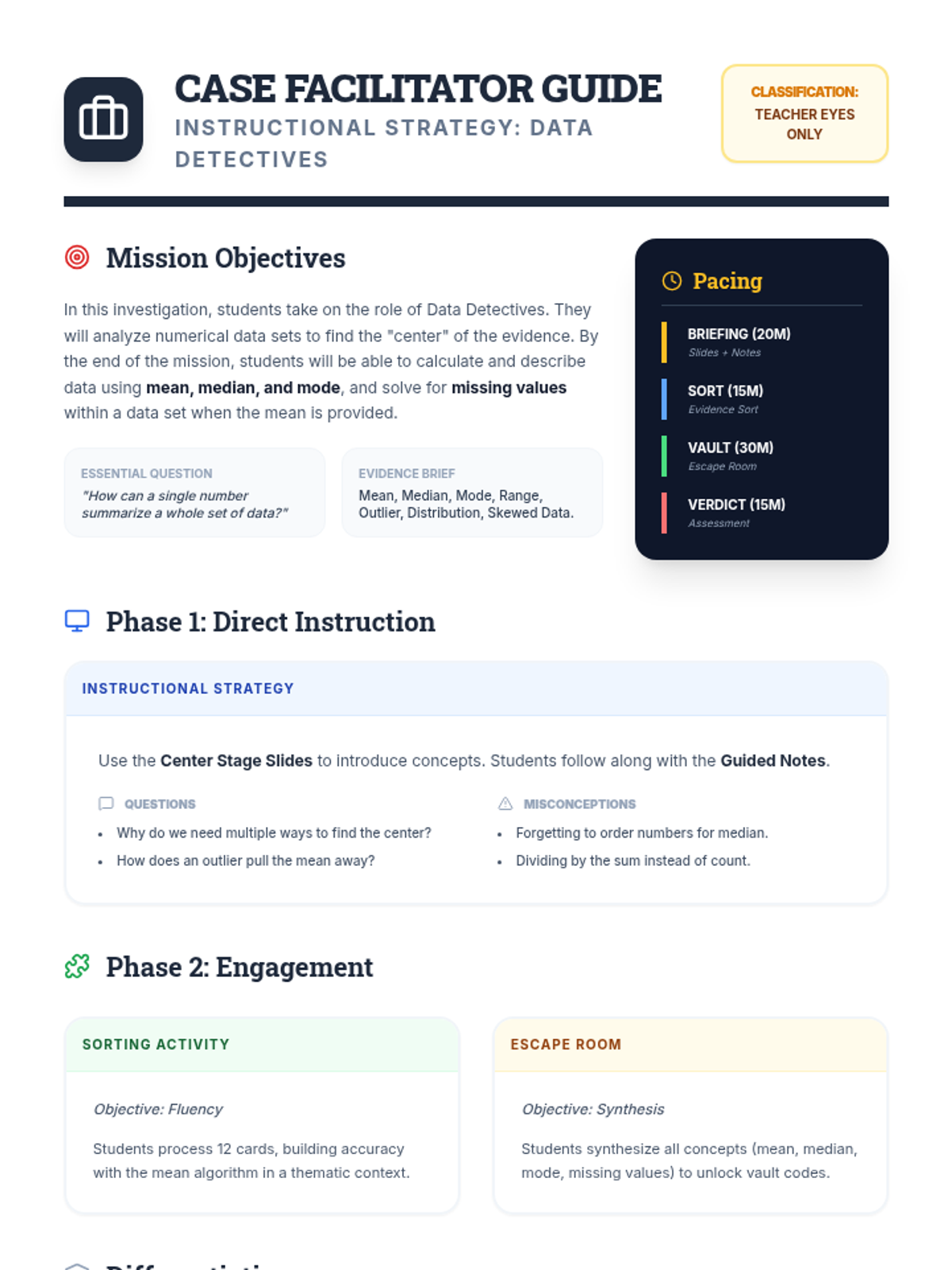 A comprehensive 7th-grade math lesson on mean, median, mode, and range, themed around a 'Data Detective' investigation. It includes differentiated materials for math, executive functioning, and reading comprehension goals.