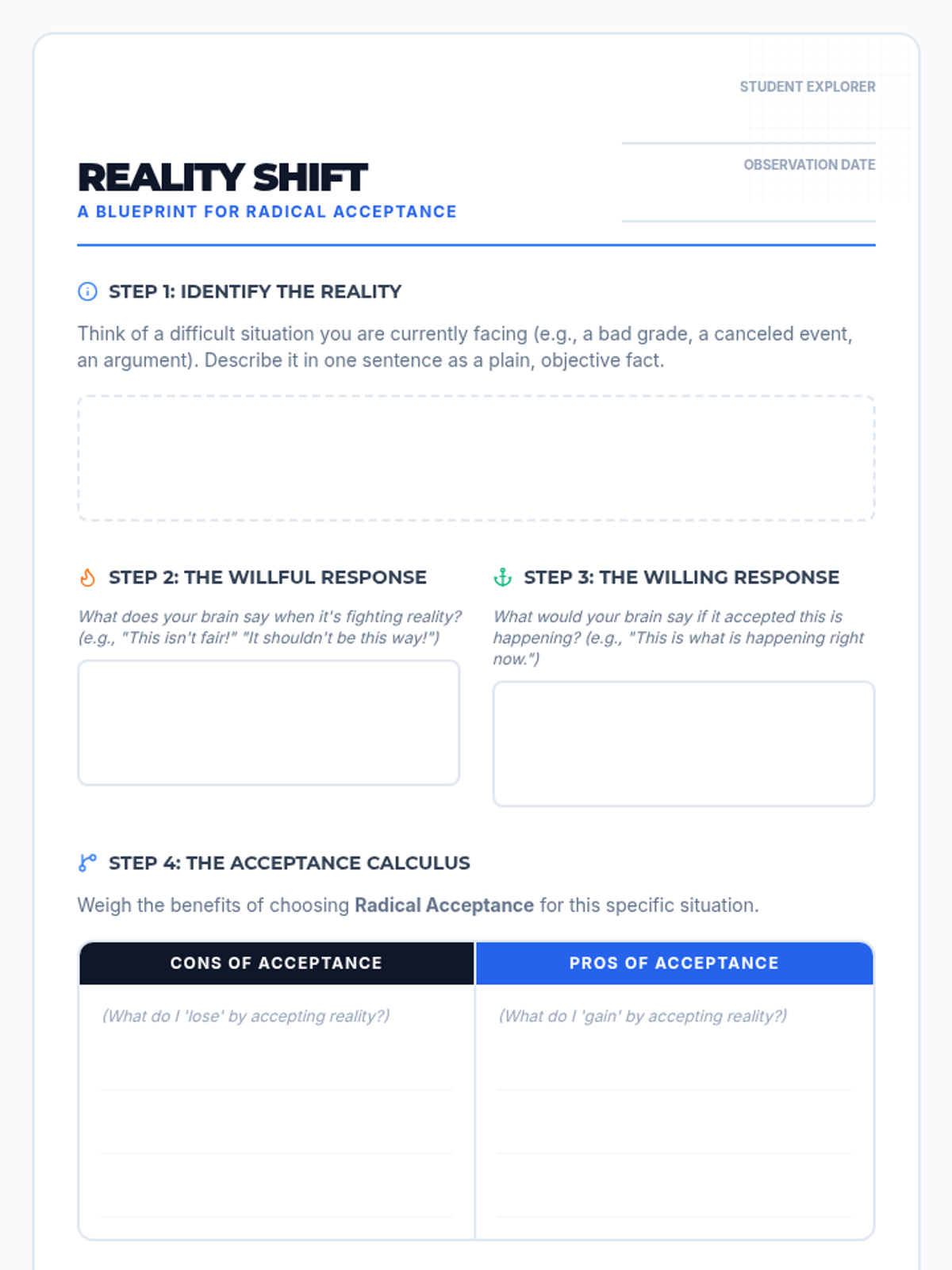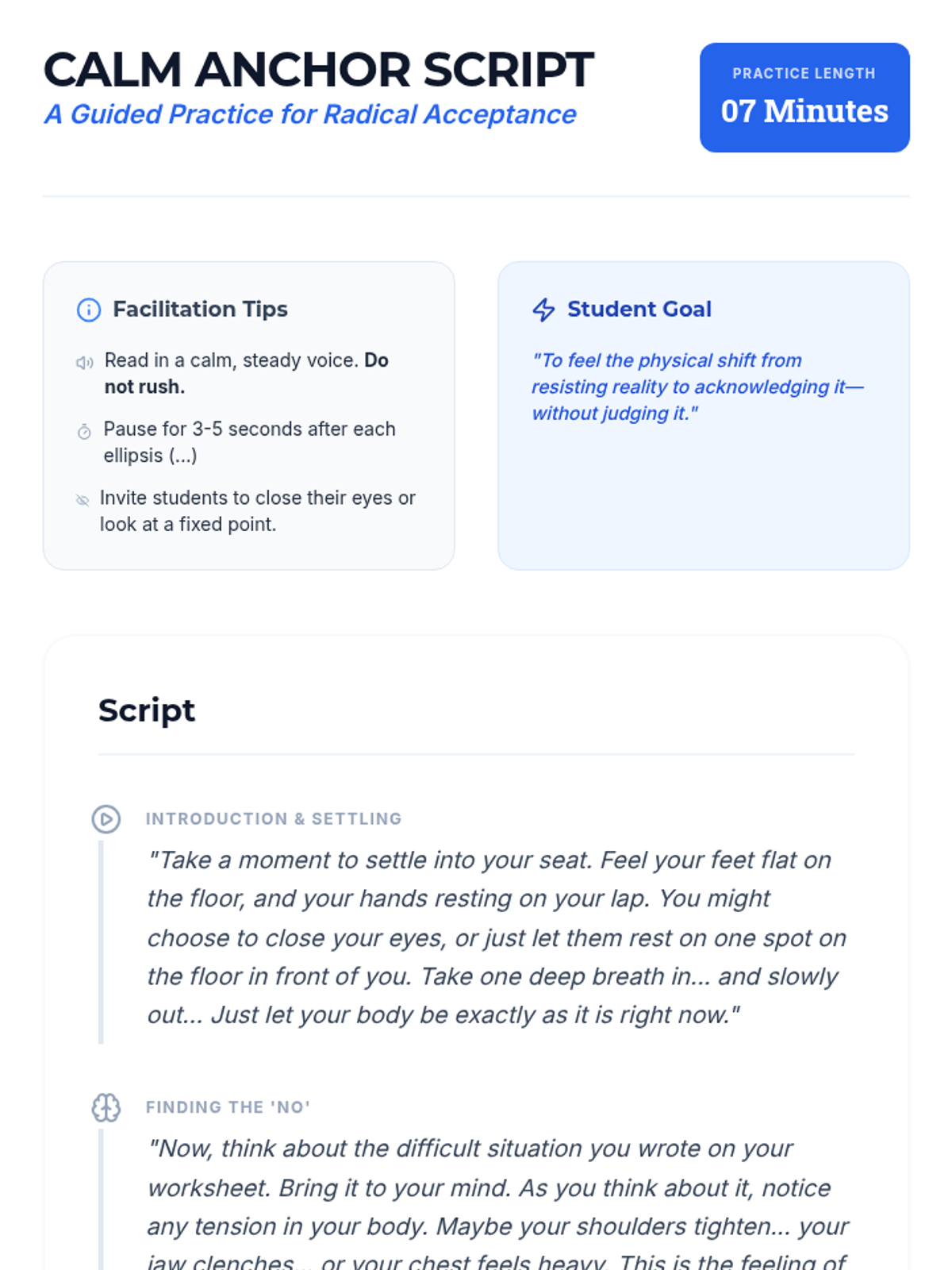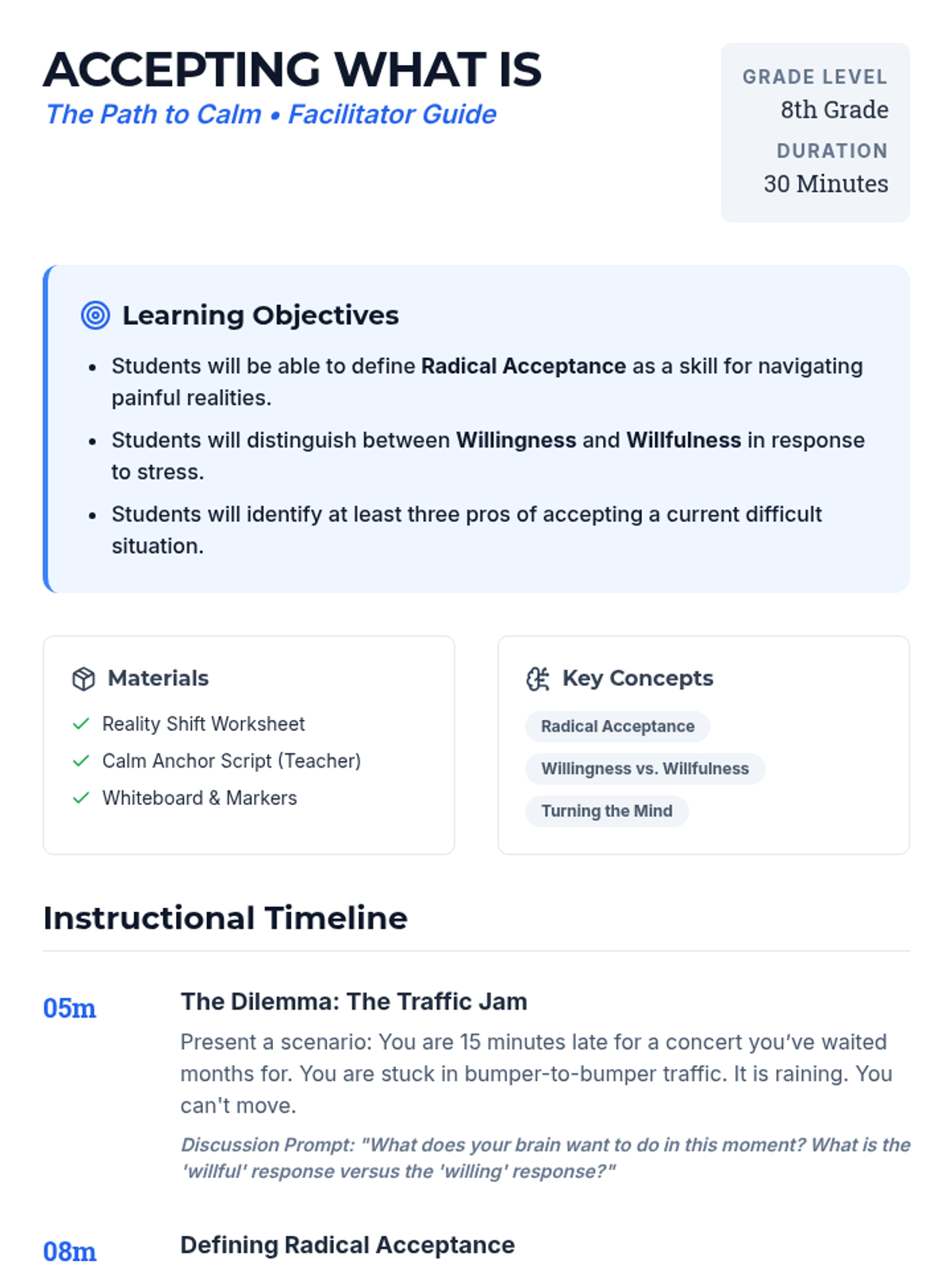 A 30-minute introductory lesson on Radical Acceptance for 8th graders, focusing on understanding reality, weighing the benefits of acceptance, and practicing 'turning the mind' toward willingness.