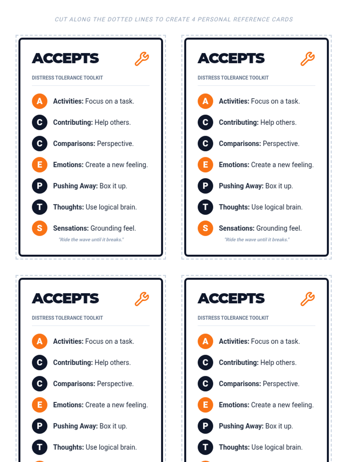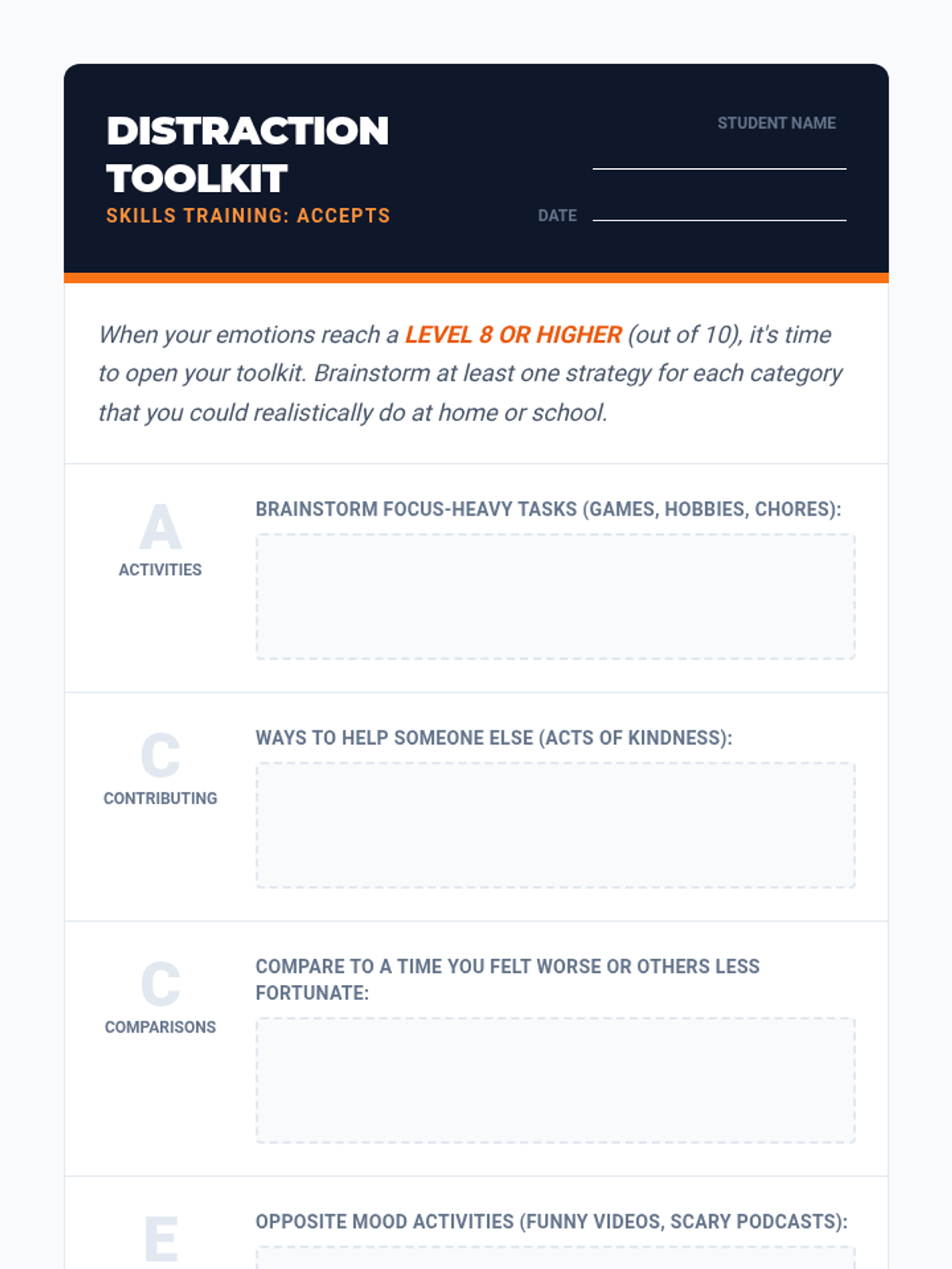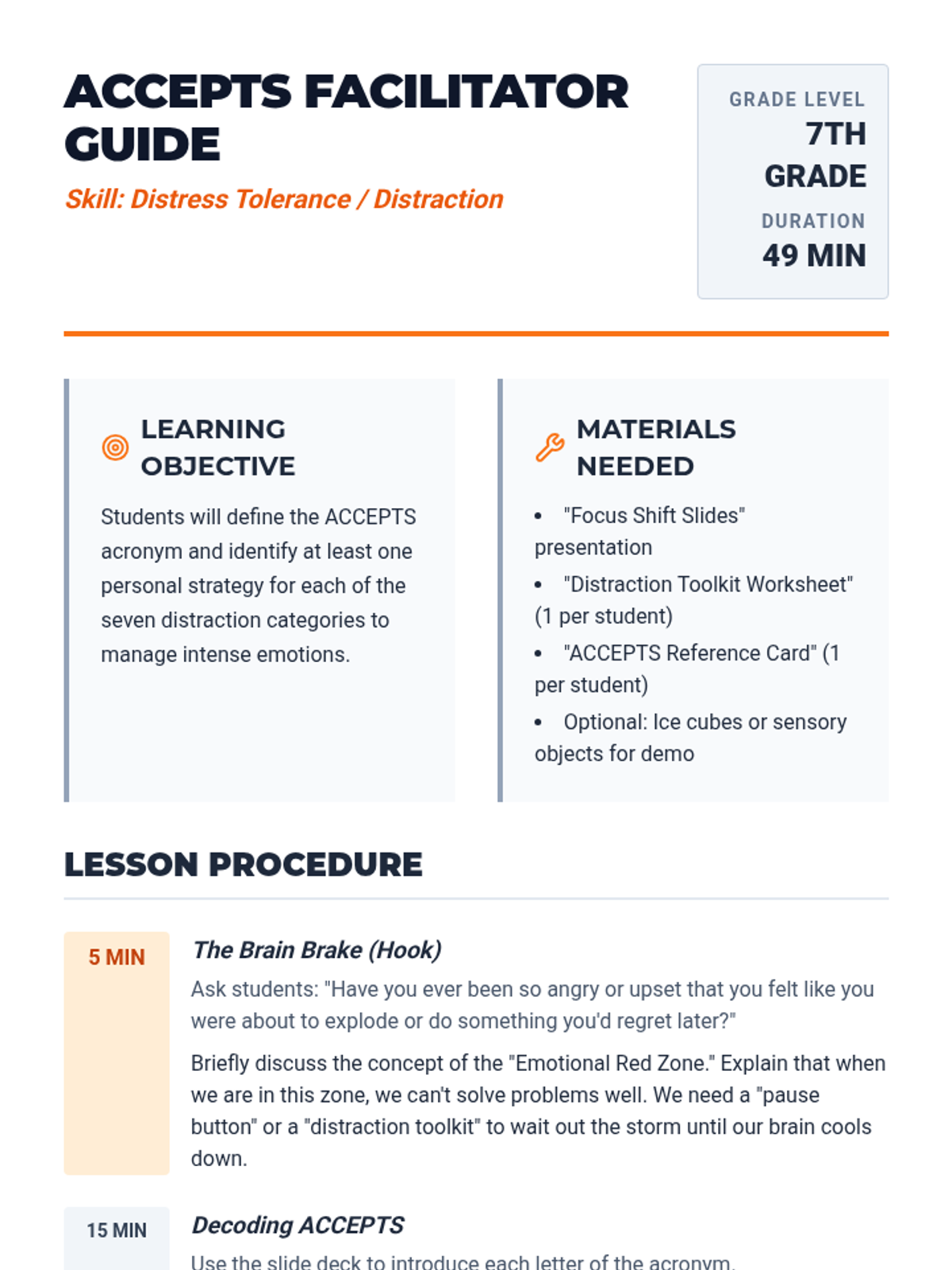 A 49-minute lesson for 7th graders on the ACCEPTS distress tolerance skill, teaching students how to use distraction to manage intense emotions healthily.