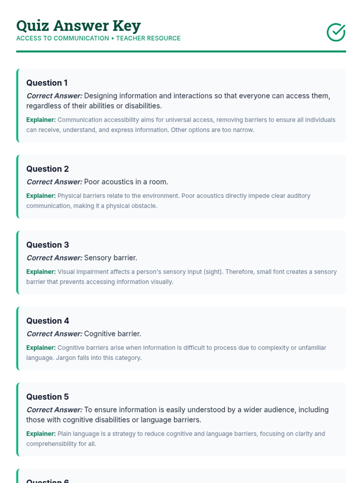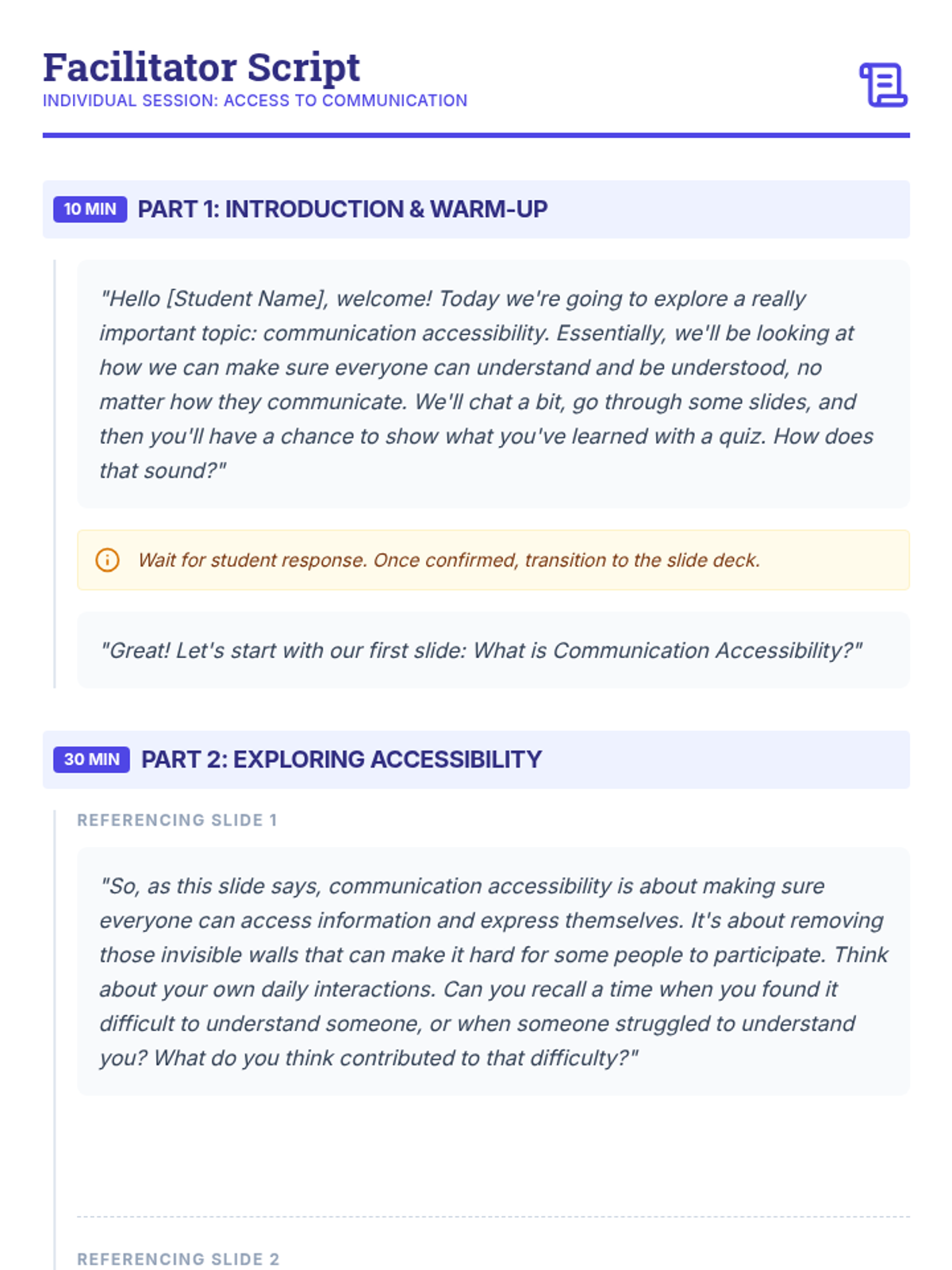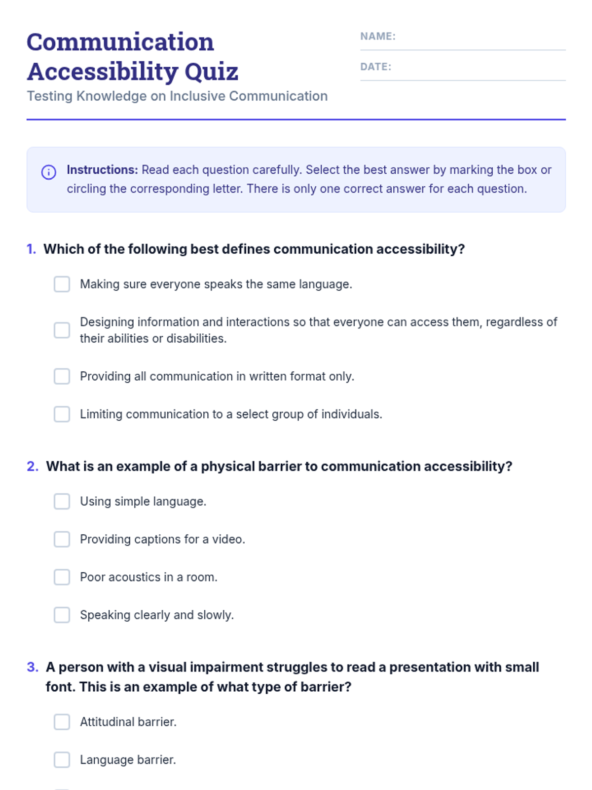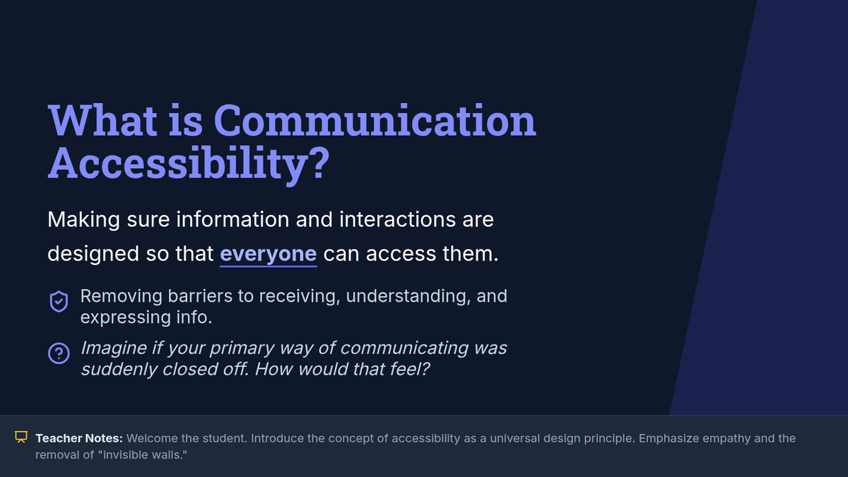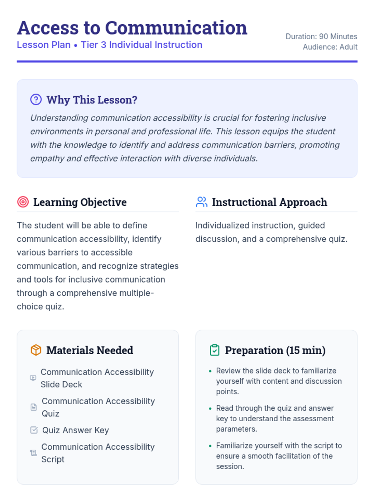 An individualized 90-minute lesson for adult students exploring the vital concept of communication accessibility, barriers, and inclusive strategies.