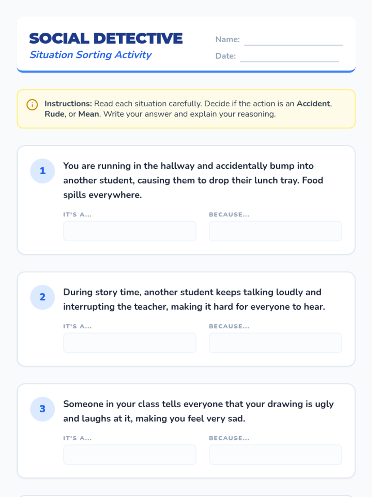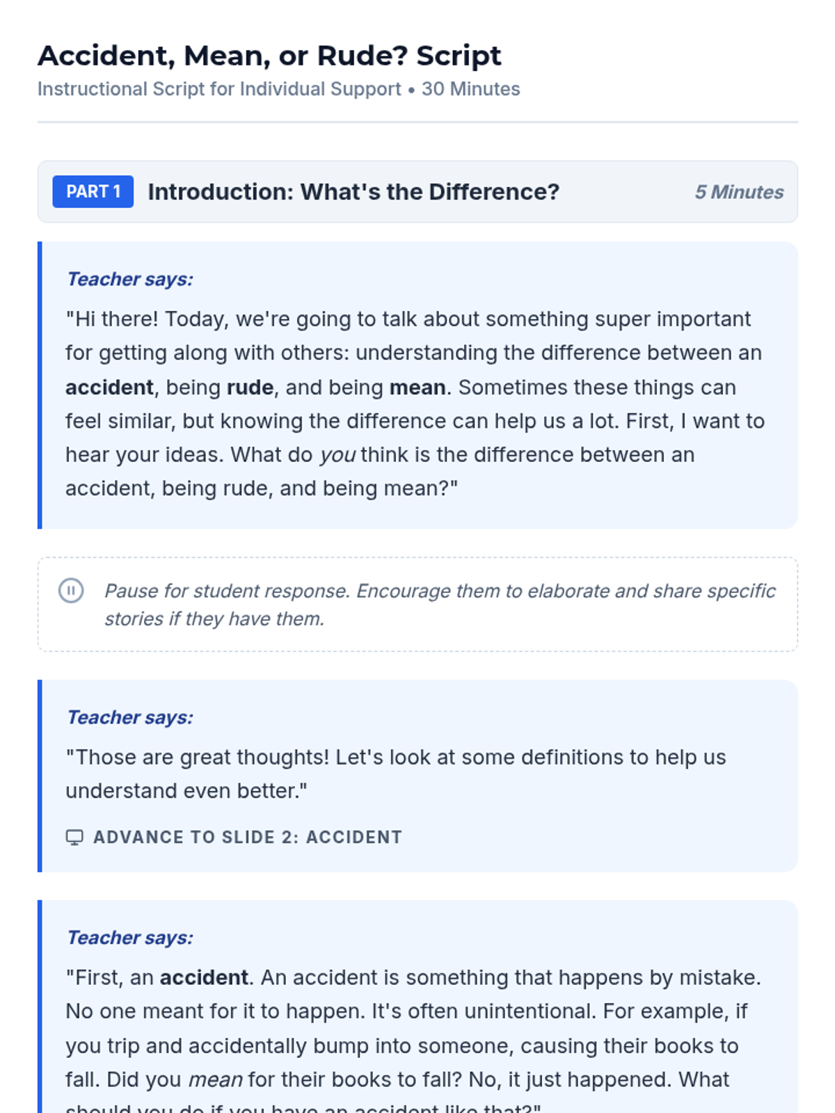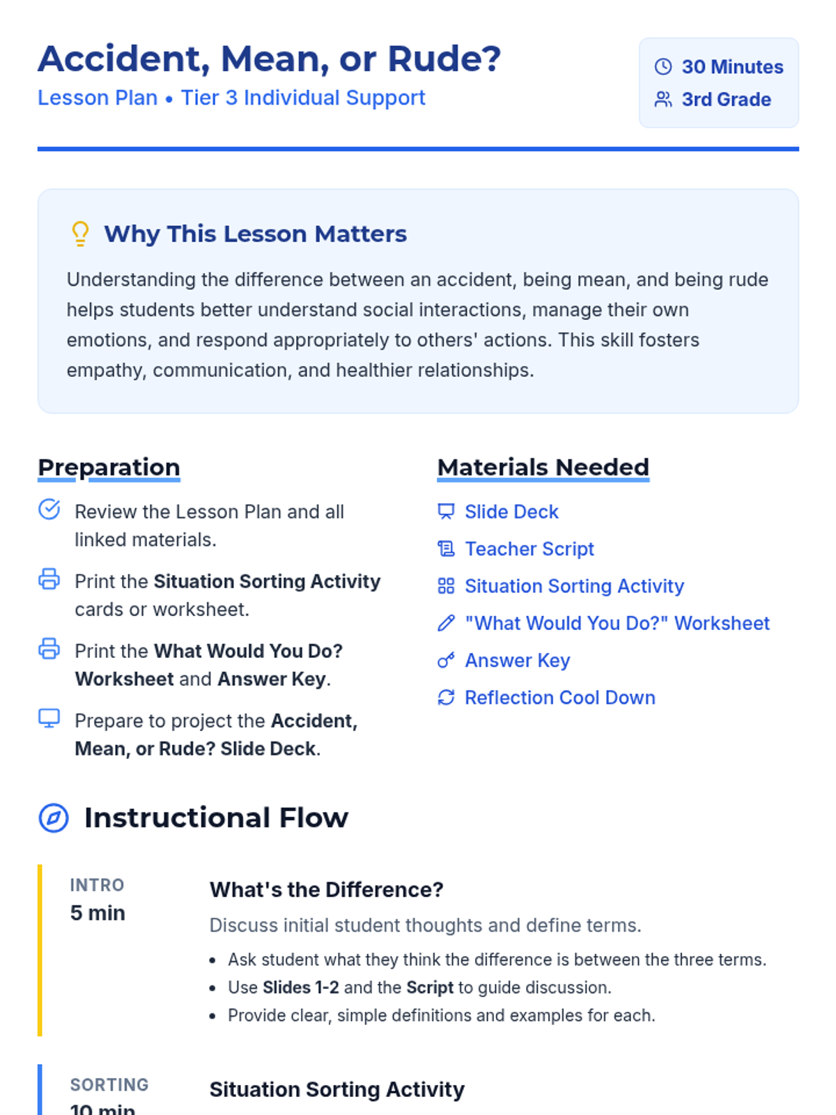 A 30-minute individual lesson for 3rd graders to help them differentiate between accidental actions, rude behavior, and mean behavior to develop social-emotional intelligence.