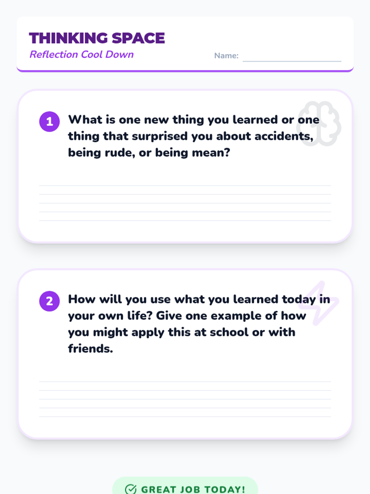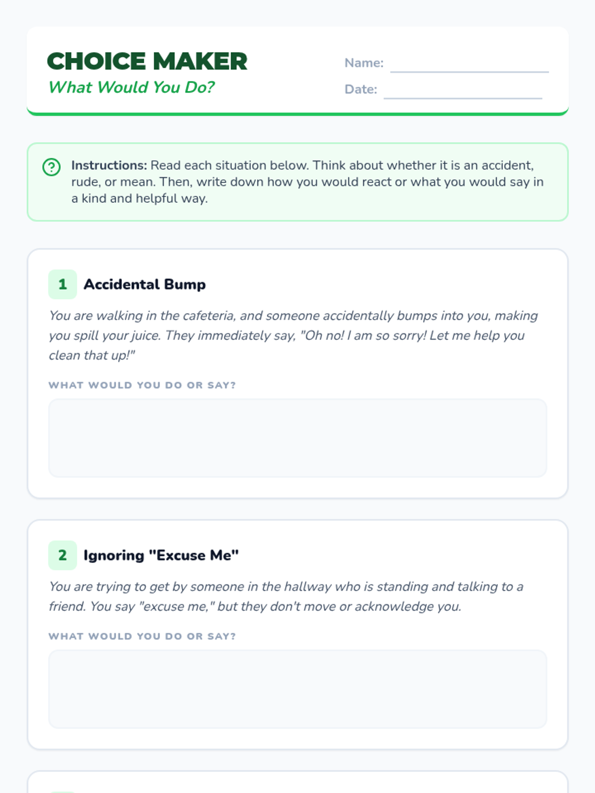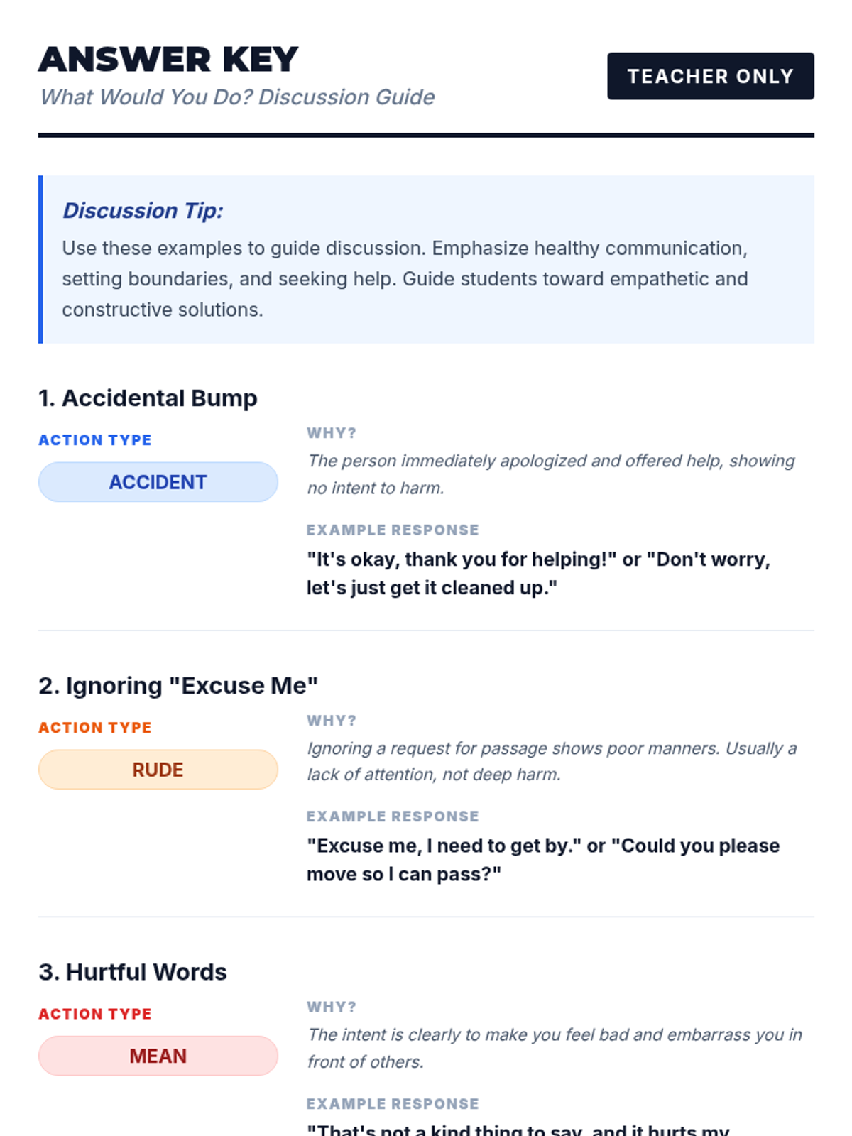 A 30-minute individual lesson for 3rd graders to help them differentiate between accidental actions, rude behavior, and mean behavior to develop social-emotional intelligence.