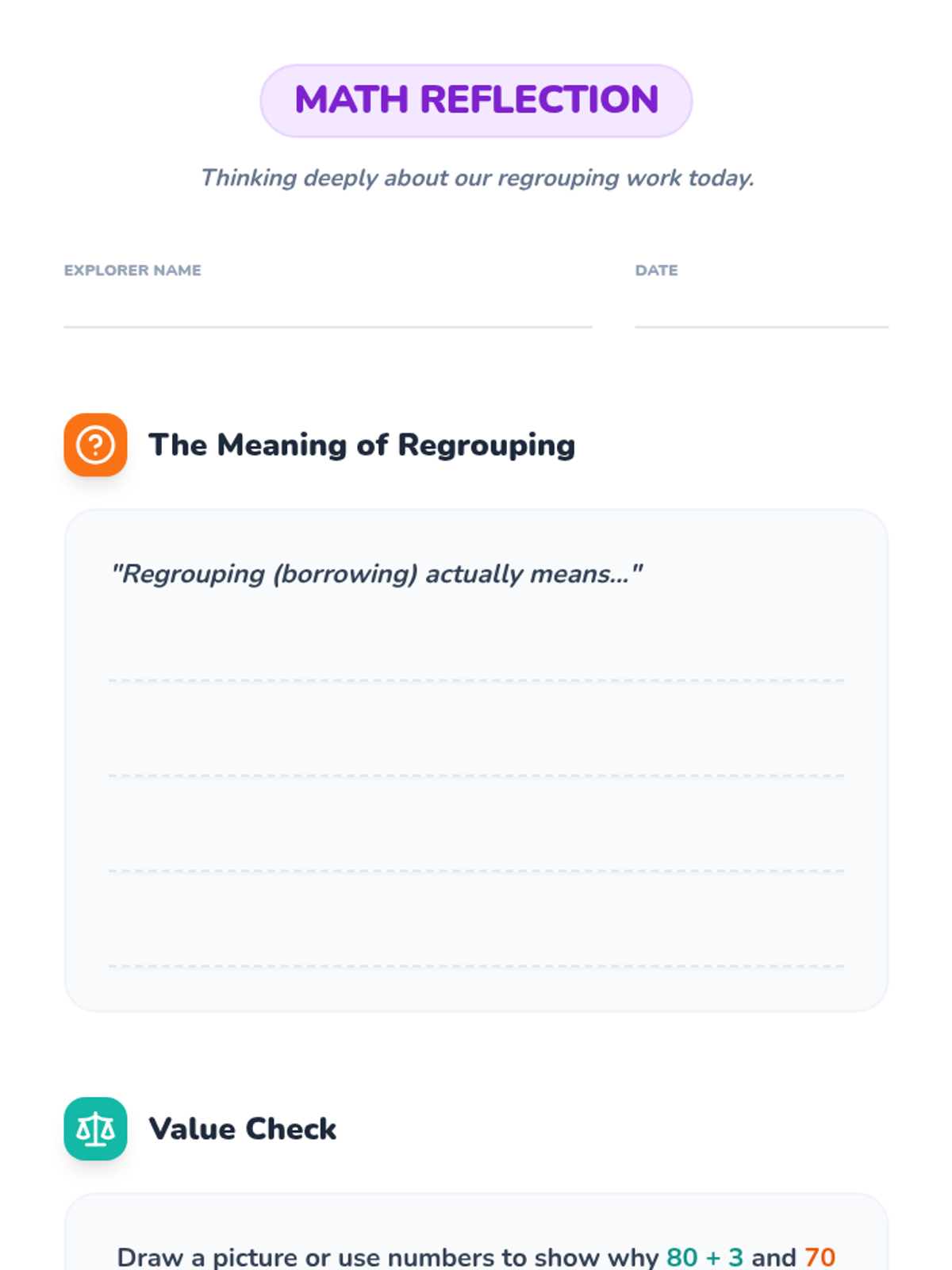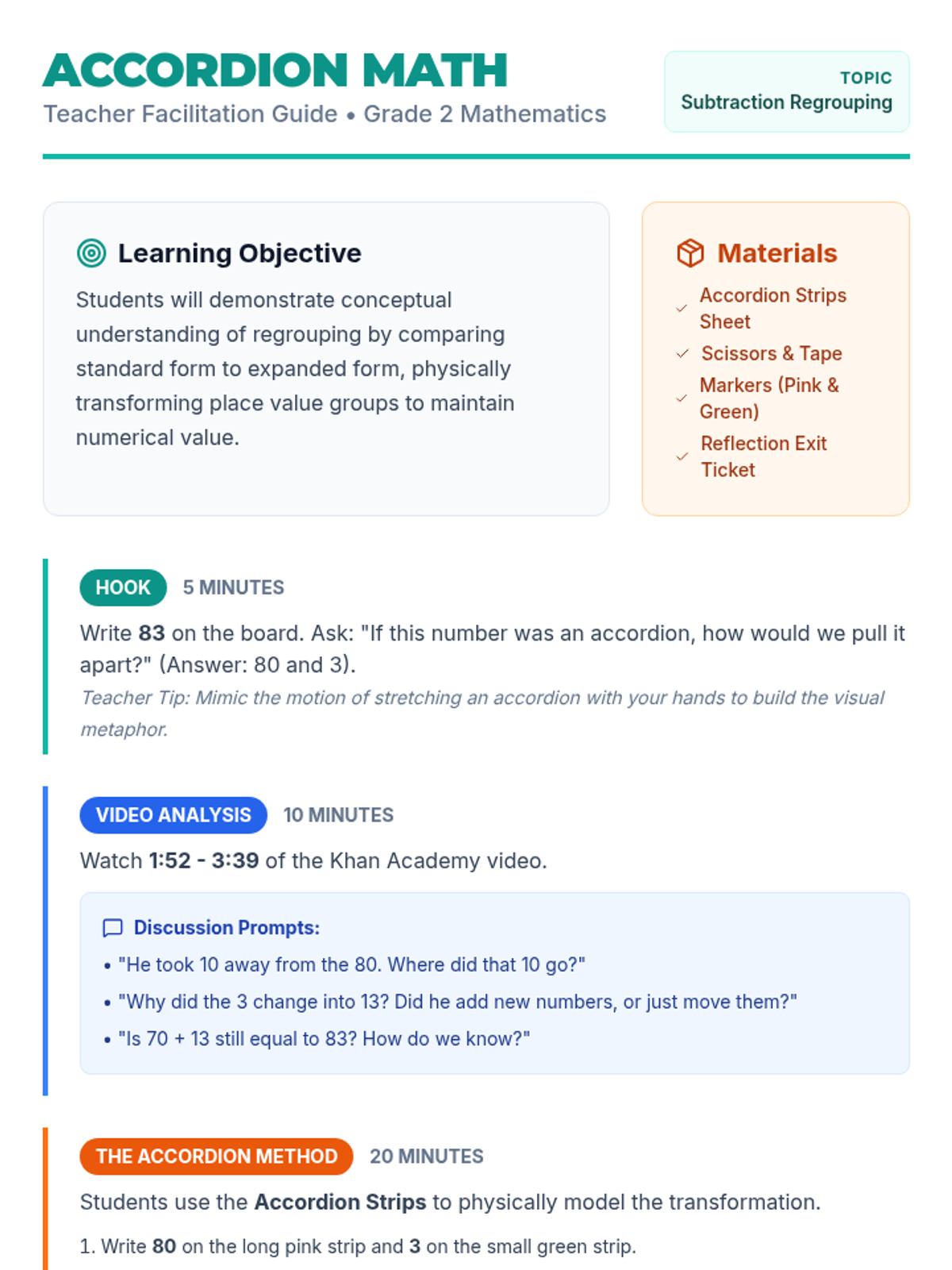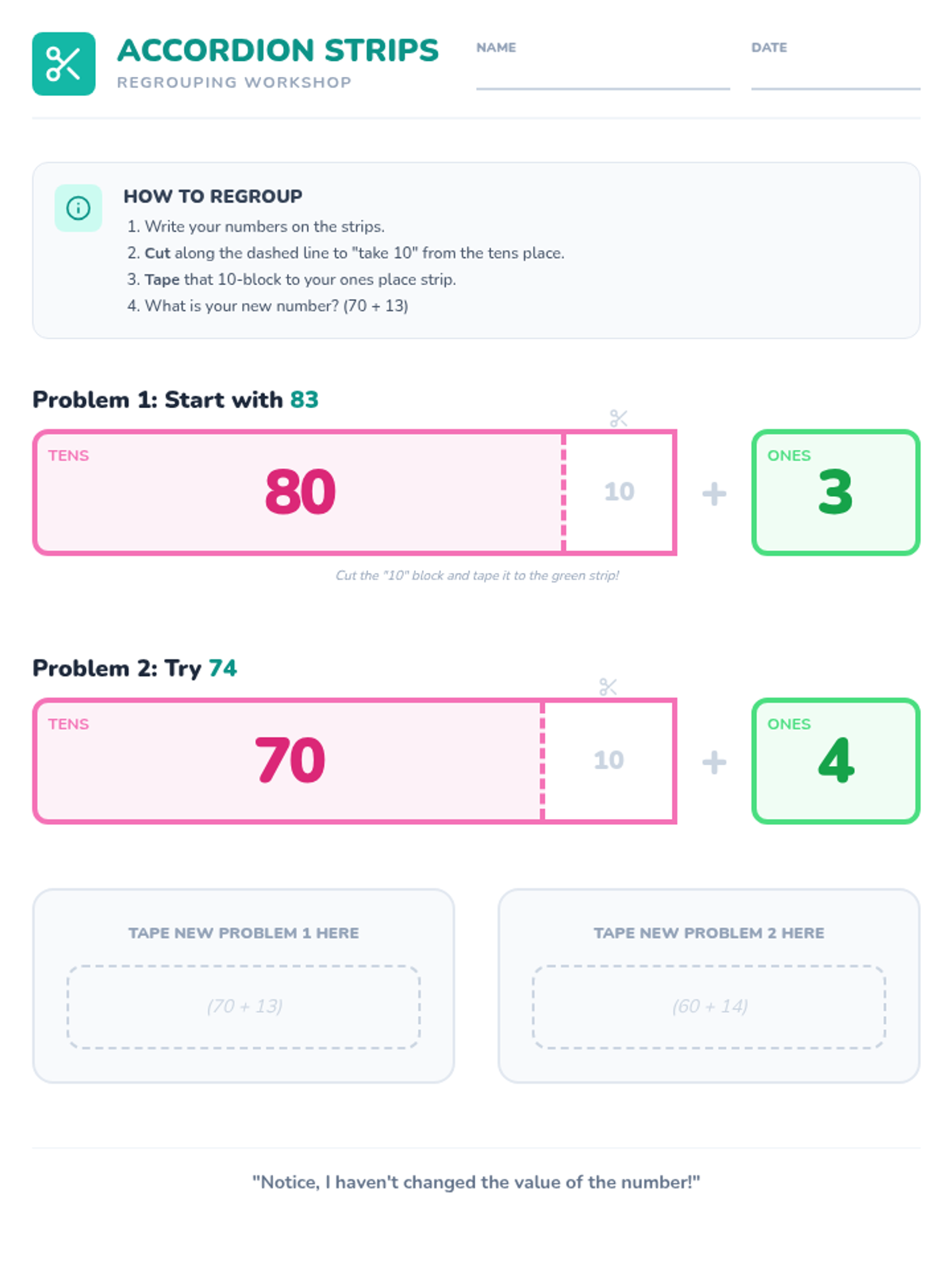 Students explore the conceptual basis of regrouping by using 'Accordion Strips' to transform numbers in expanded form (e.g., 80 + 3 becomes 70 + 13), bridging the gap between standard algorithms and place value understanding.