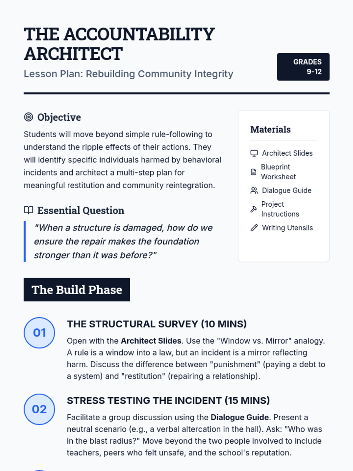 A comprehensive restorative justice workshop for high school students and leaders to move from rule-breaking to community-building. Students learn to analyze the impact of behavioral incidents and draft actionable blueprints for restitution.