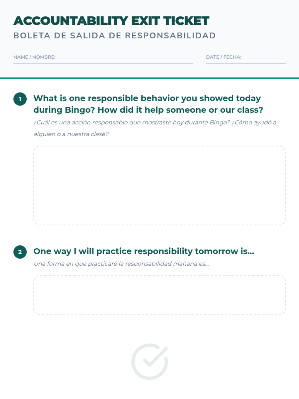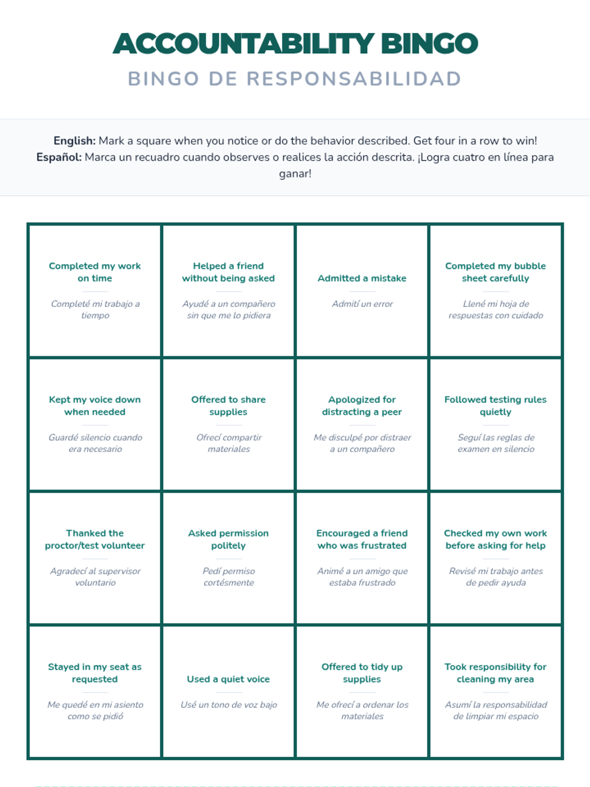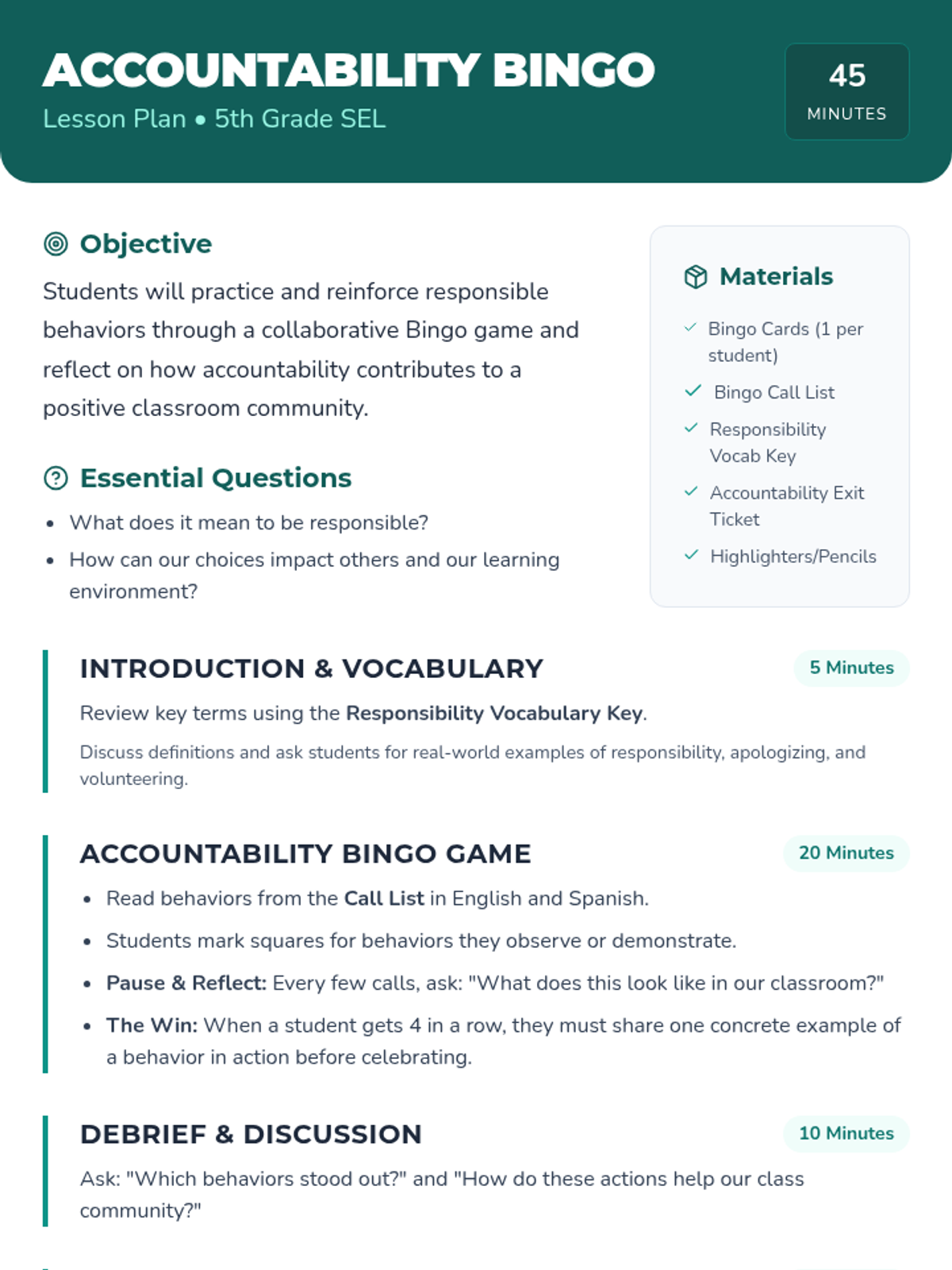 Students practice and reinforce responsible behaviors through a collaborative Bingo game and reflect on how accountability contributes to a positive classroom community.