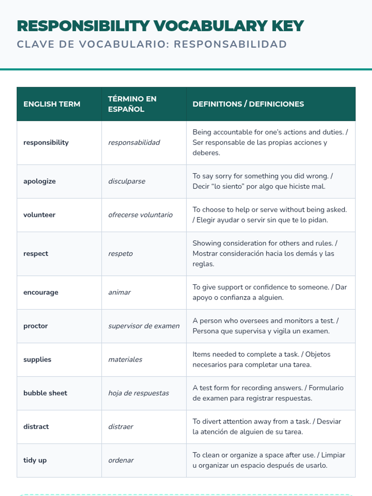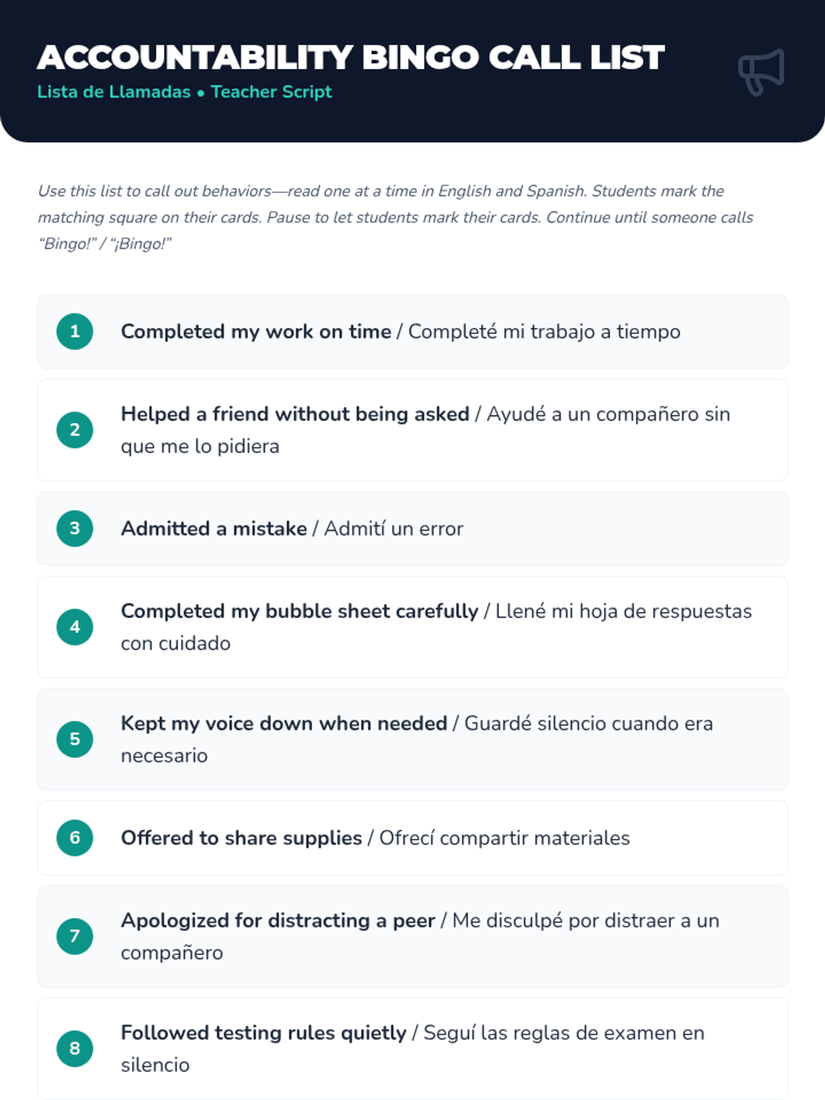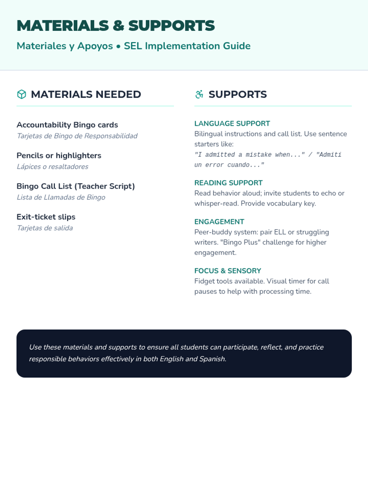 Students practice and reinforce responsible behaviors through a collaborative Bingo game and reflect on how accountability contributes to a positive classroom community.
