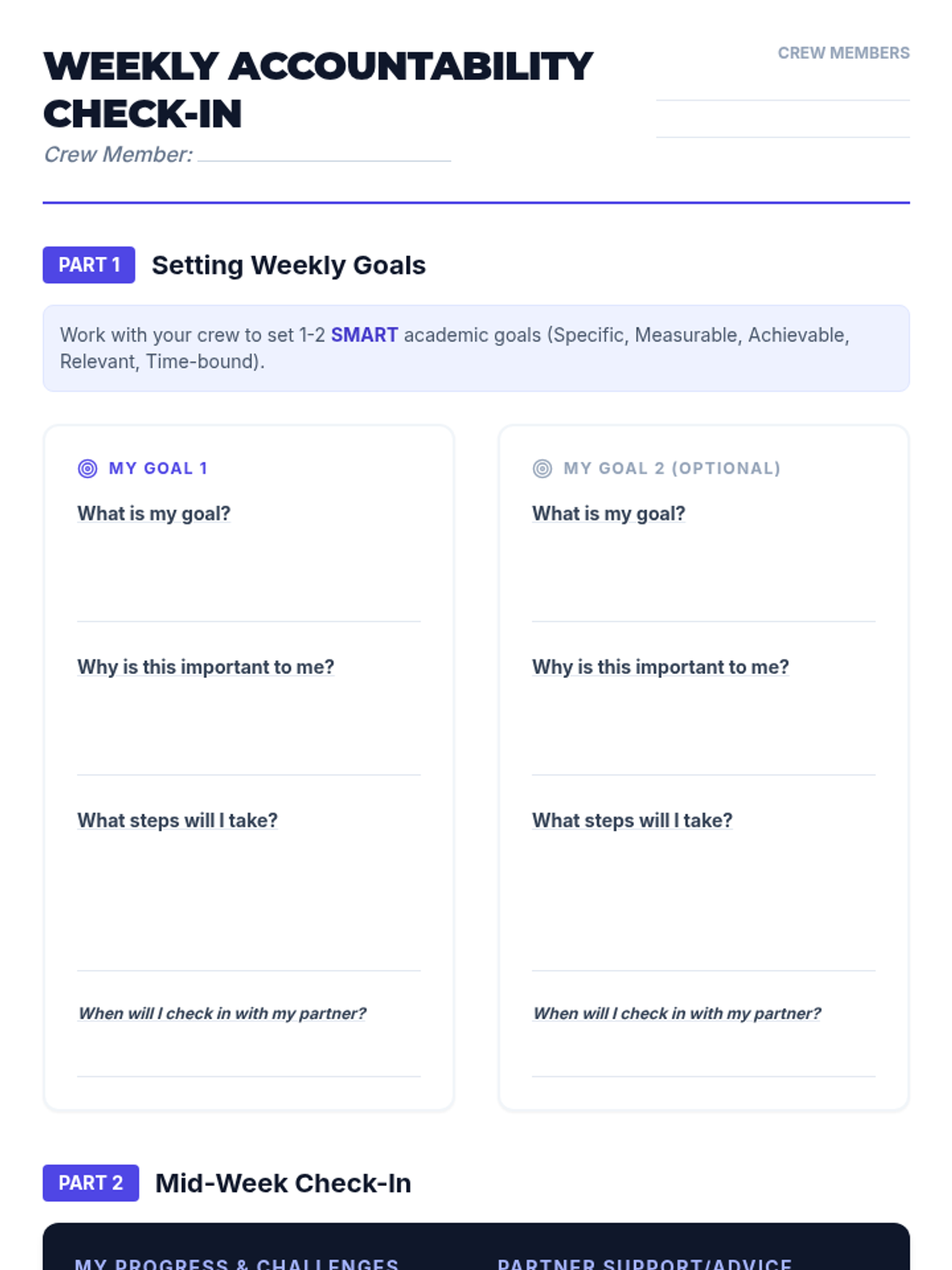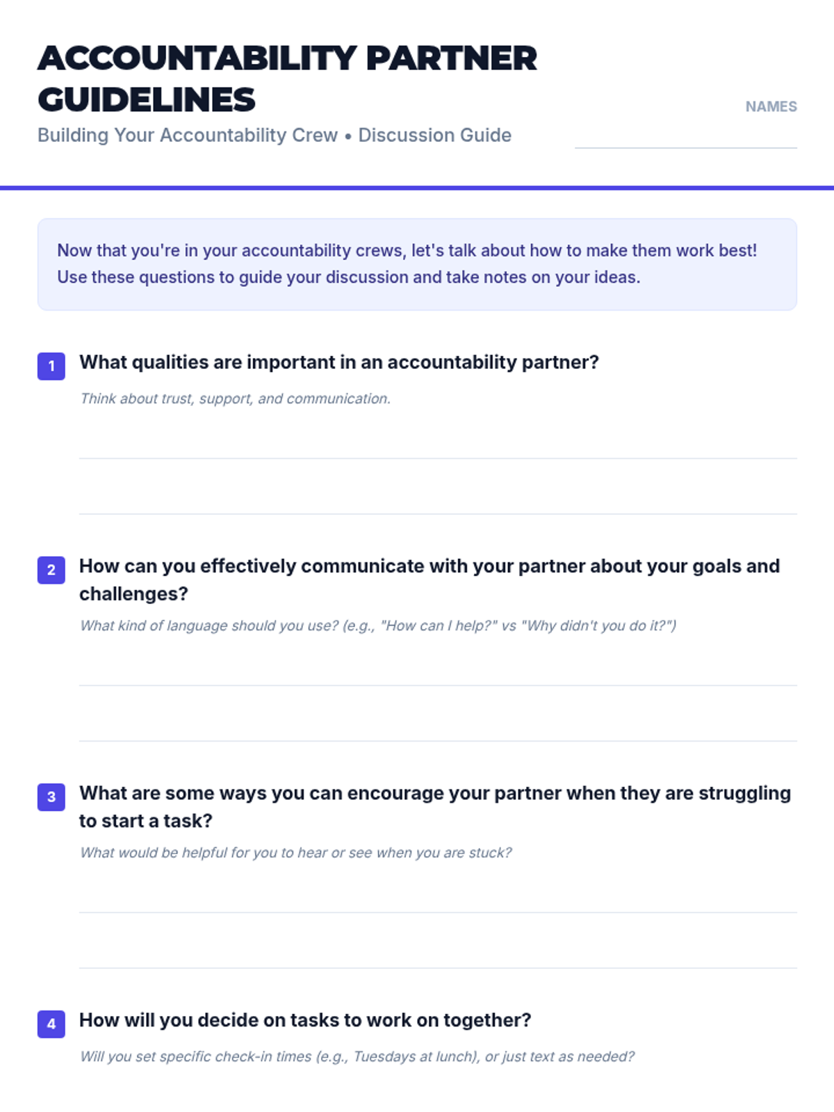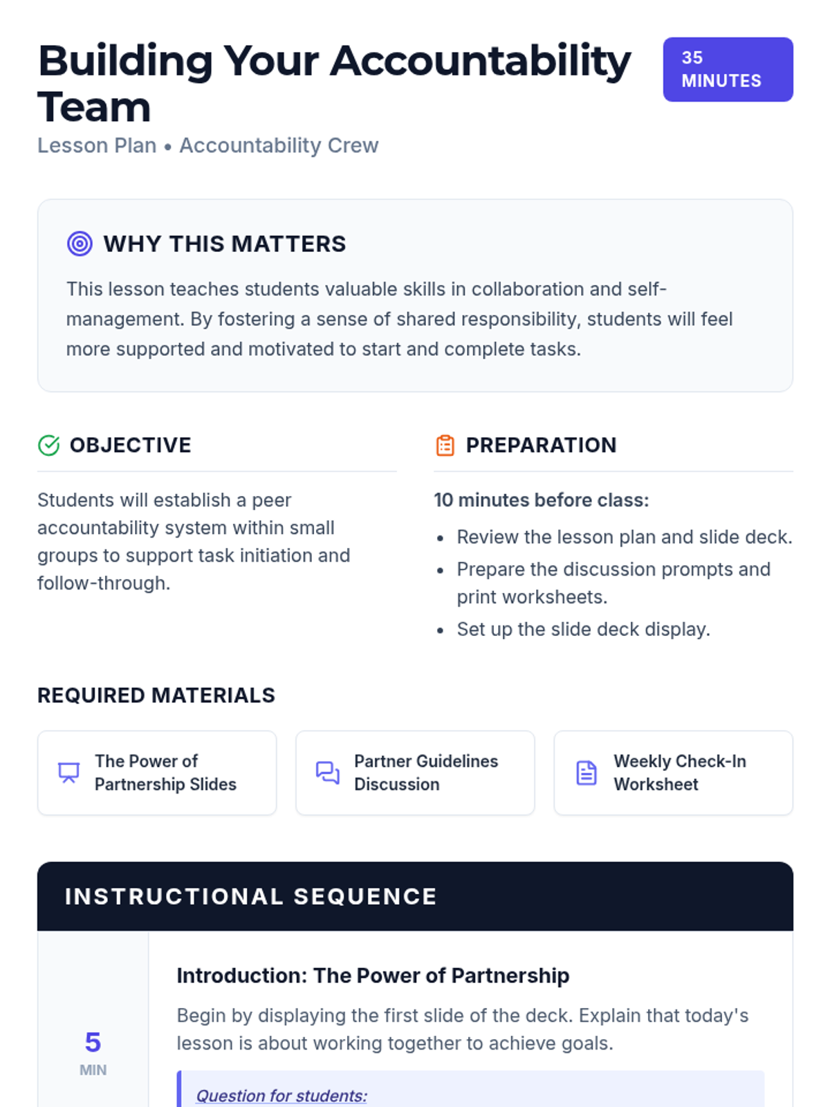 A Tier 2 small group lesson for 9th graders focused on establishing peer accountability systems to improve task initiation and follow-through. Students learn the benefits of partnership and set structured goals with their 'Accountability Crew'.
