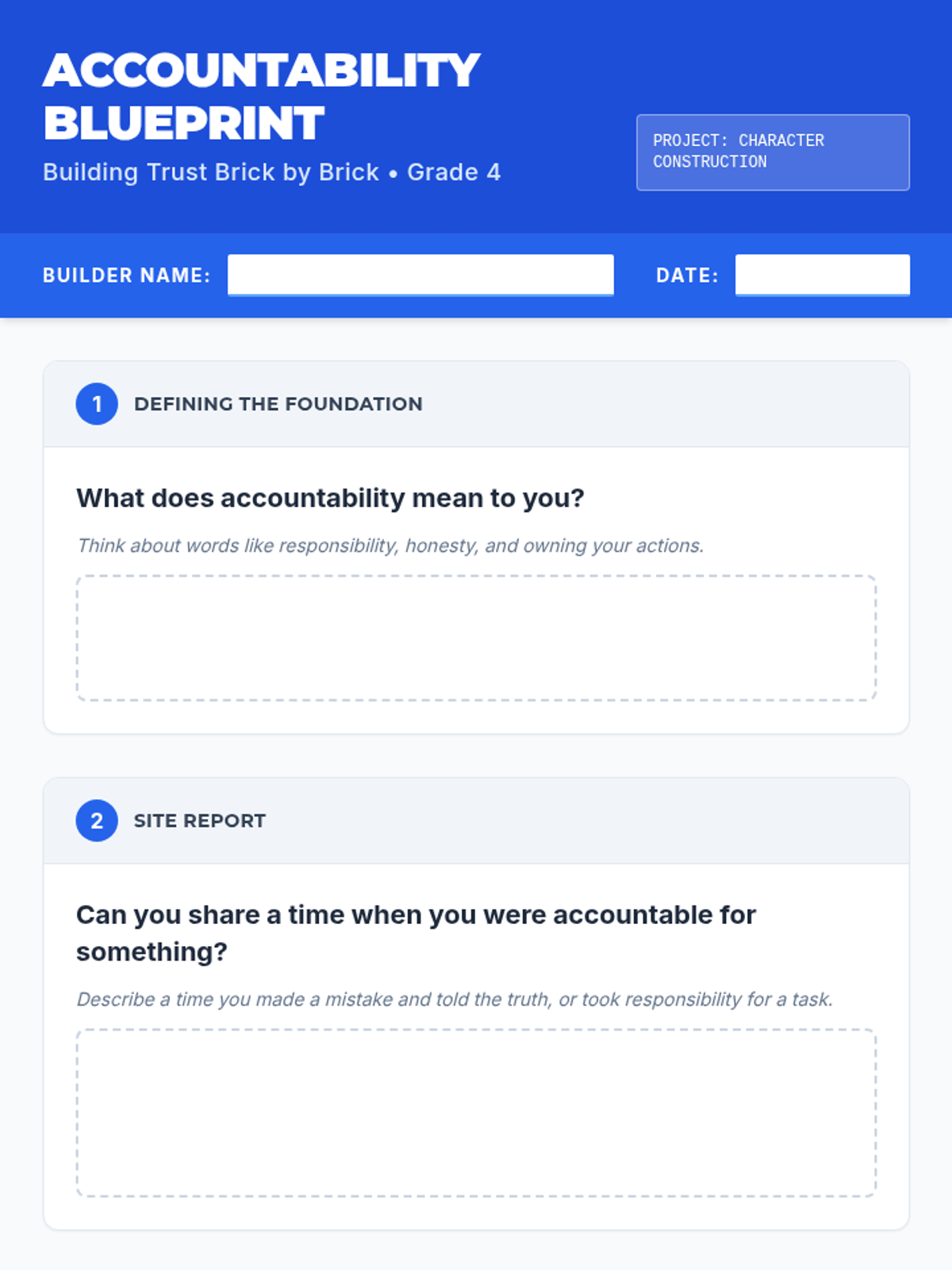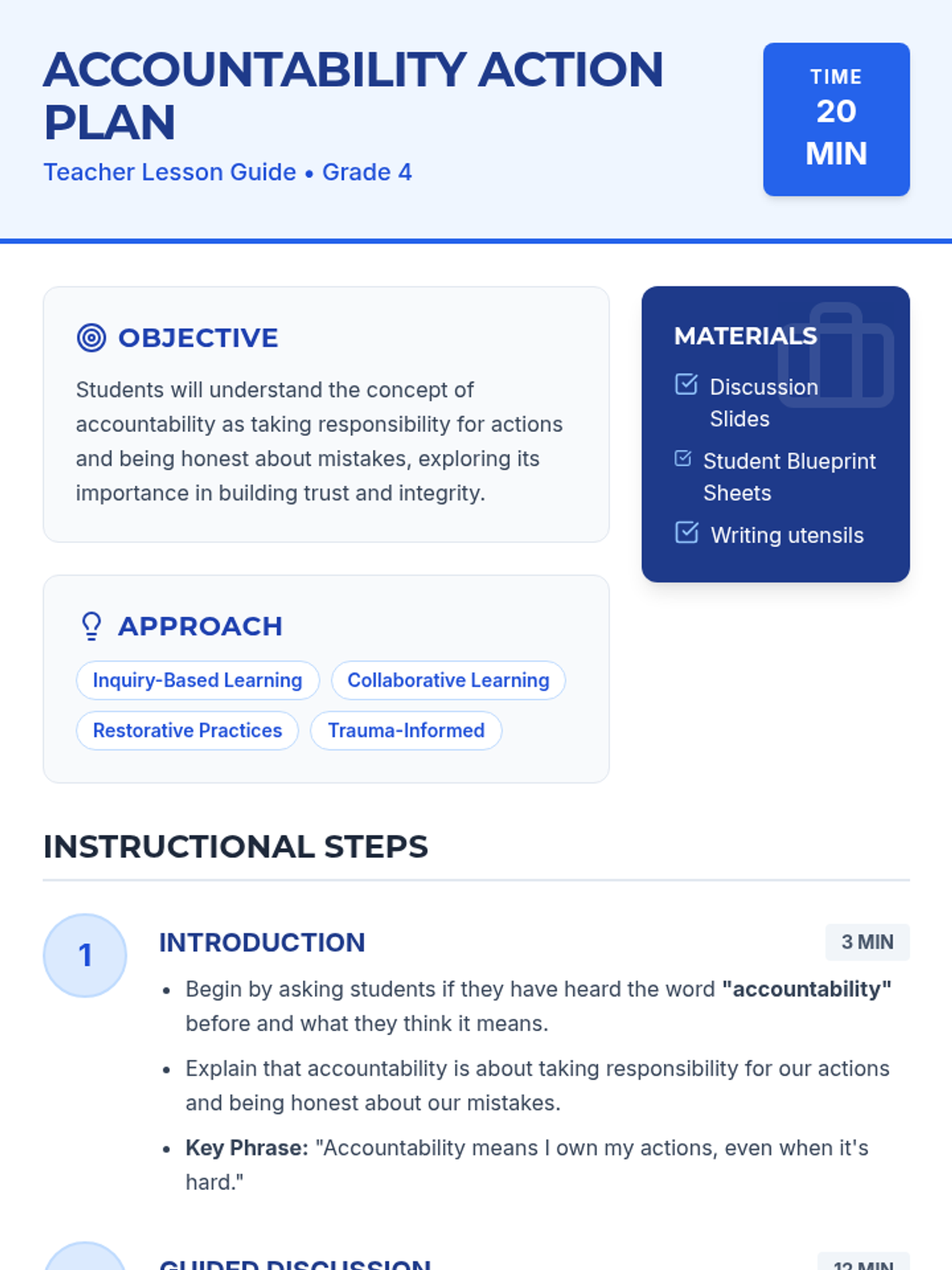 A 20-minute Tier 1 lesson for 4th graders that explores accountability through inquiry-based discussion, helping students build integrity and responsibility.