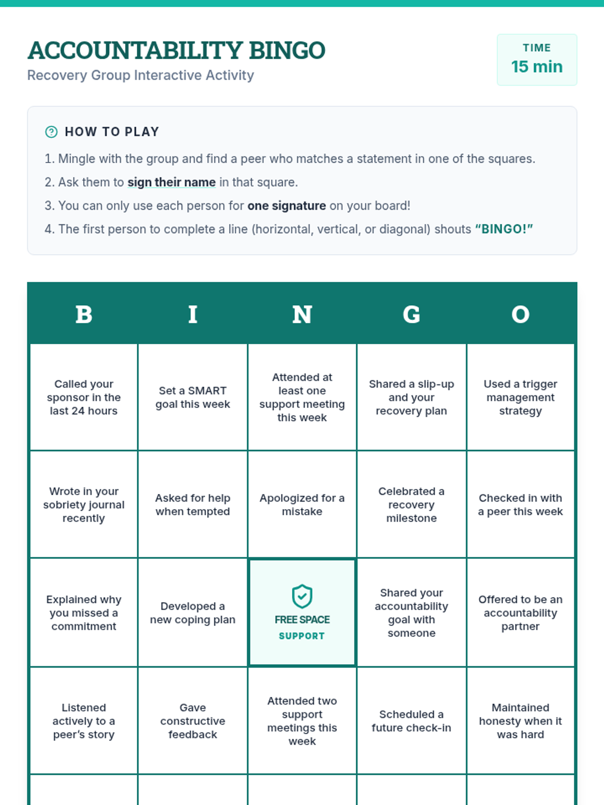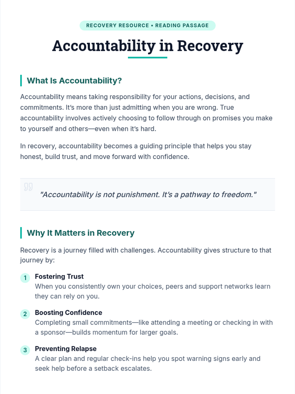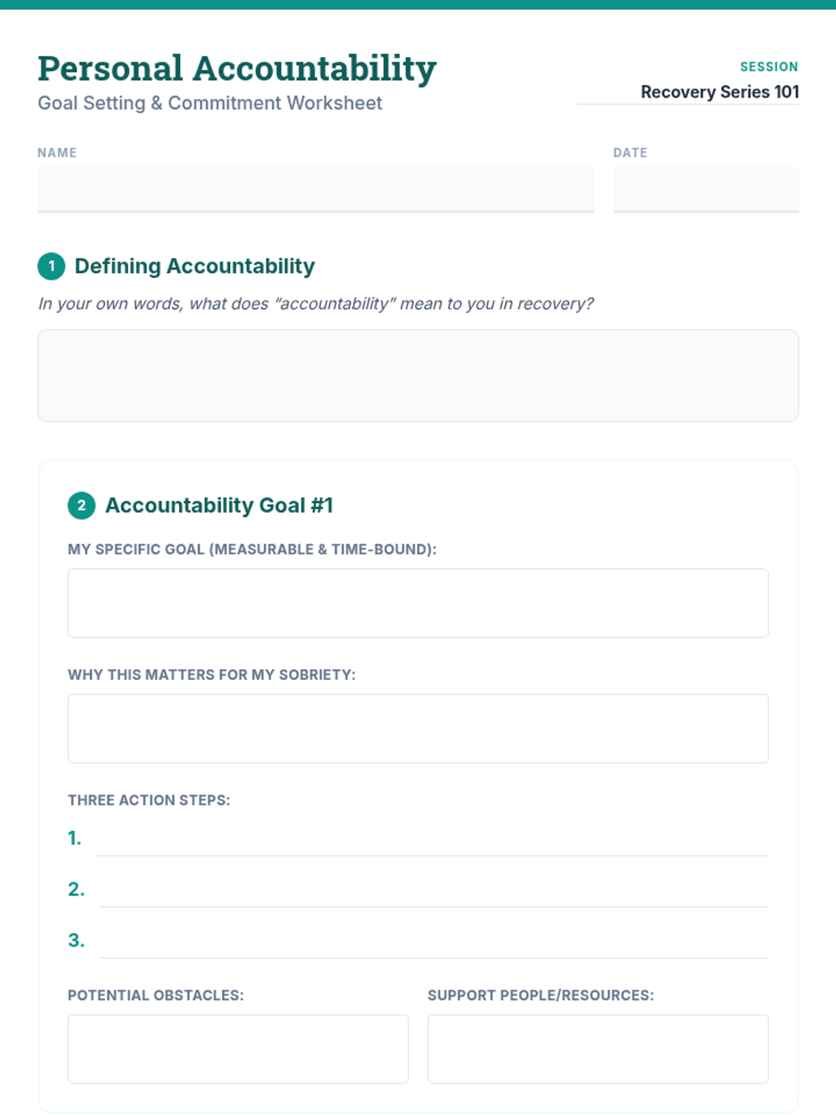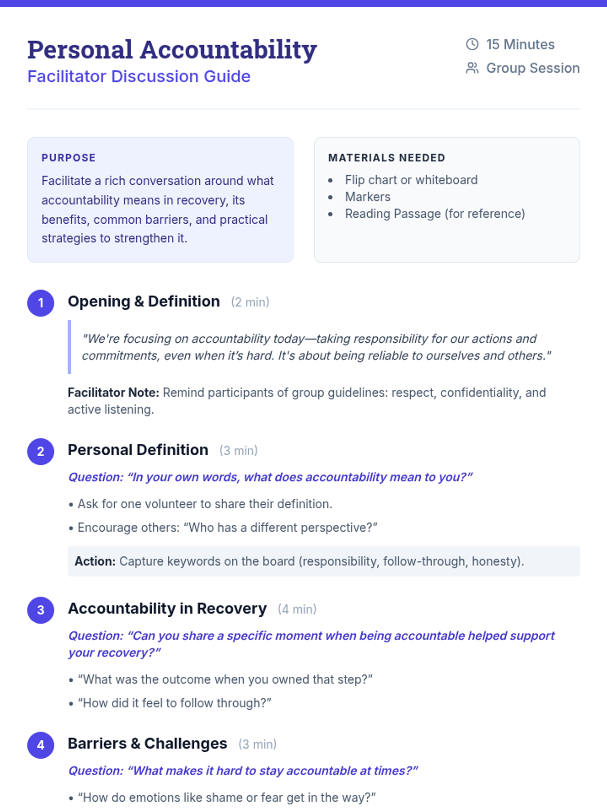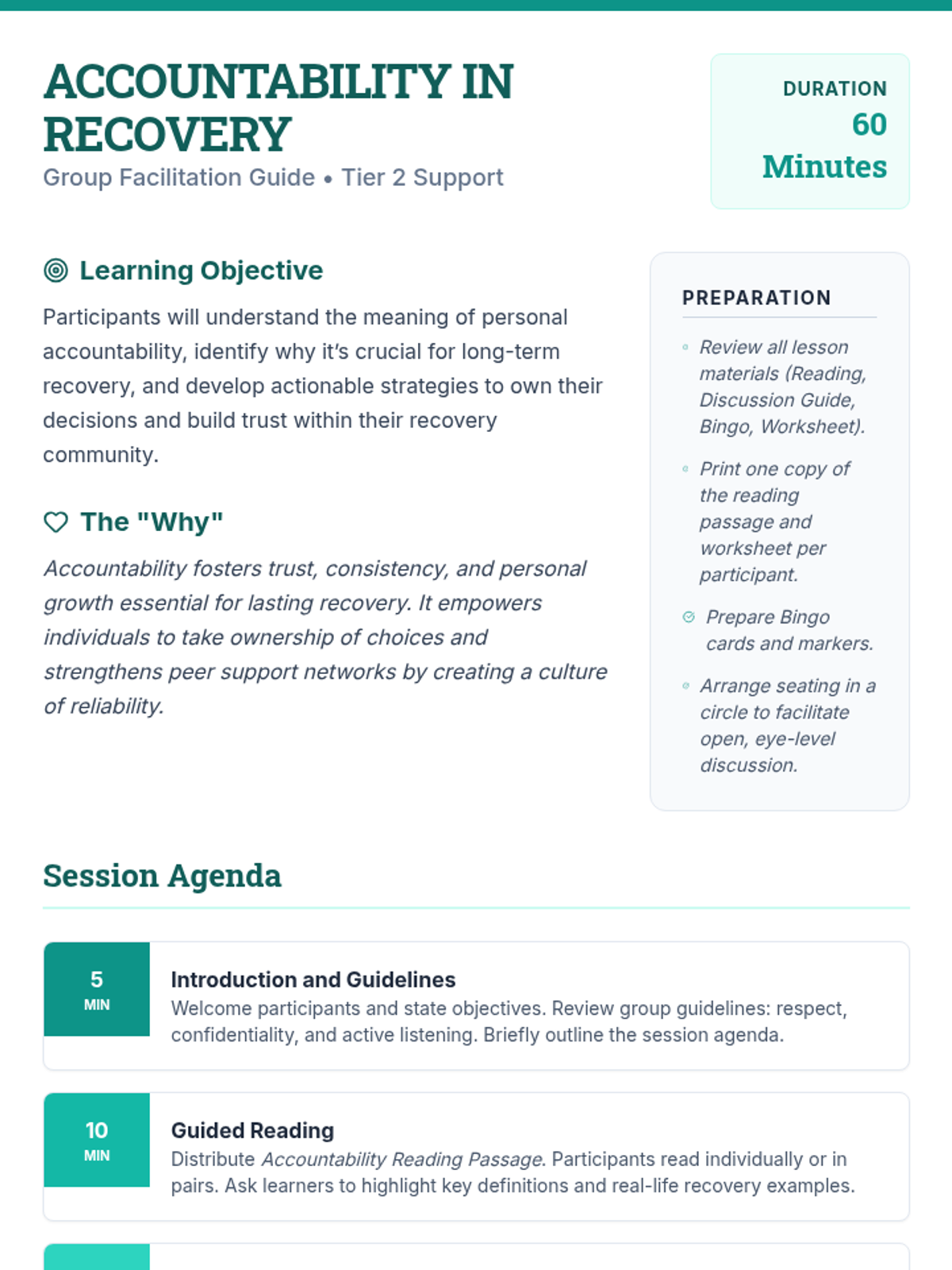 A 60-minute group session for adults in substance use recovery focused on defining personal accountability, identifying its role in sobriety, and developing actionable strategies to build trust and consistency.