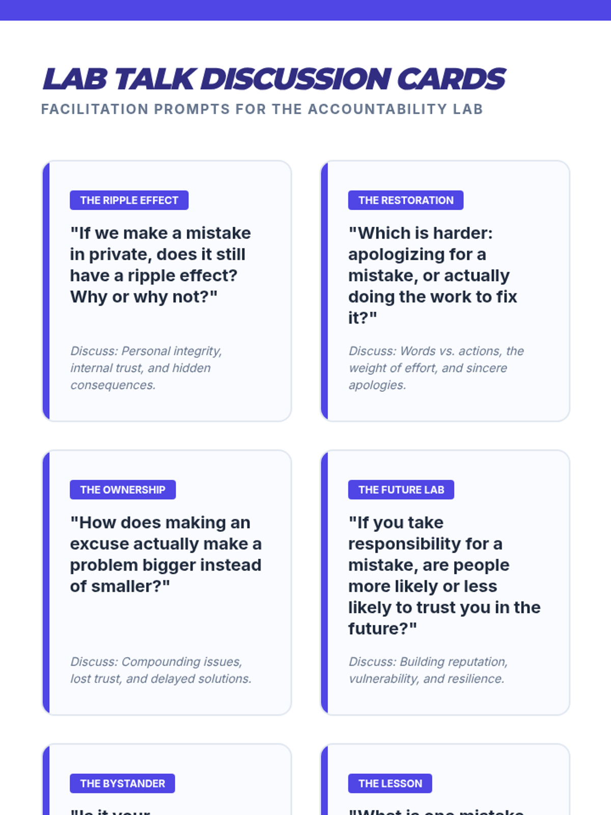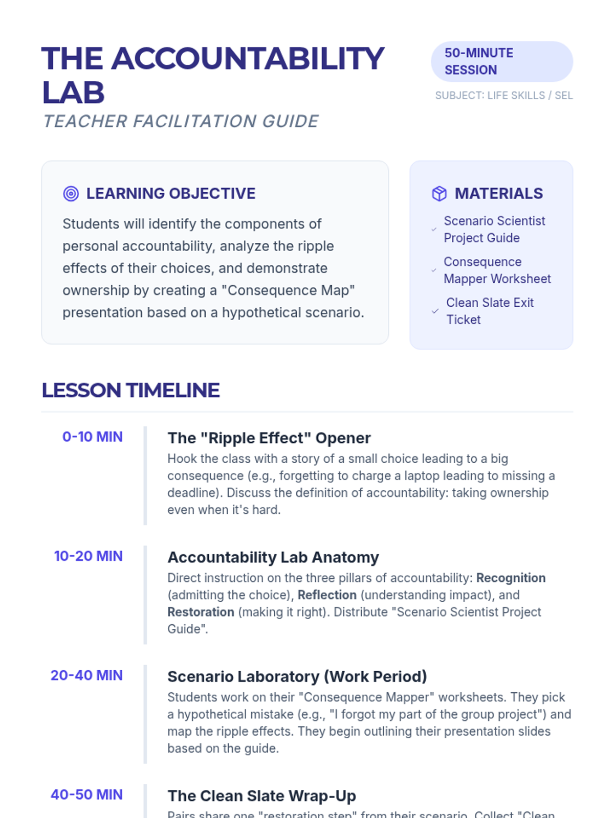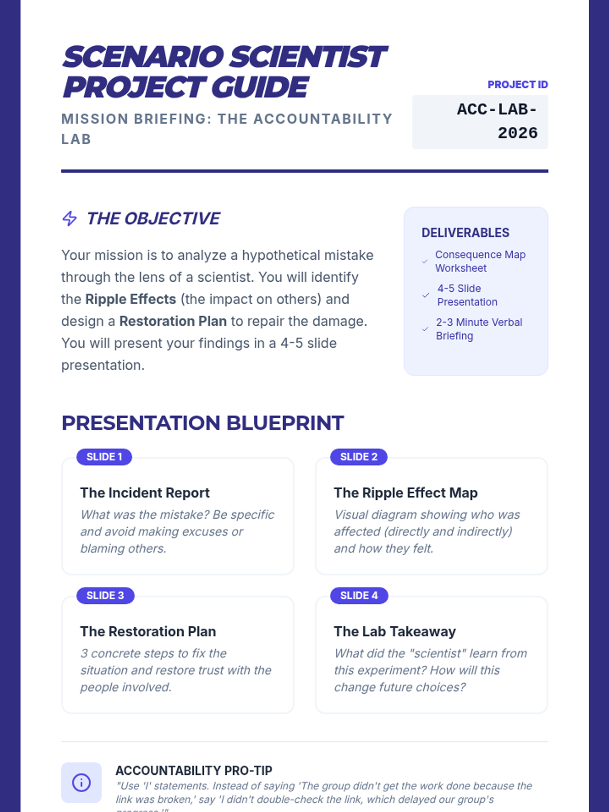 A comprehensive lesson on personal accountability, featuring a scenario-based presentation project. Students explore the relationship between choices, consequences, and taking ownership of their actions.