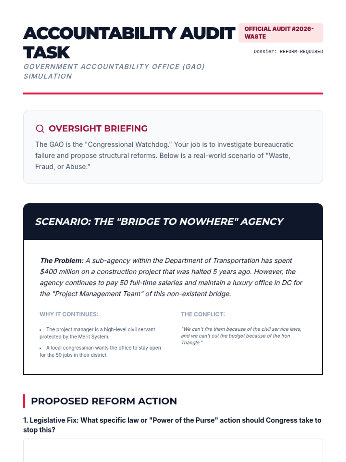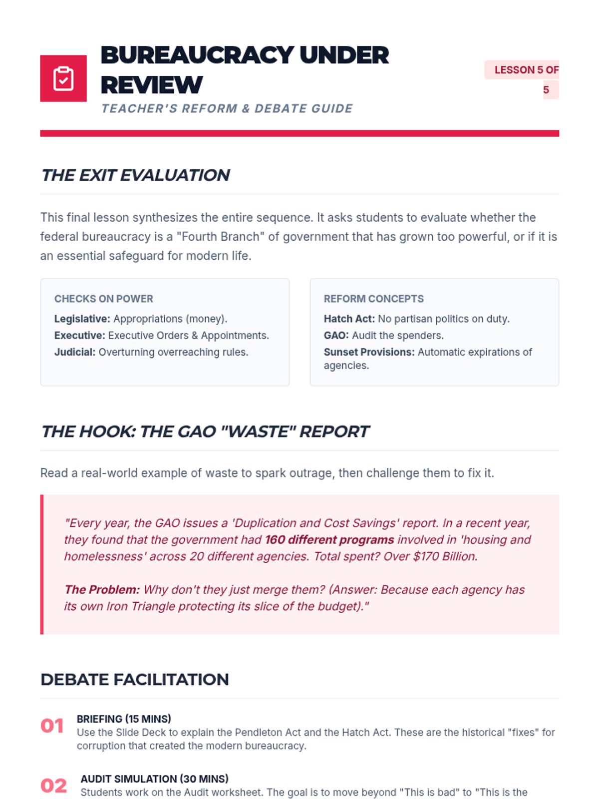 The sequence concludes by examining mechanisms of oversight and reform. Students debate the tension between expertise and democratic accountability, proposing potential reforms based on GAO reports.