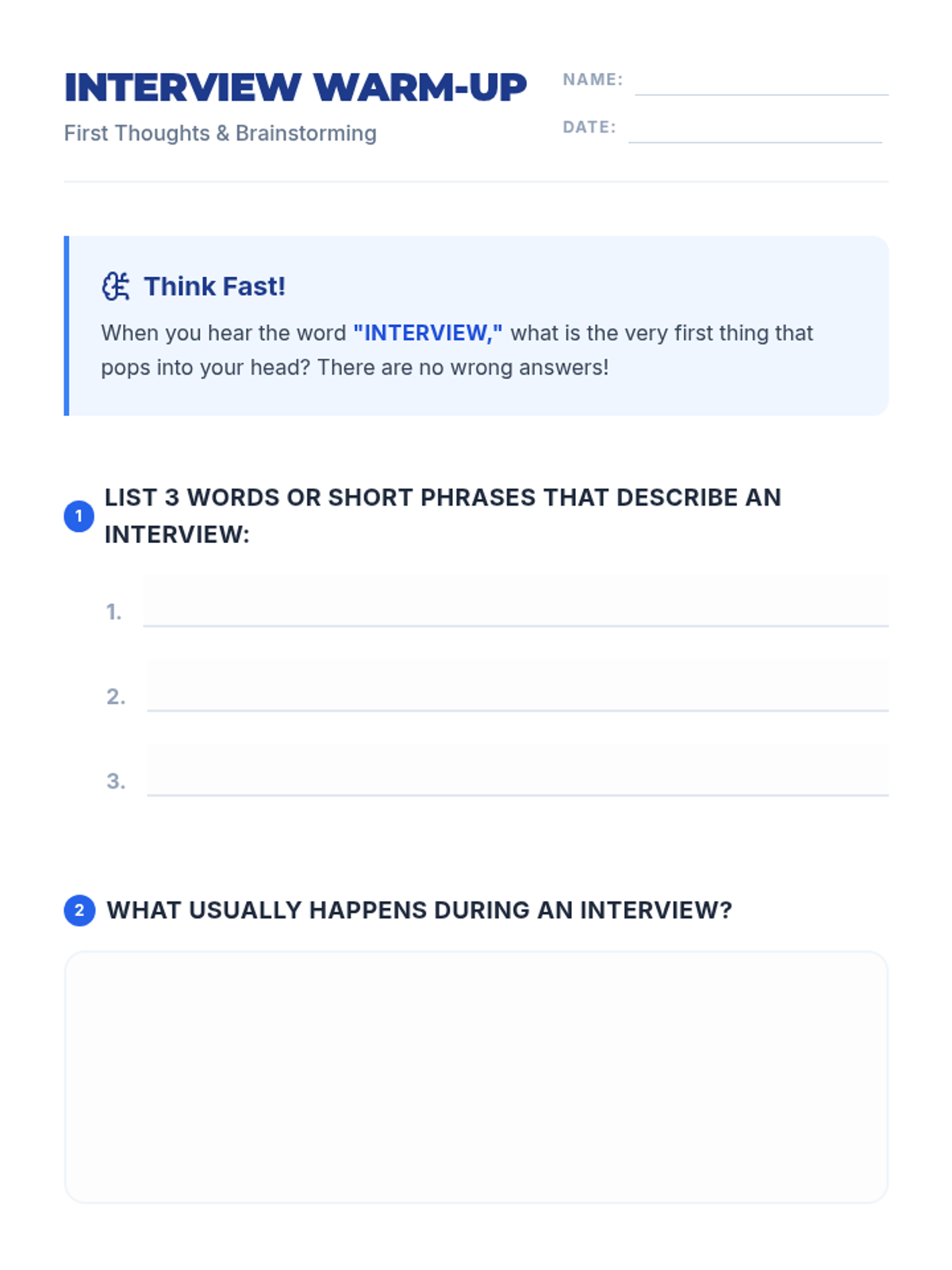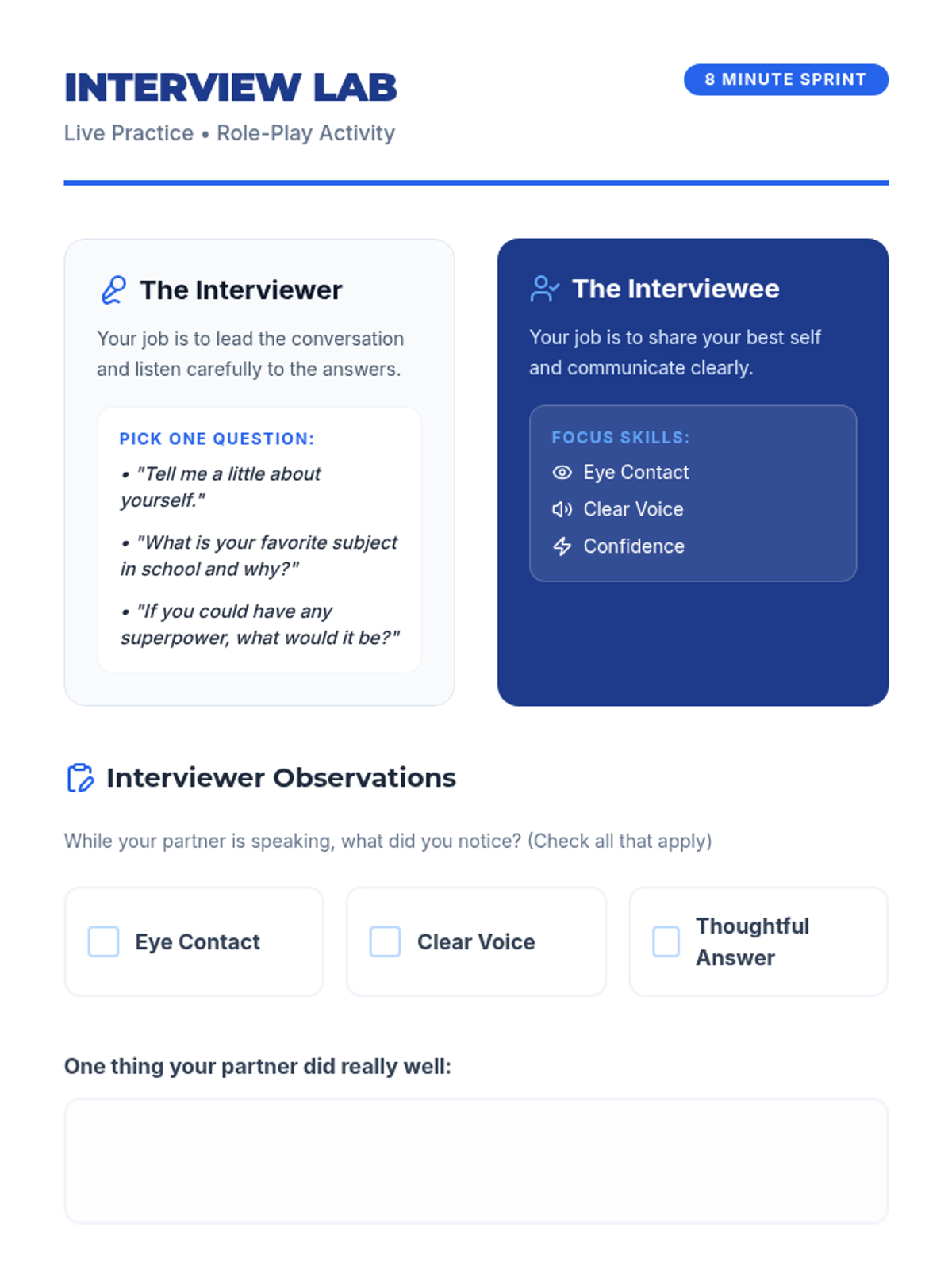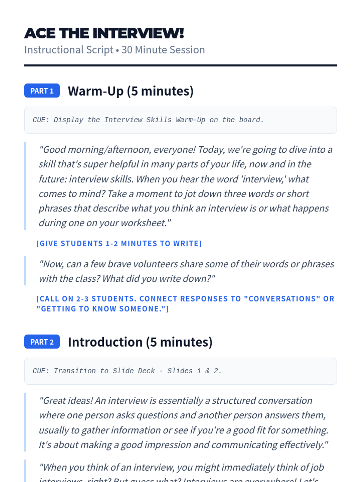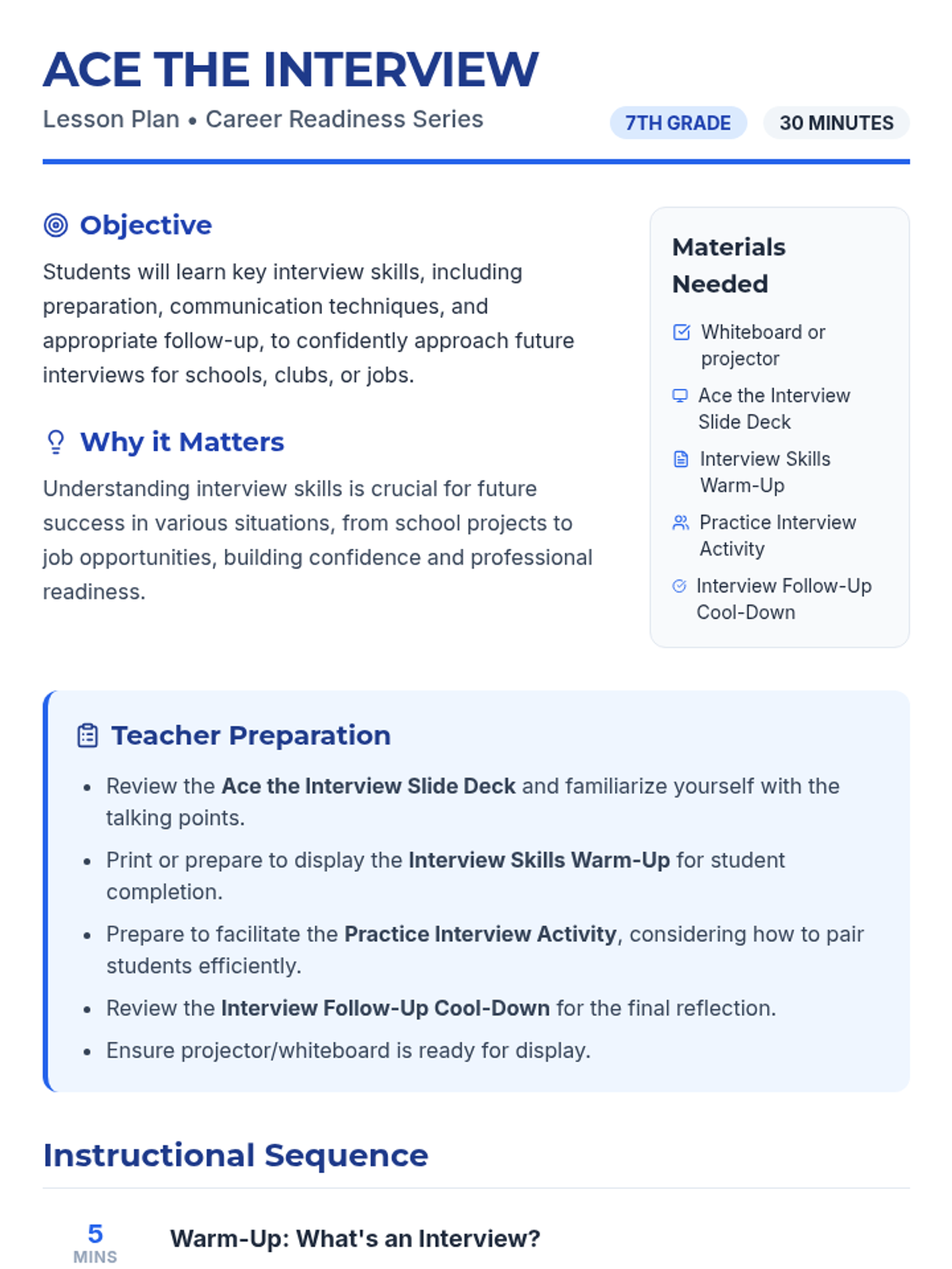 A 30-minute introductory lesson for 7th graders on essential interview skills, covering preparation, communication, and follow-up techniques.