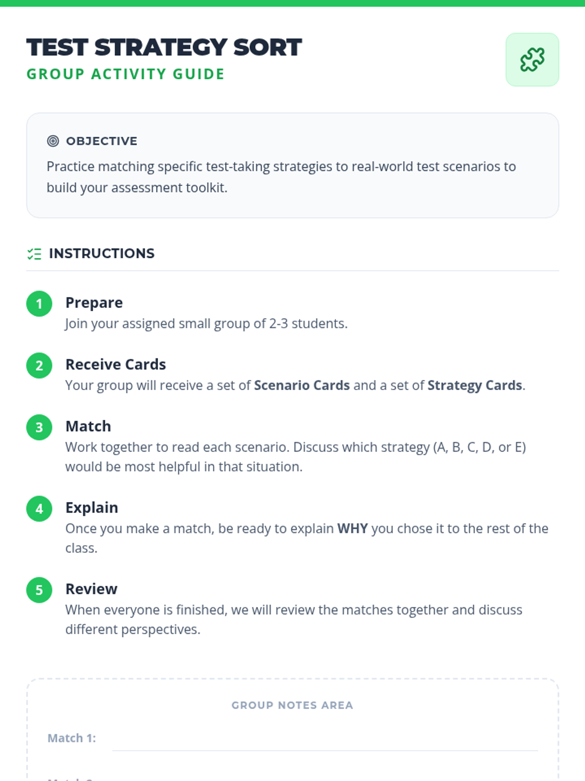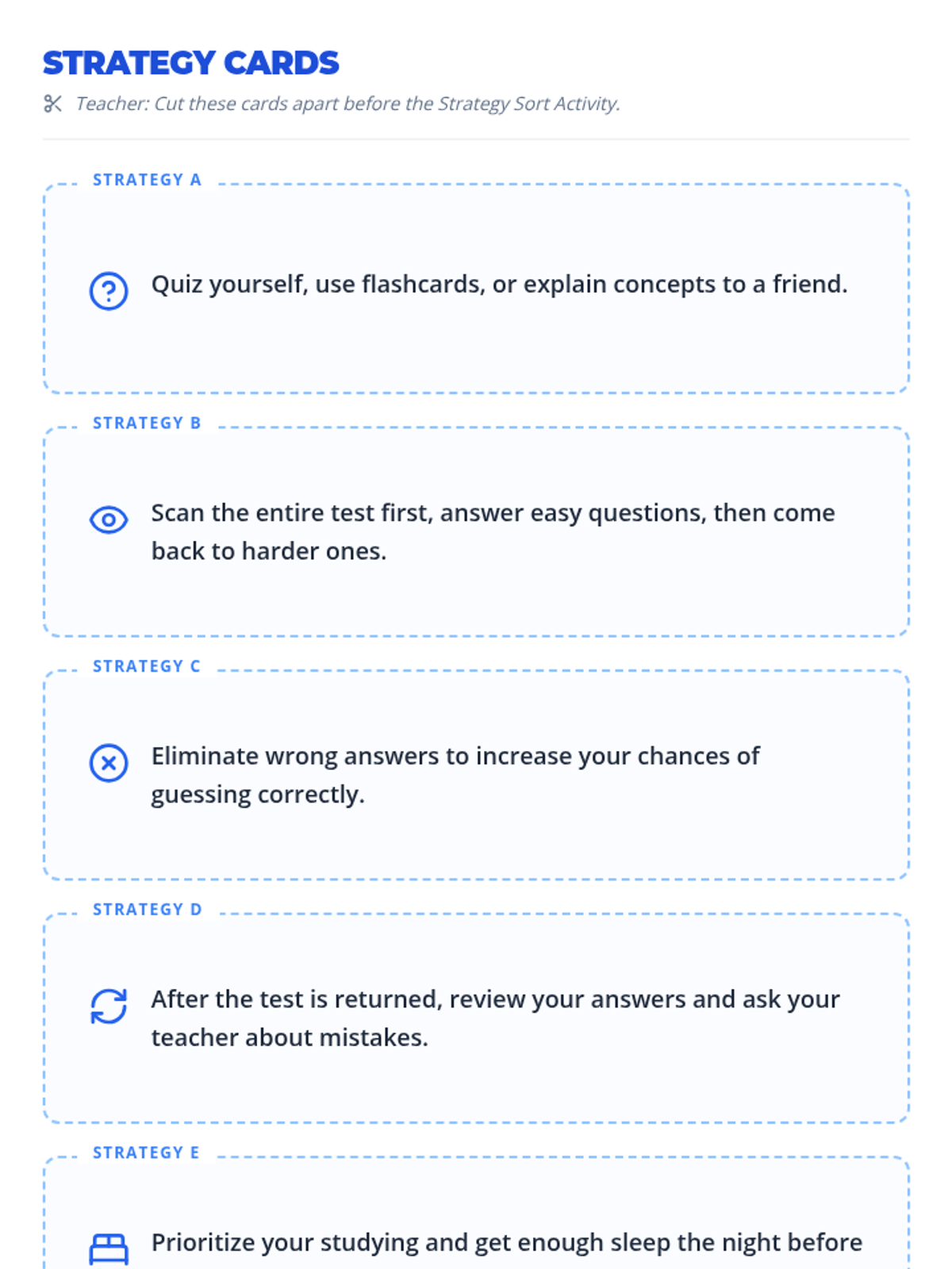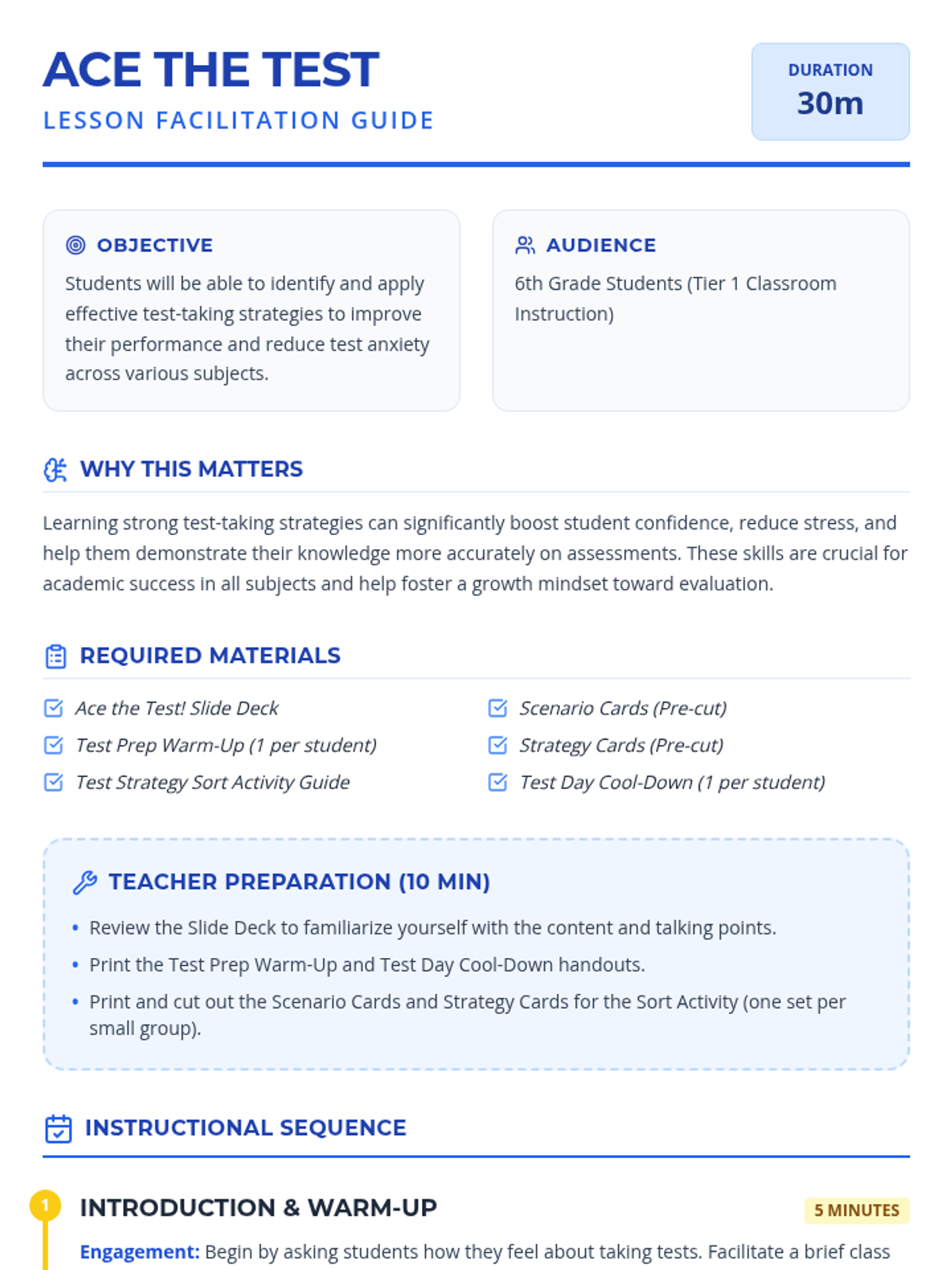 A 30-minute whole-class lesson for 6th graders to learn and practice essential test-taking strategies for before, during, and after assessments.