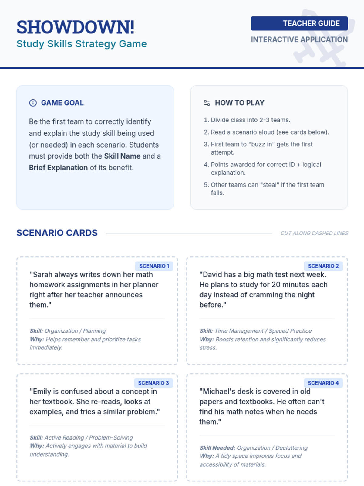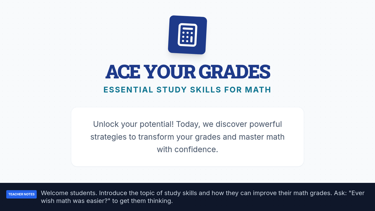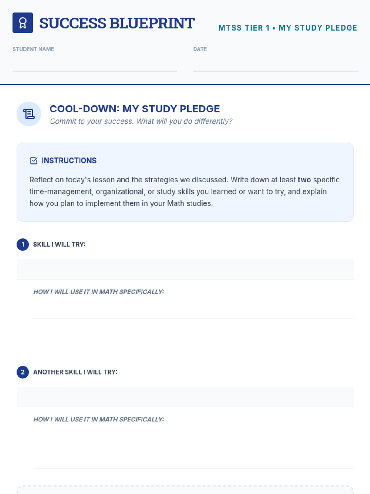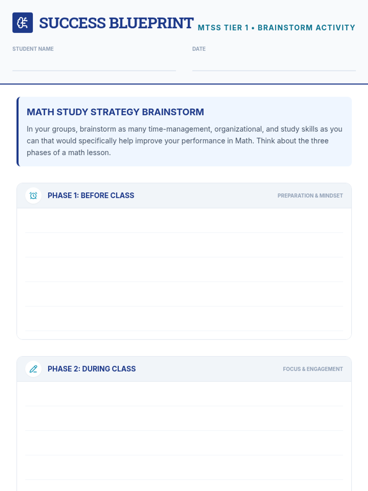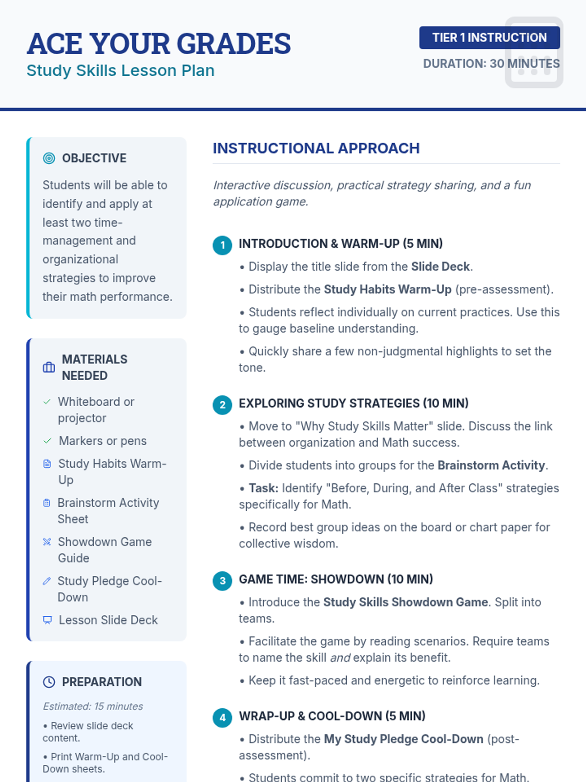 This lesson empowers 8th-grade students struggling in Math with essential time-management, organizational, and study skills to improve academic performance.