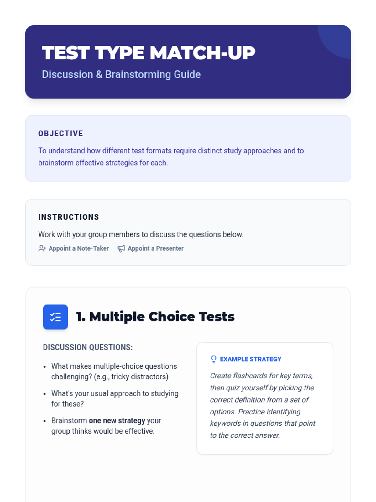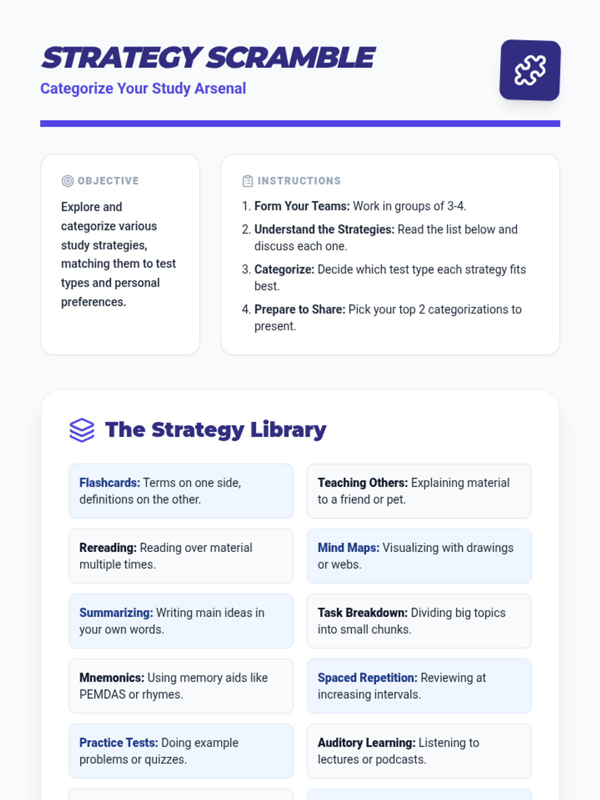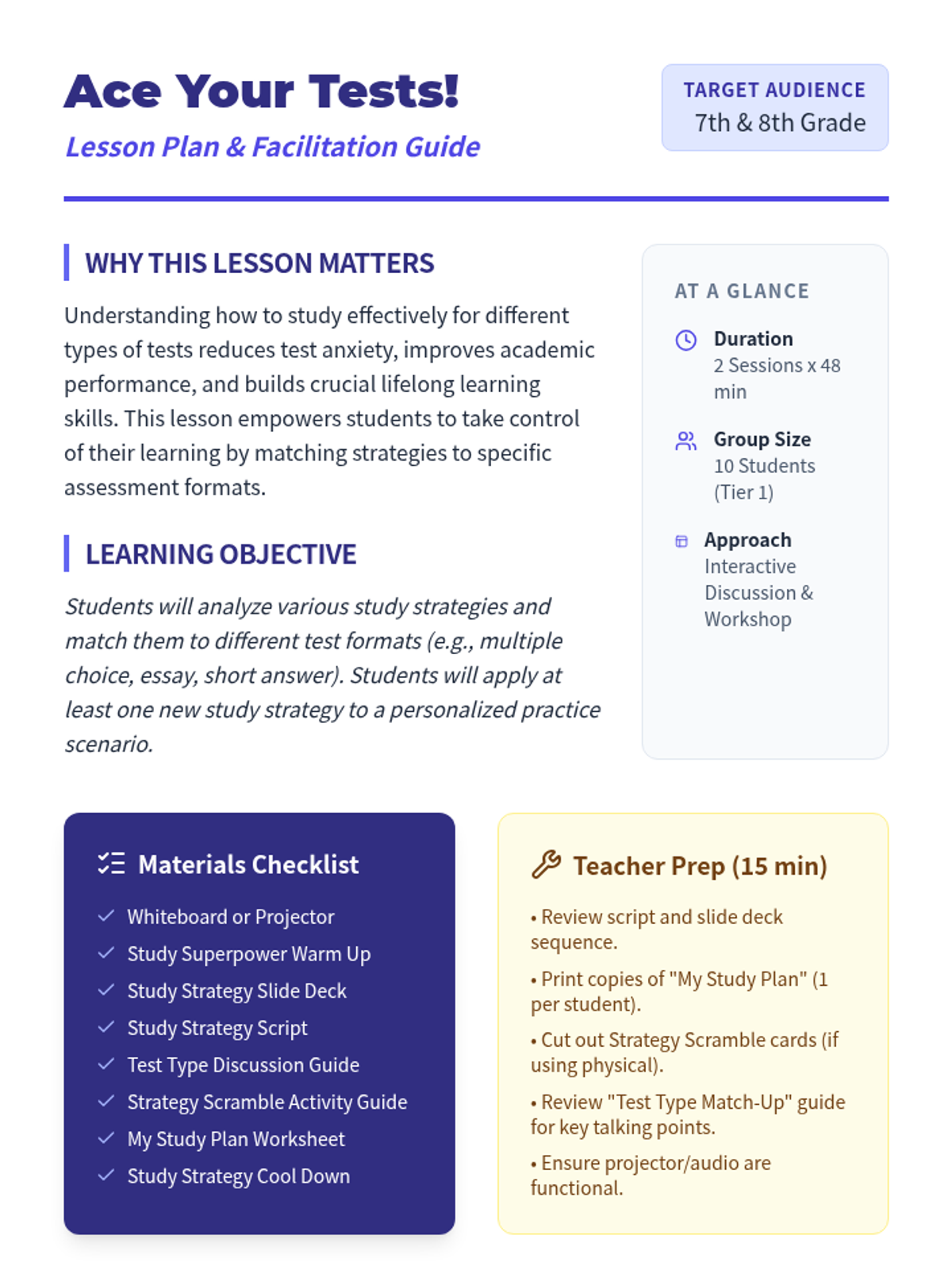 A 96-minute lesson (split into two 48-minute sessions) that teaches students how to match study techniques to test types and create personalized study plans.