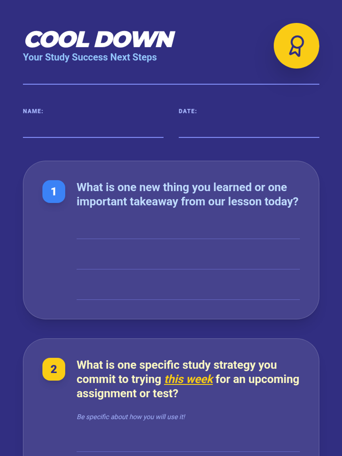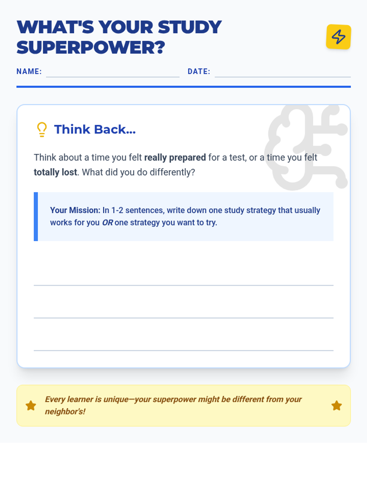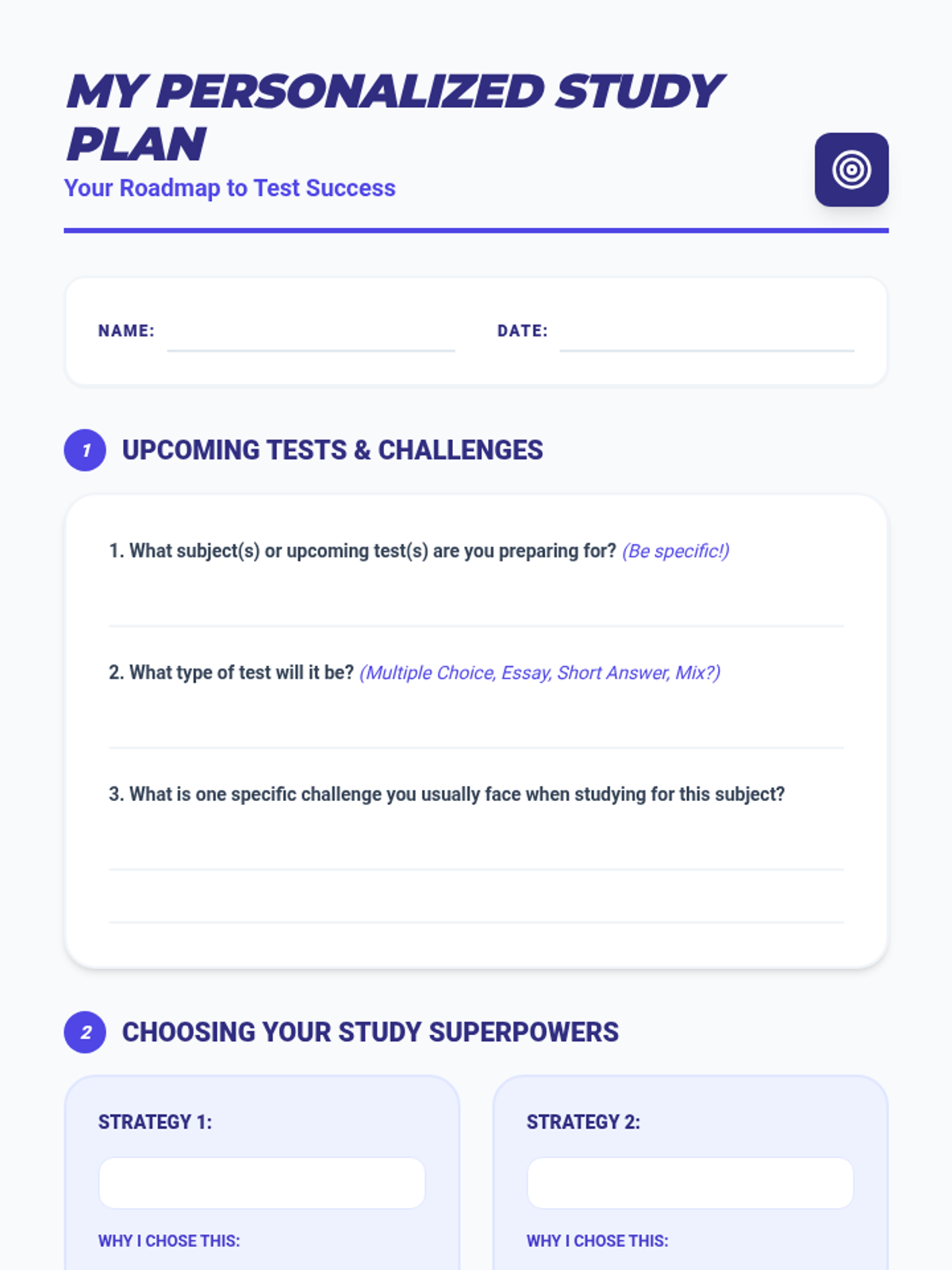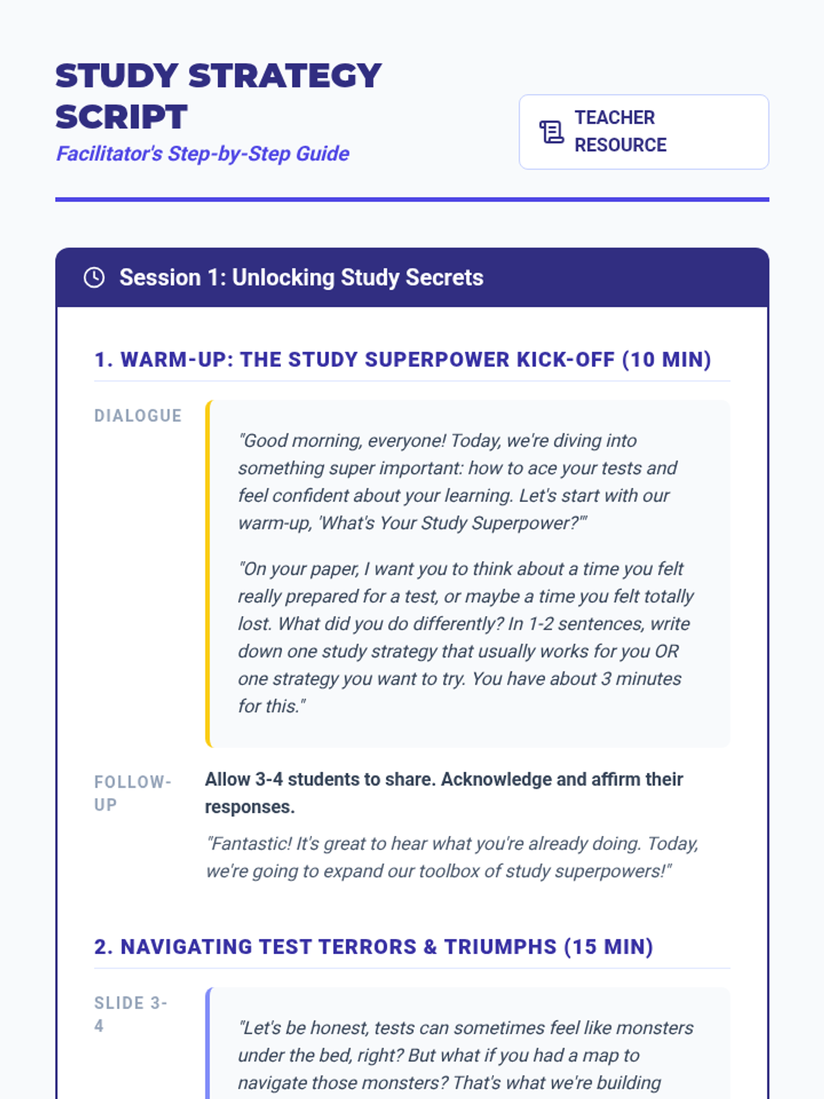 A 96-minute lesson (split into two 48-minute sessions) that teaches students how to match study techniques to test types and create personalized study plans.