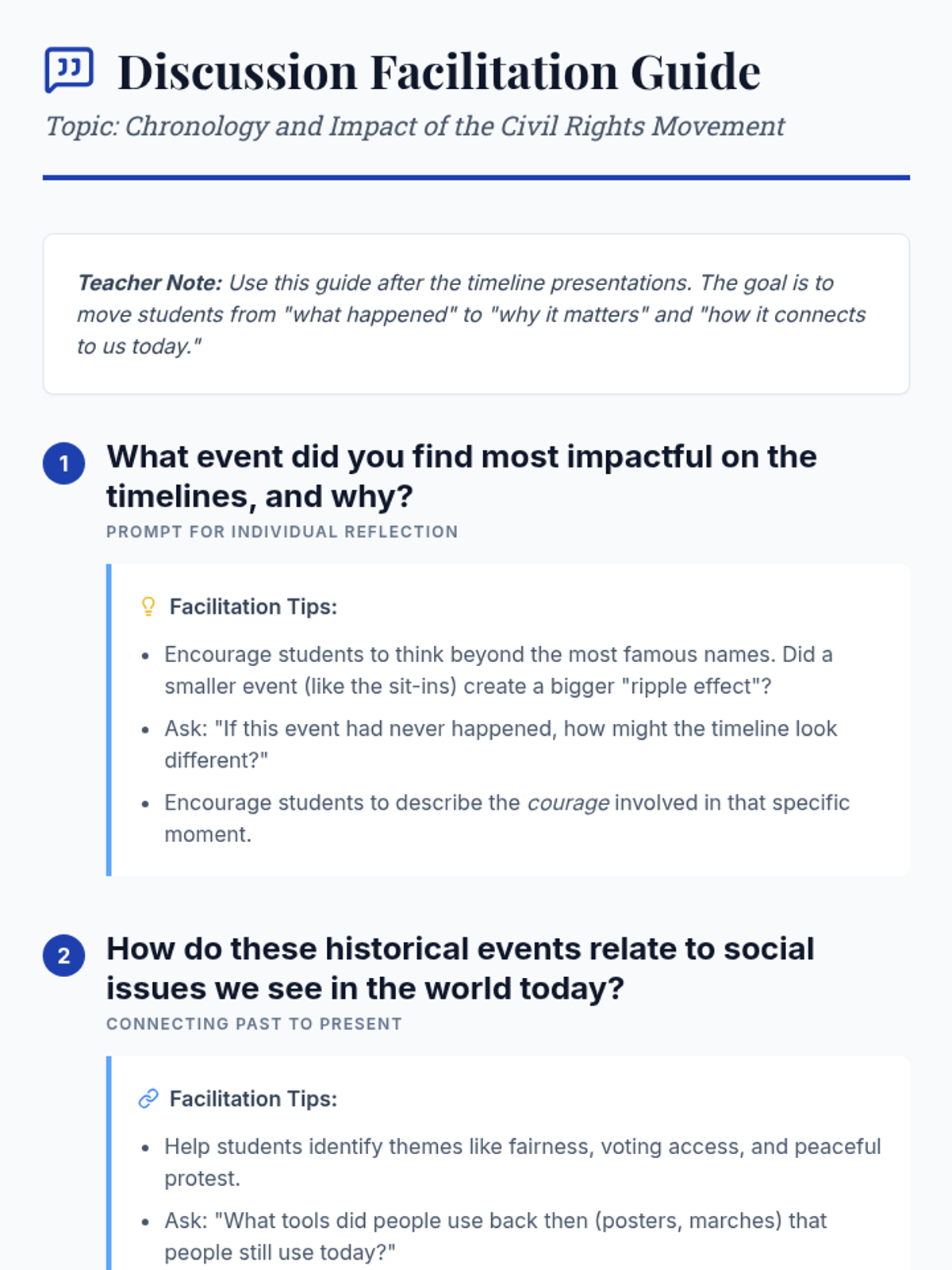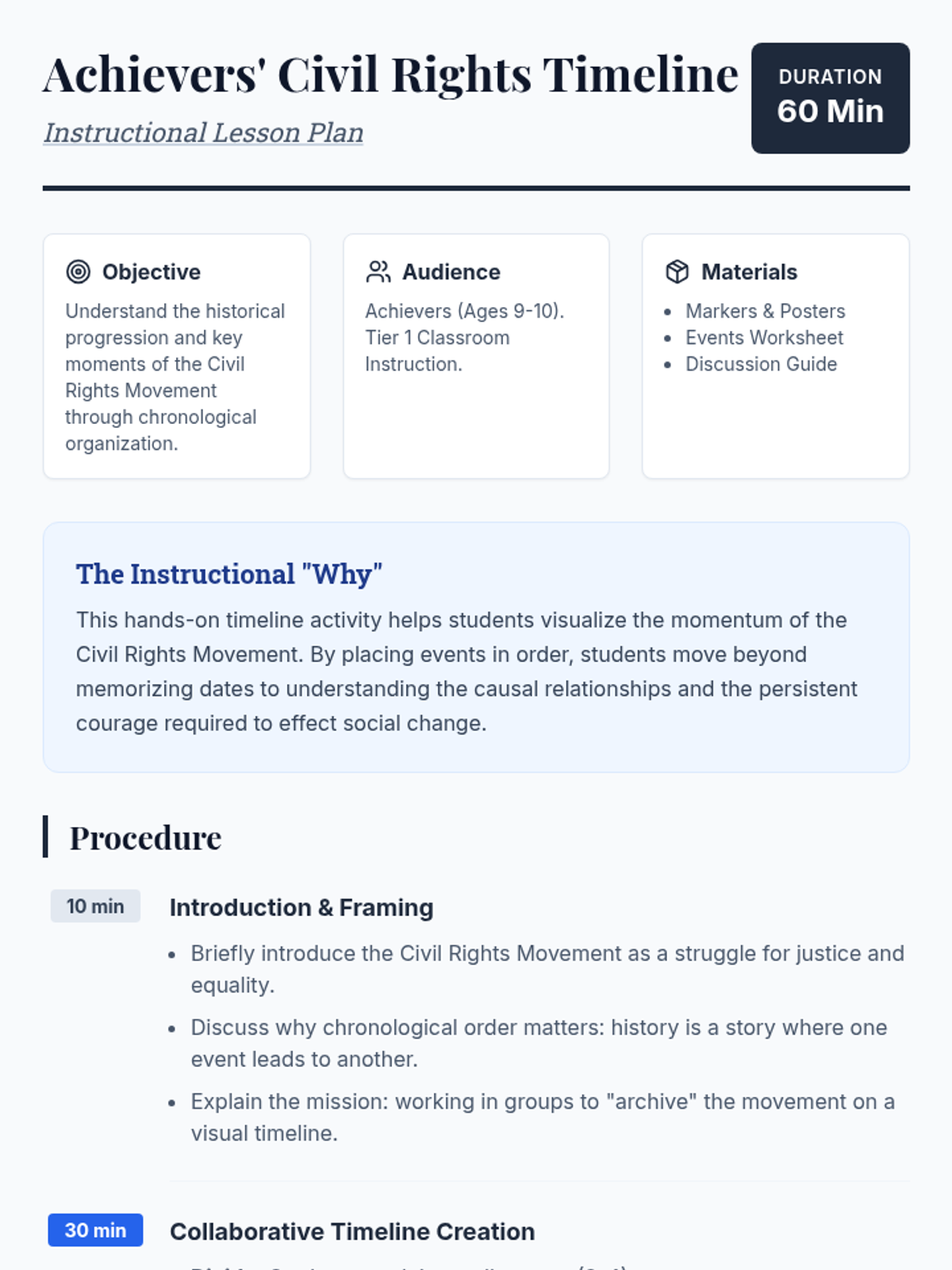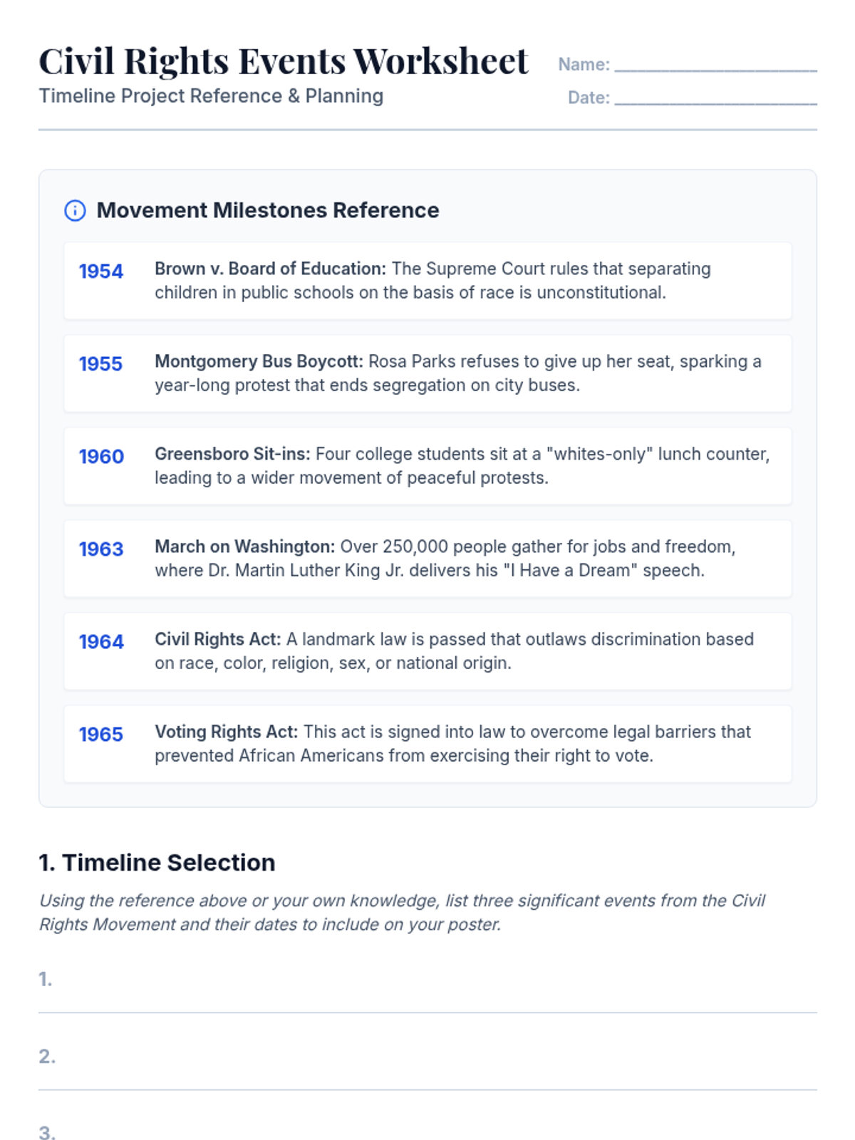 Students explore key moments of the Civil Rights Movement by creating a collaborative timeline, enhancing their chronological thinking and historical empathy.