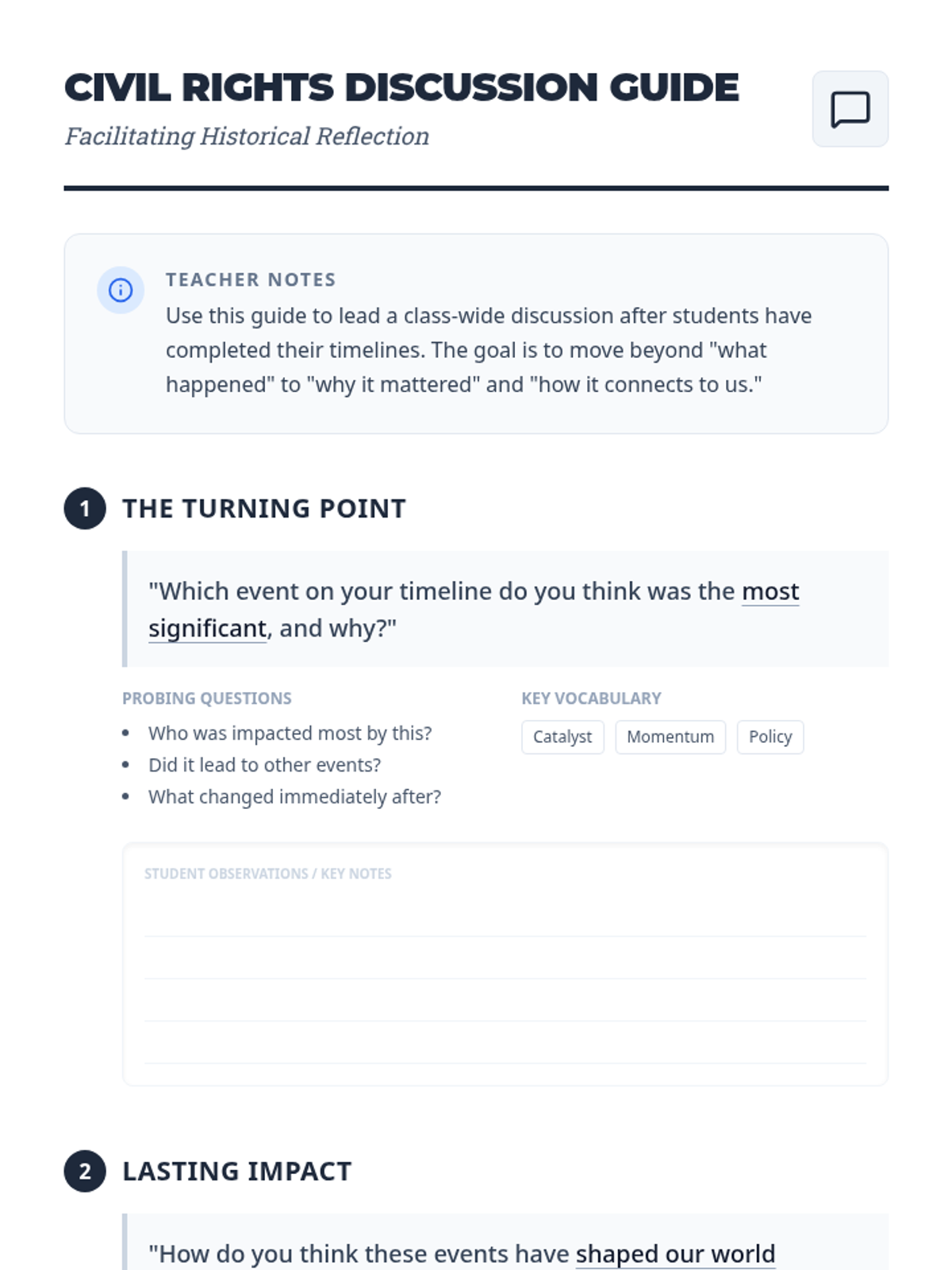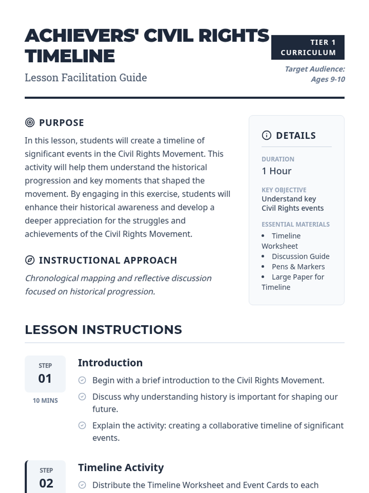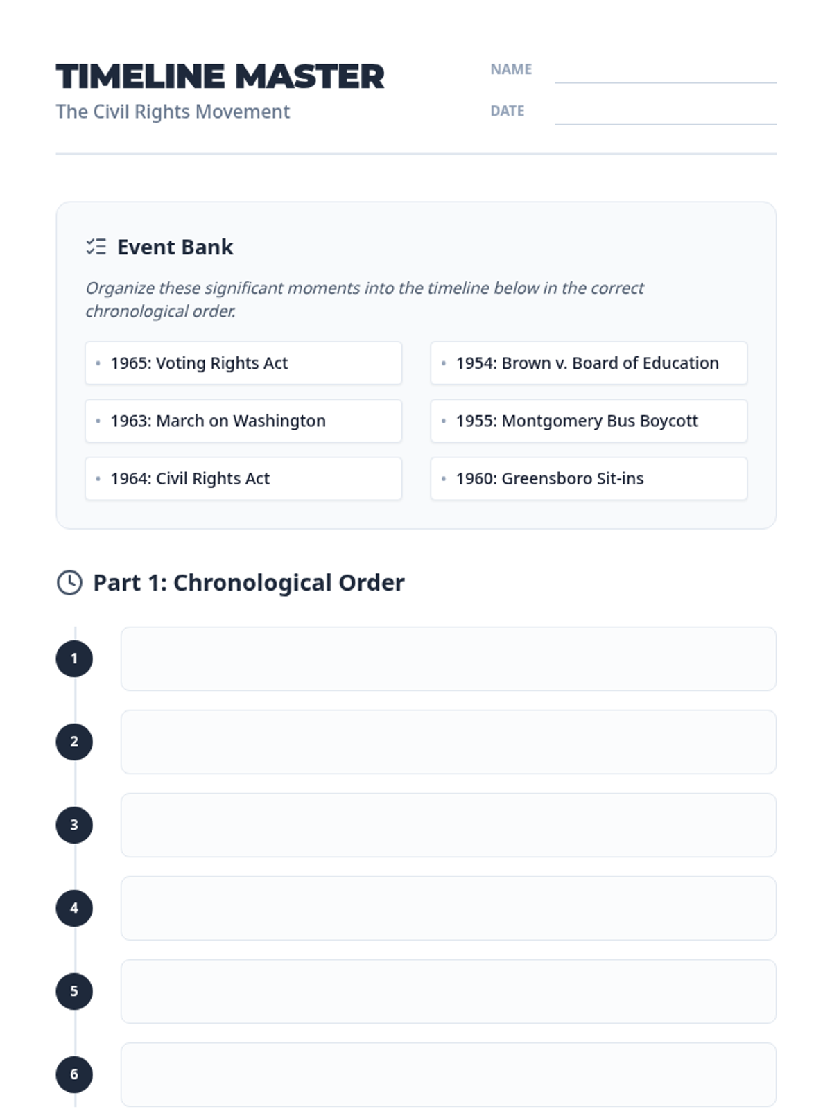 A lesson where students aged 9-10 explore the Civil Rights Movement by constructing a chronological timeline of key events, enhancing their historical awareness and understanding of social change.