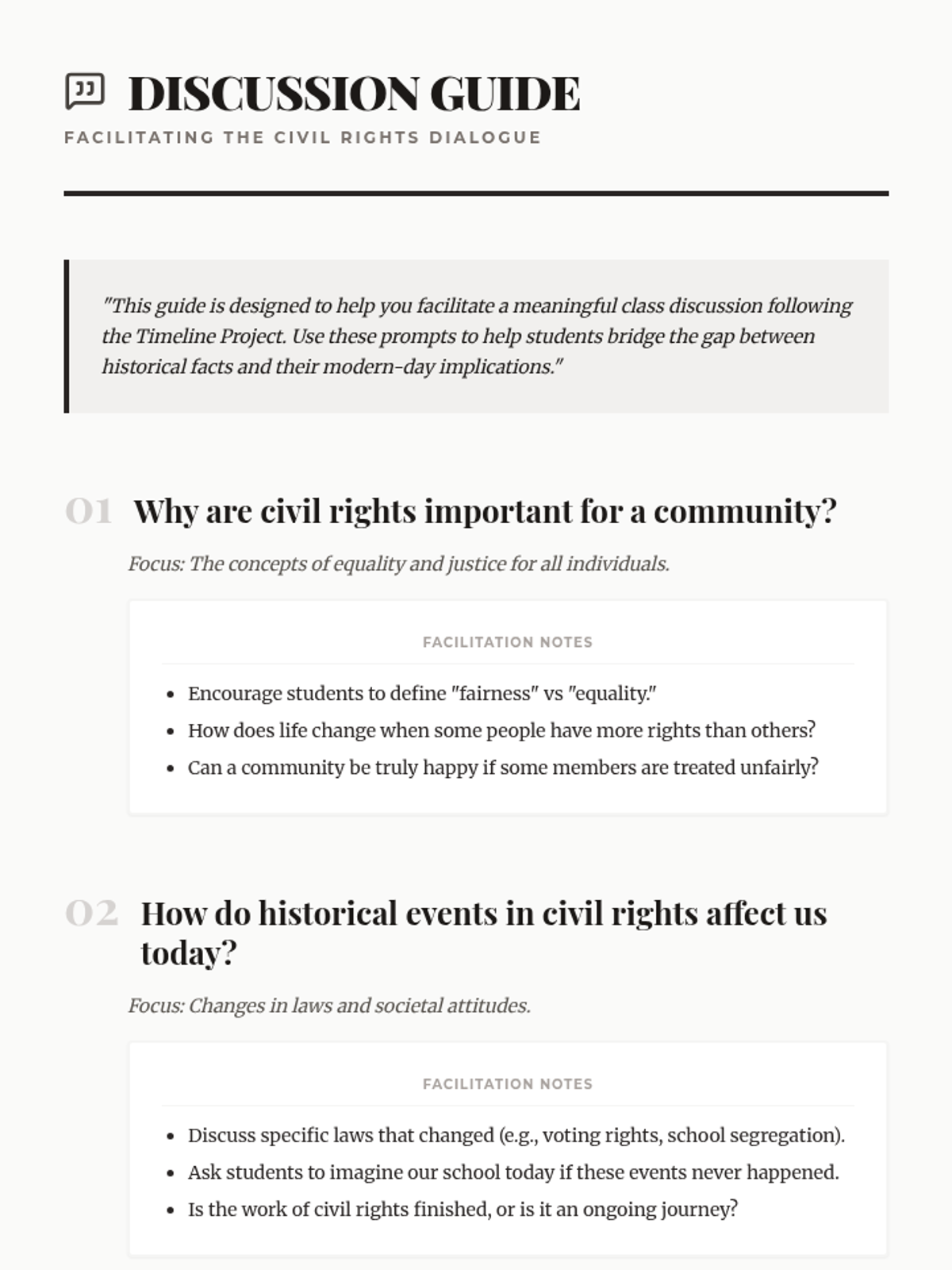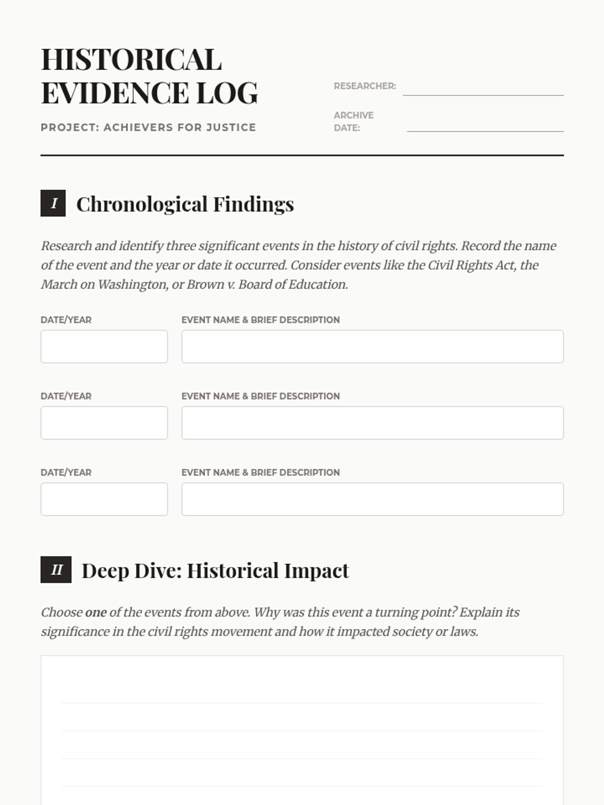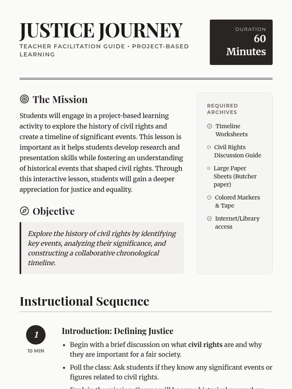 Students engage in a project-based learning activity to explore civil rights history and create a visual timeline of significant events. This lesson builds research, presentation, and historical understanding skills through collaborative group work.