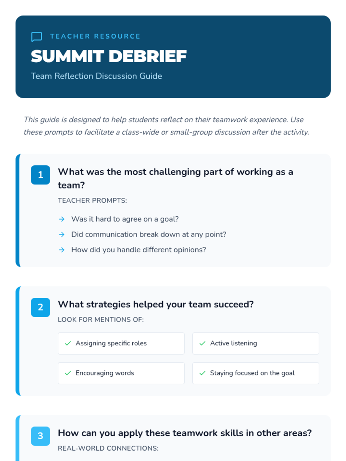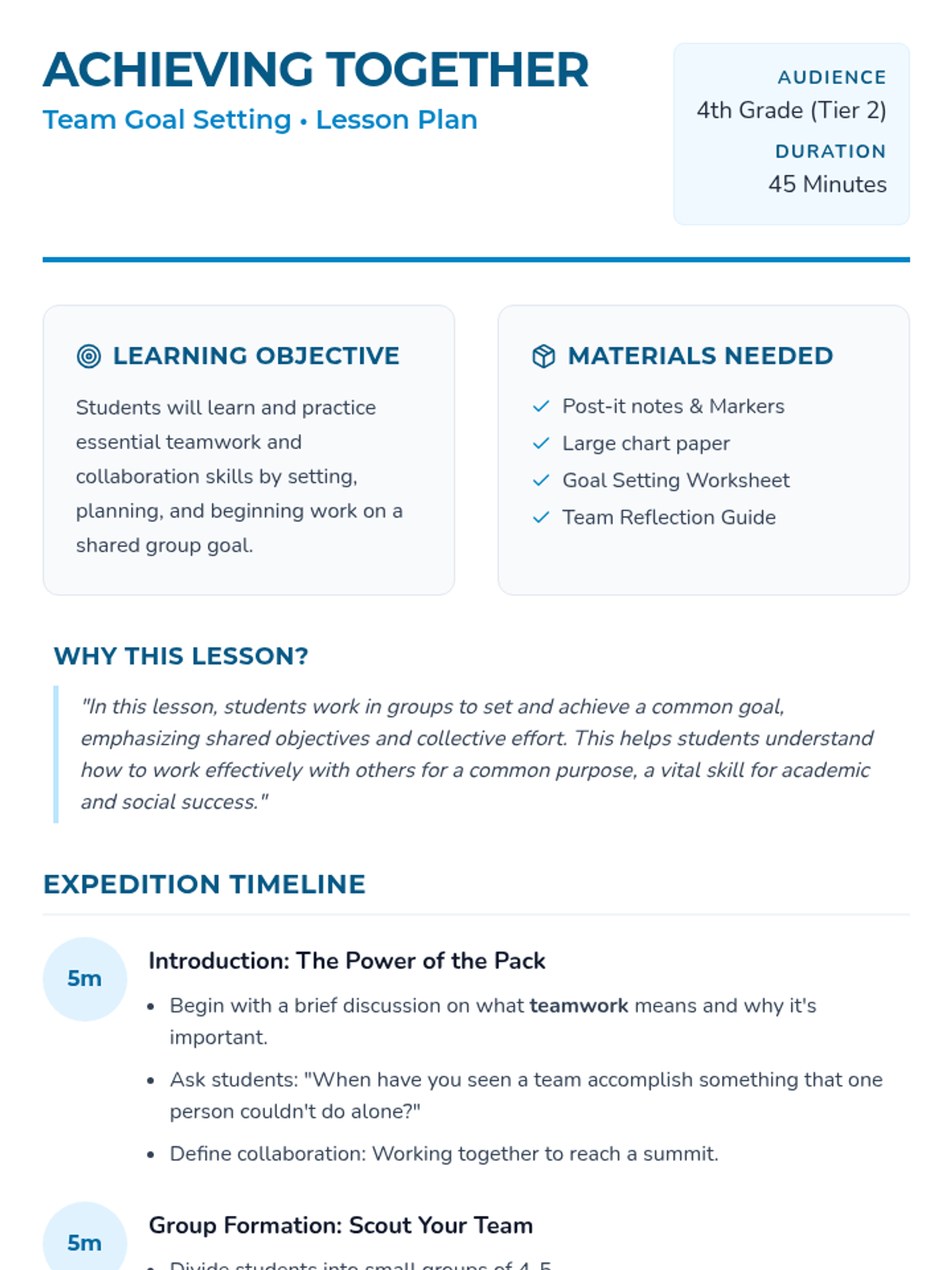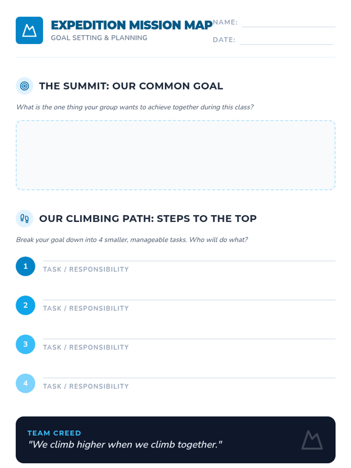 Students work in small groups to set and achieve a common goal, developing essential teamwork, communication, and collaboration skills through a hands-on expedition-themed activity.