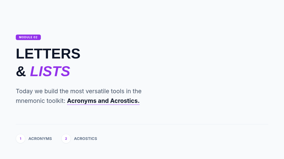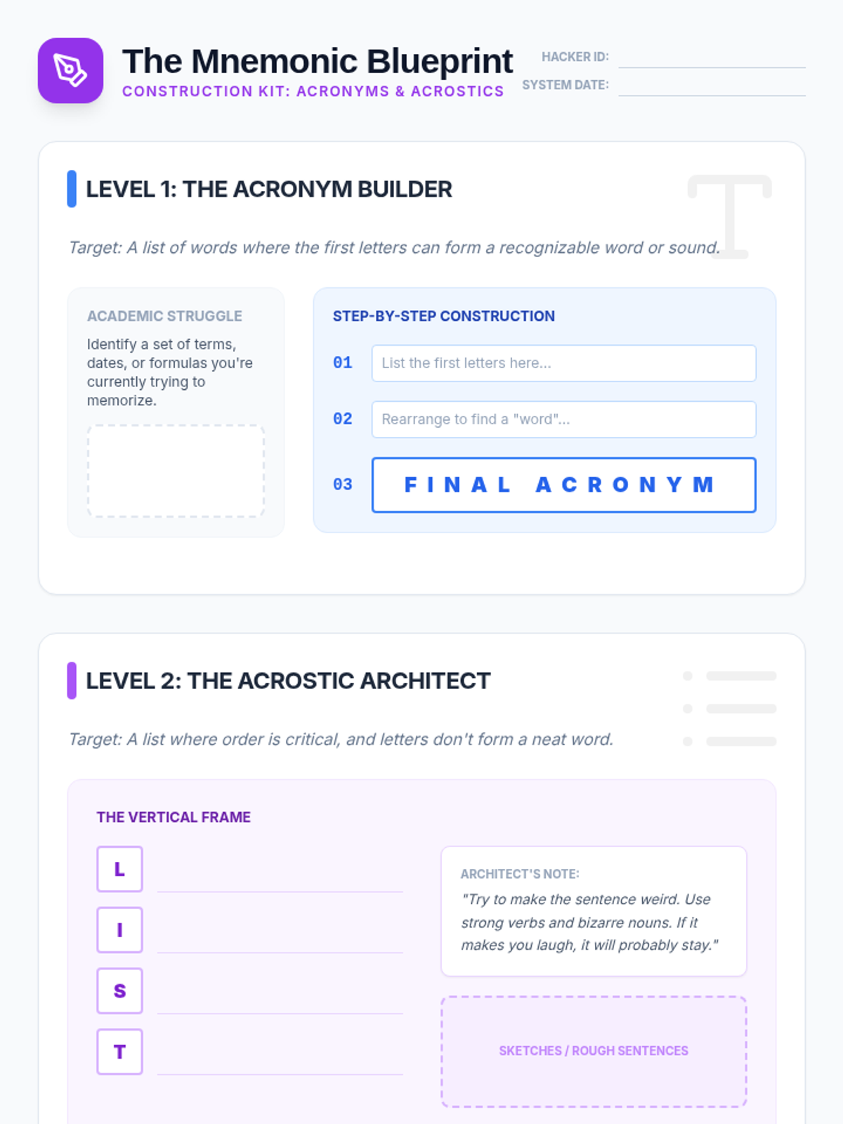 Focuses on the construction of acronyms and acrostics as tools for memorizing ordered lists and processes. Students practice creating and evaluating their own mnemonic devices for complex academic content.