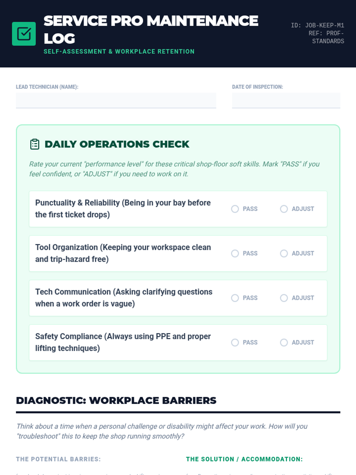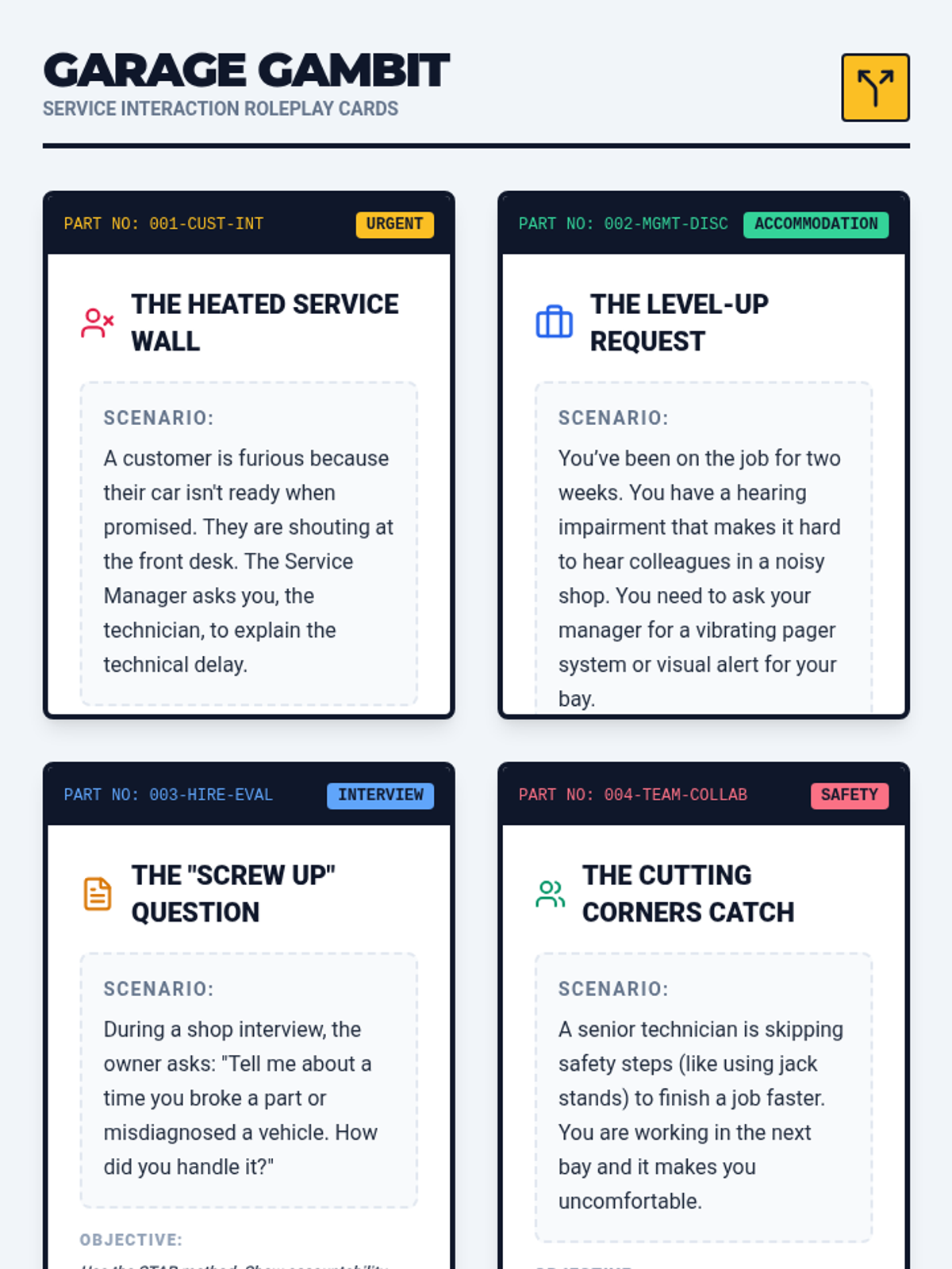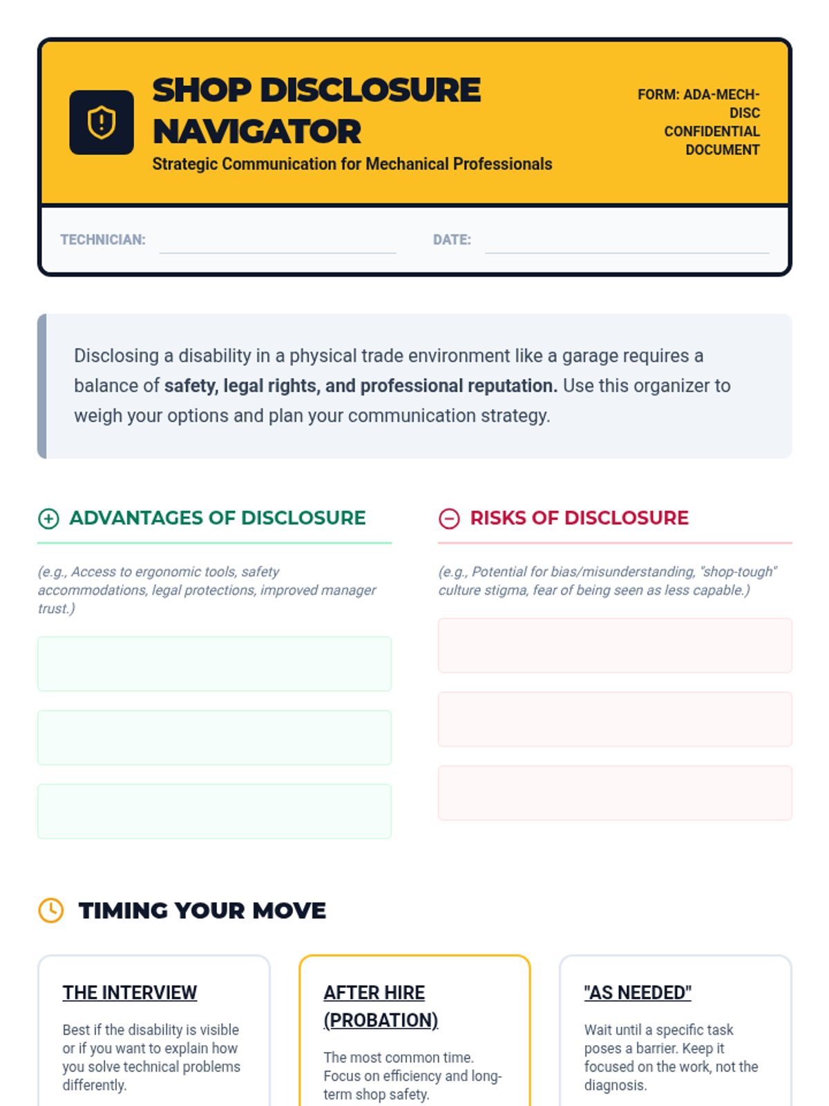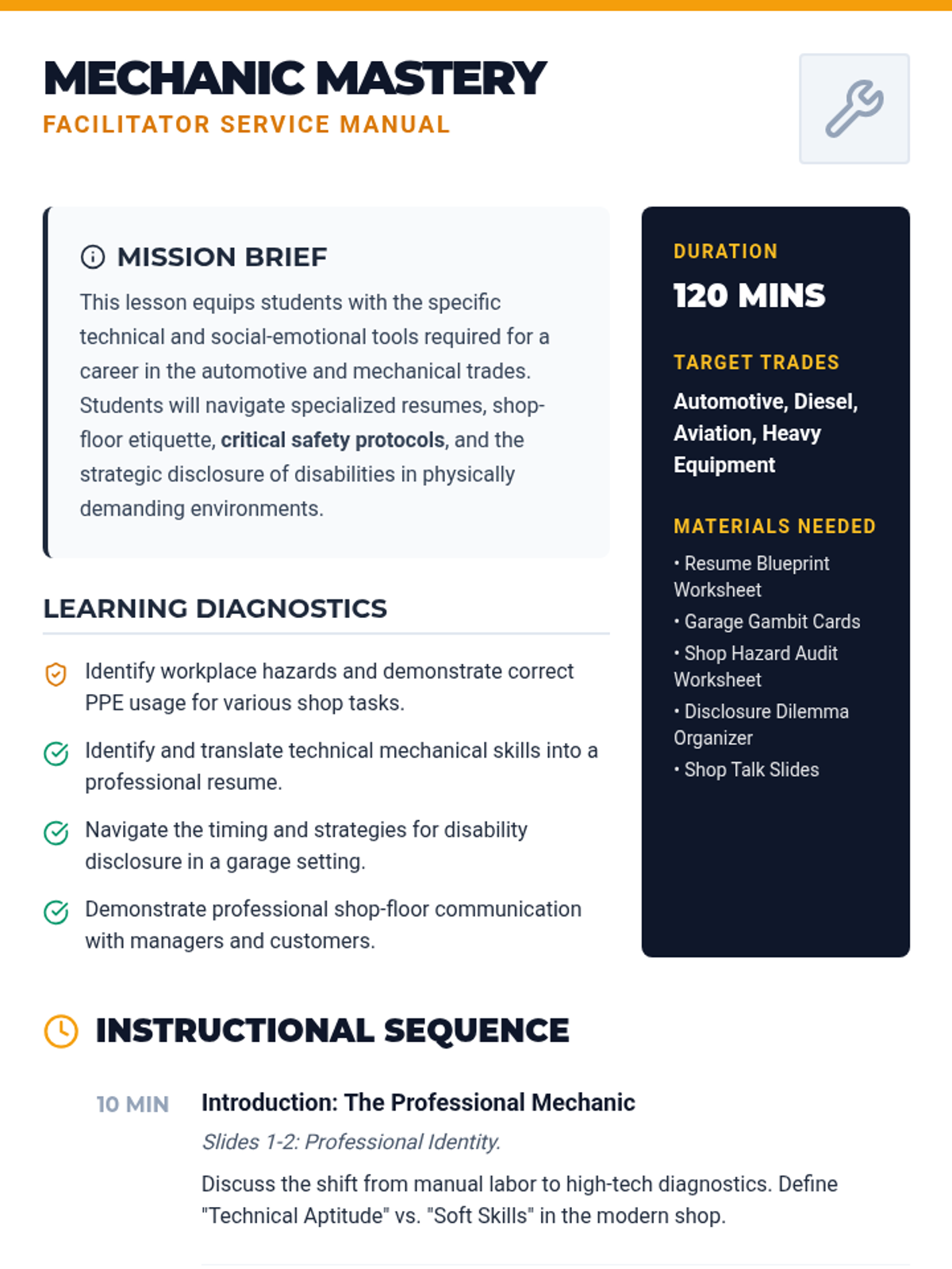 A specialized career preparation lesson focused on entering the automotive and mechanical trades, covering technical resumes, shop-floor communication, and navigating disability disclosure in a physical work environment.