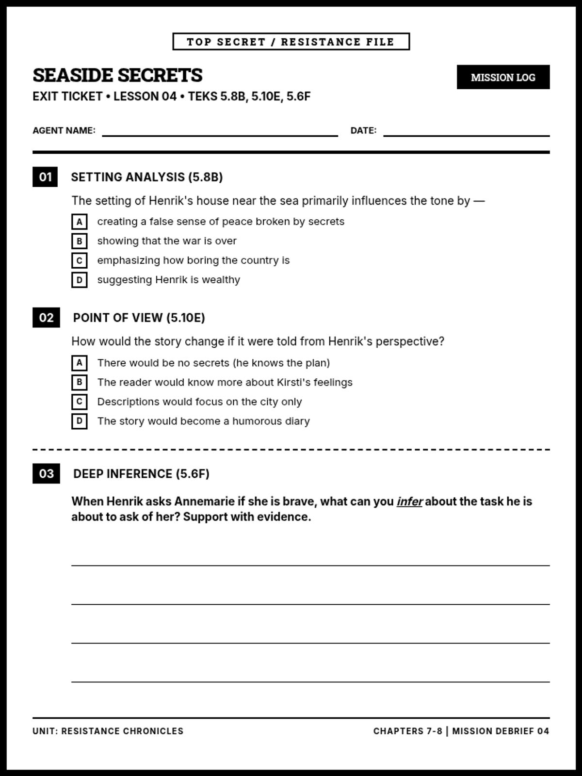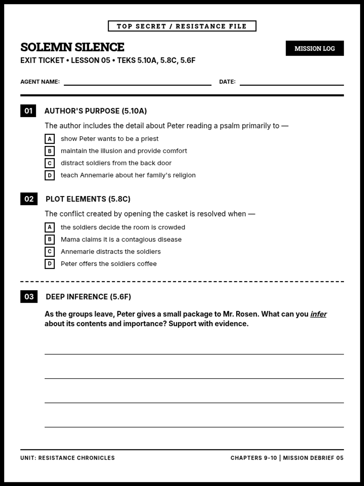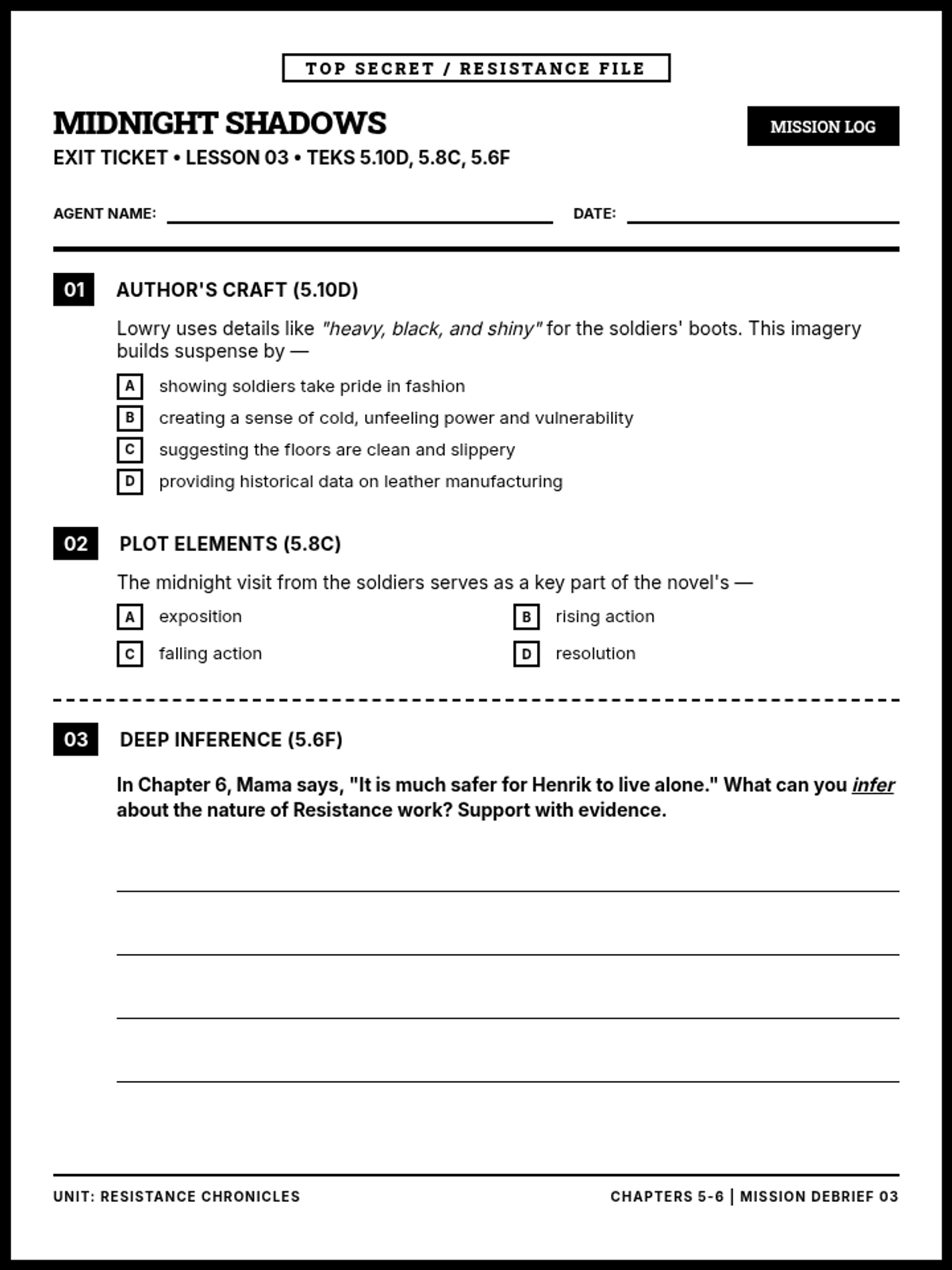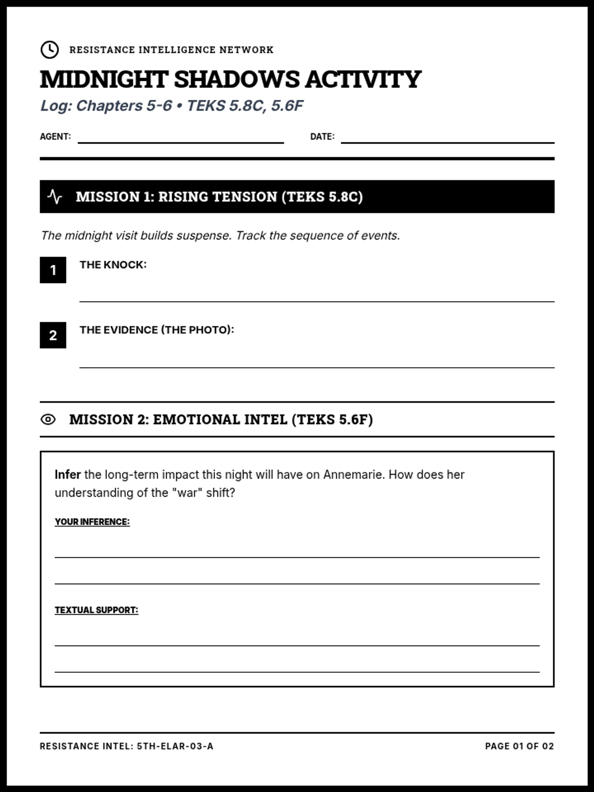 Focusing on chapters 5 and 6, students track plot development and practice inferring the stakes and emotions during the high-tension midnight visit from soldiers (TEKS 5.8C, 5.6F).