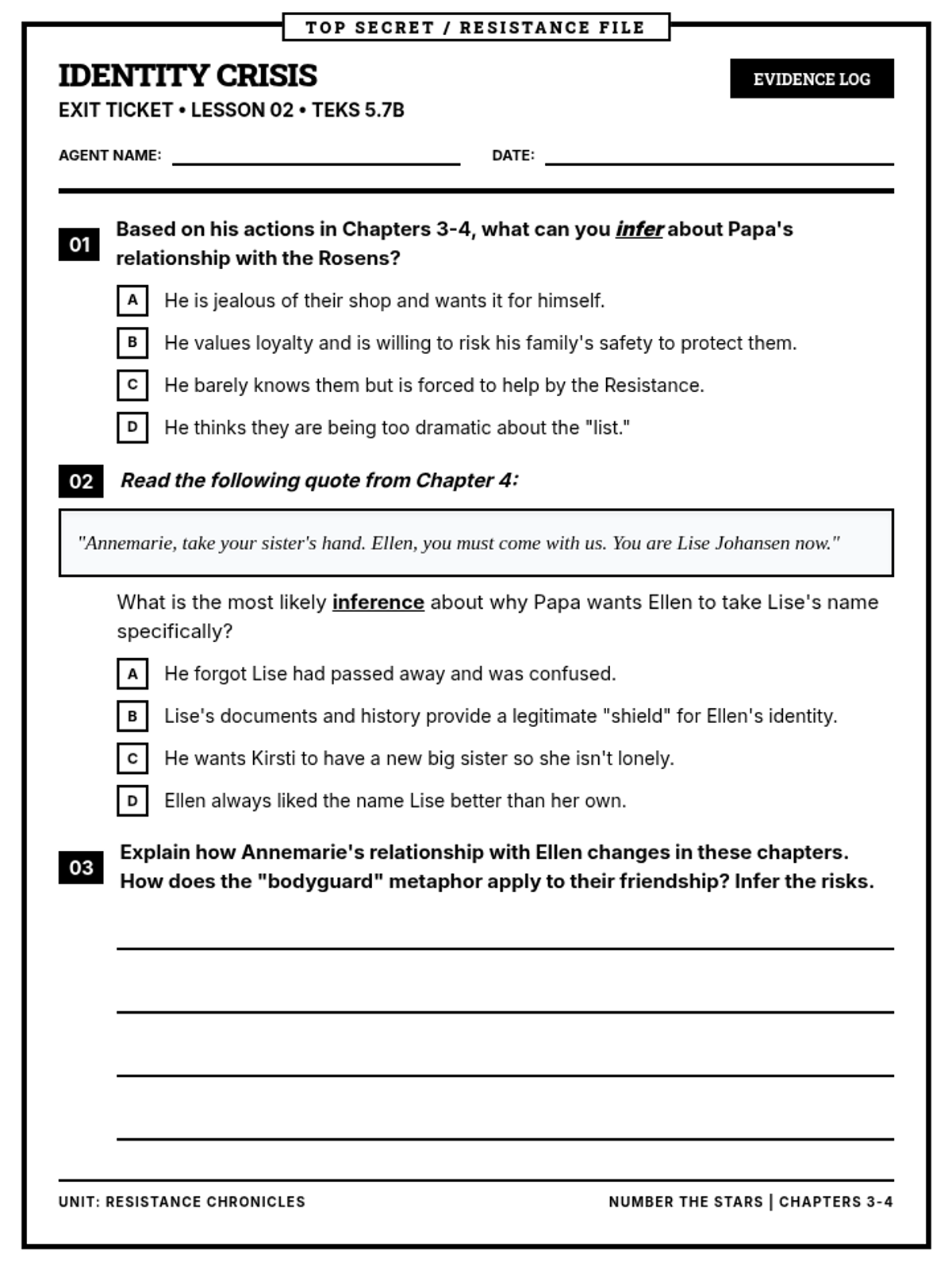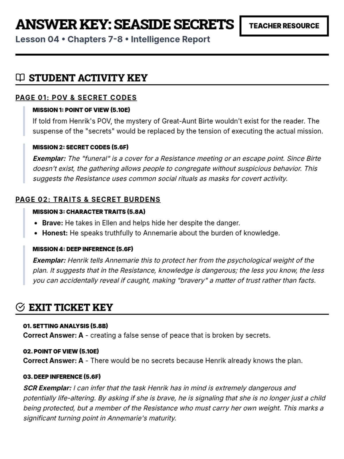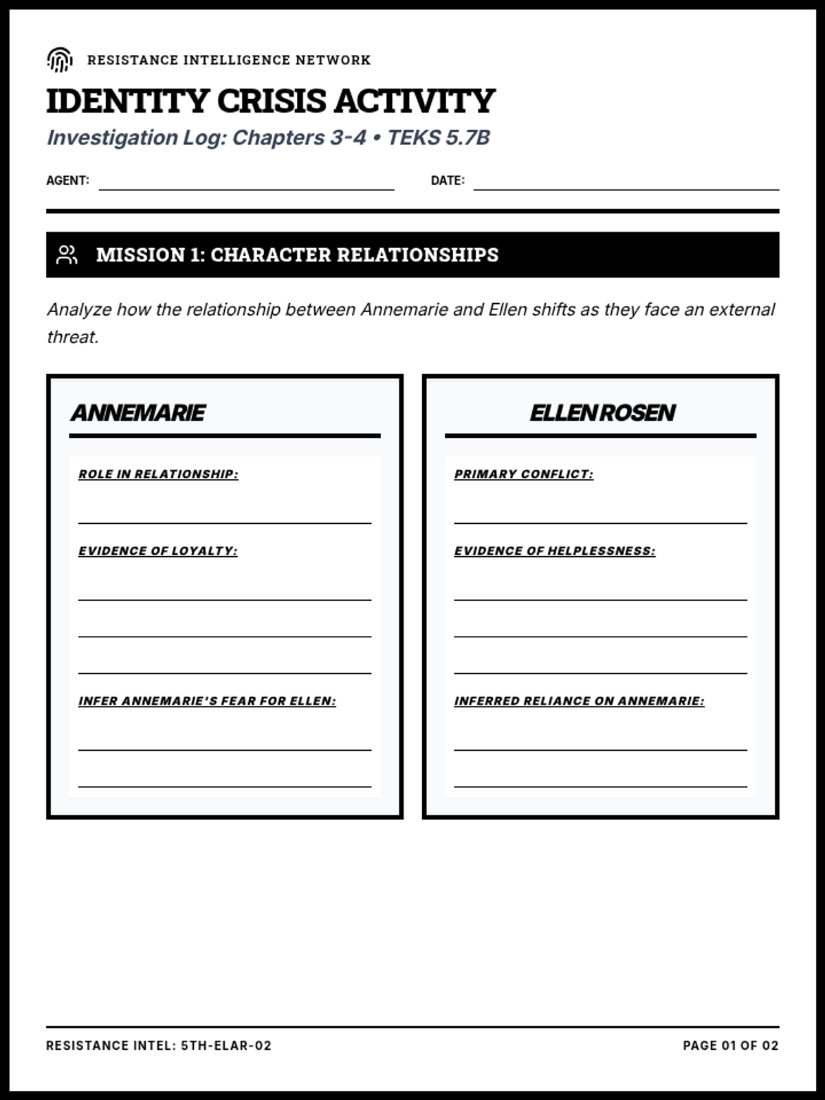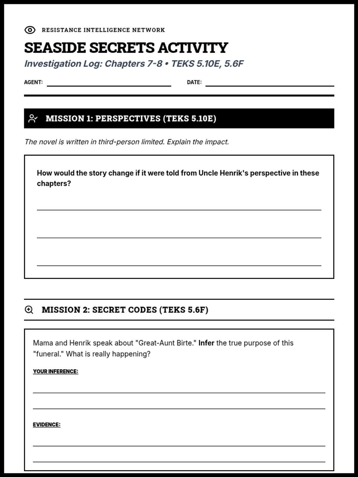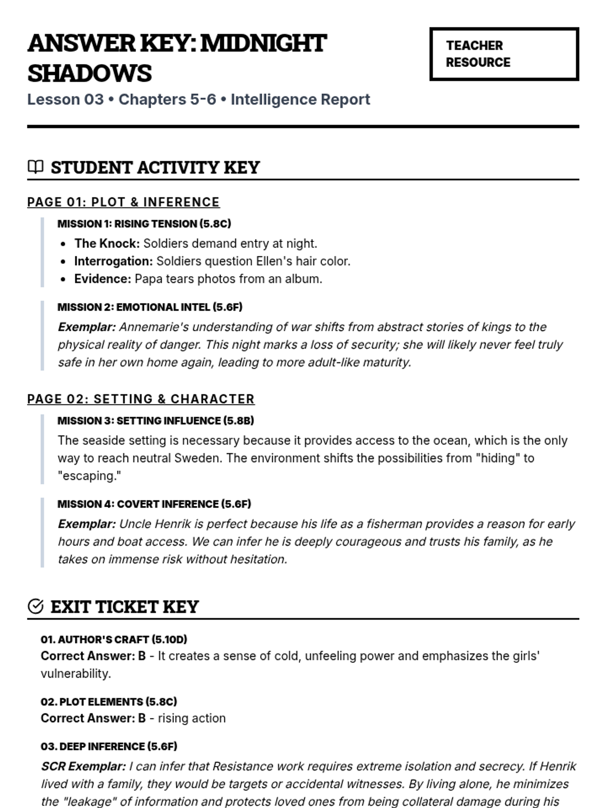 Focusing on chapters 5 and 6, students track plot development and practice inferring the stakes and emotions during the high-tension midnight visit from soldiers (TEKS 5.8C, 5.6F).