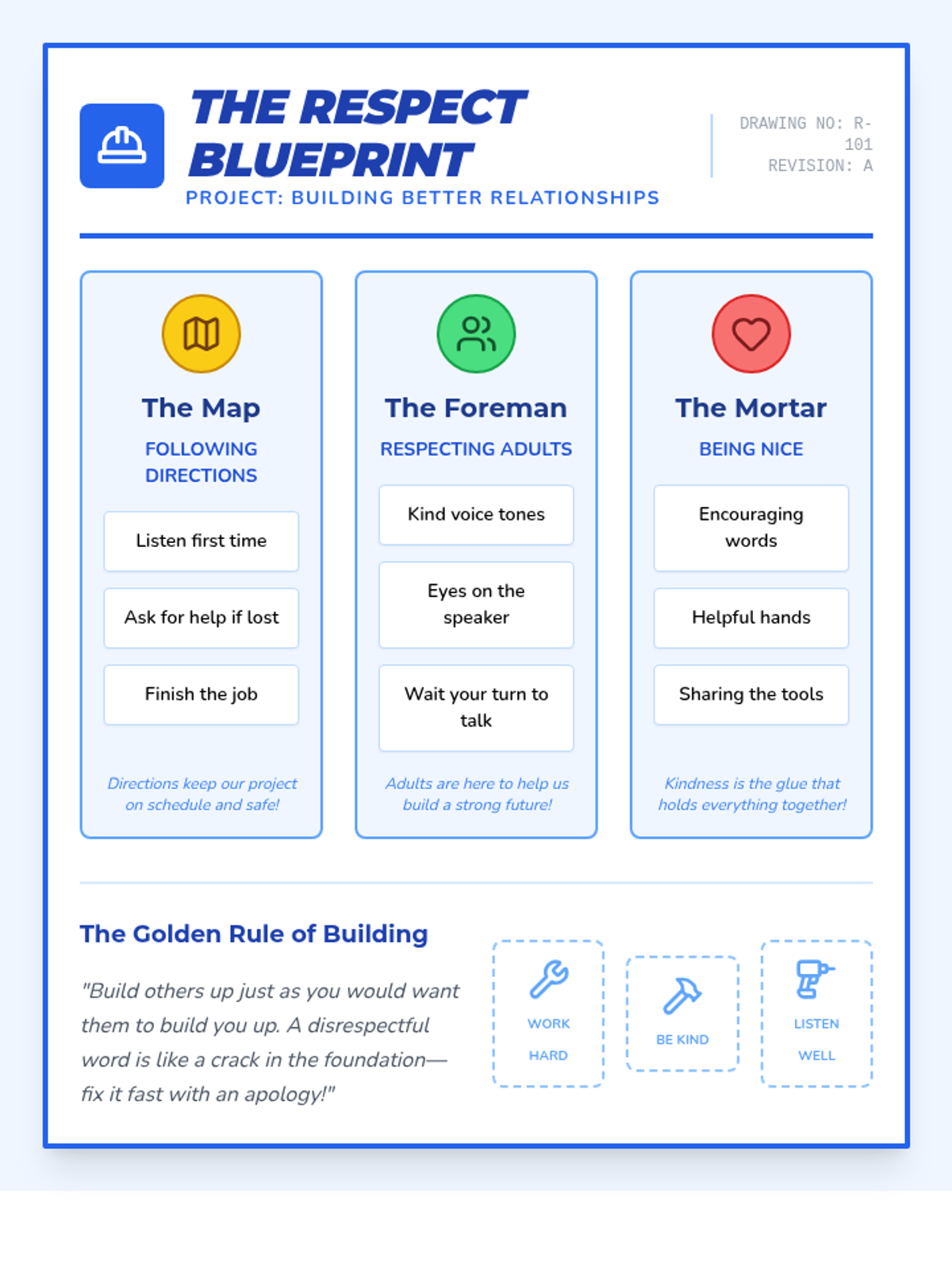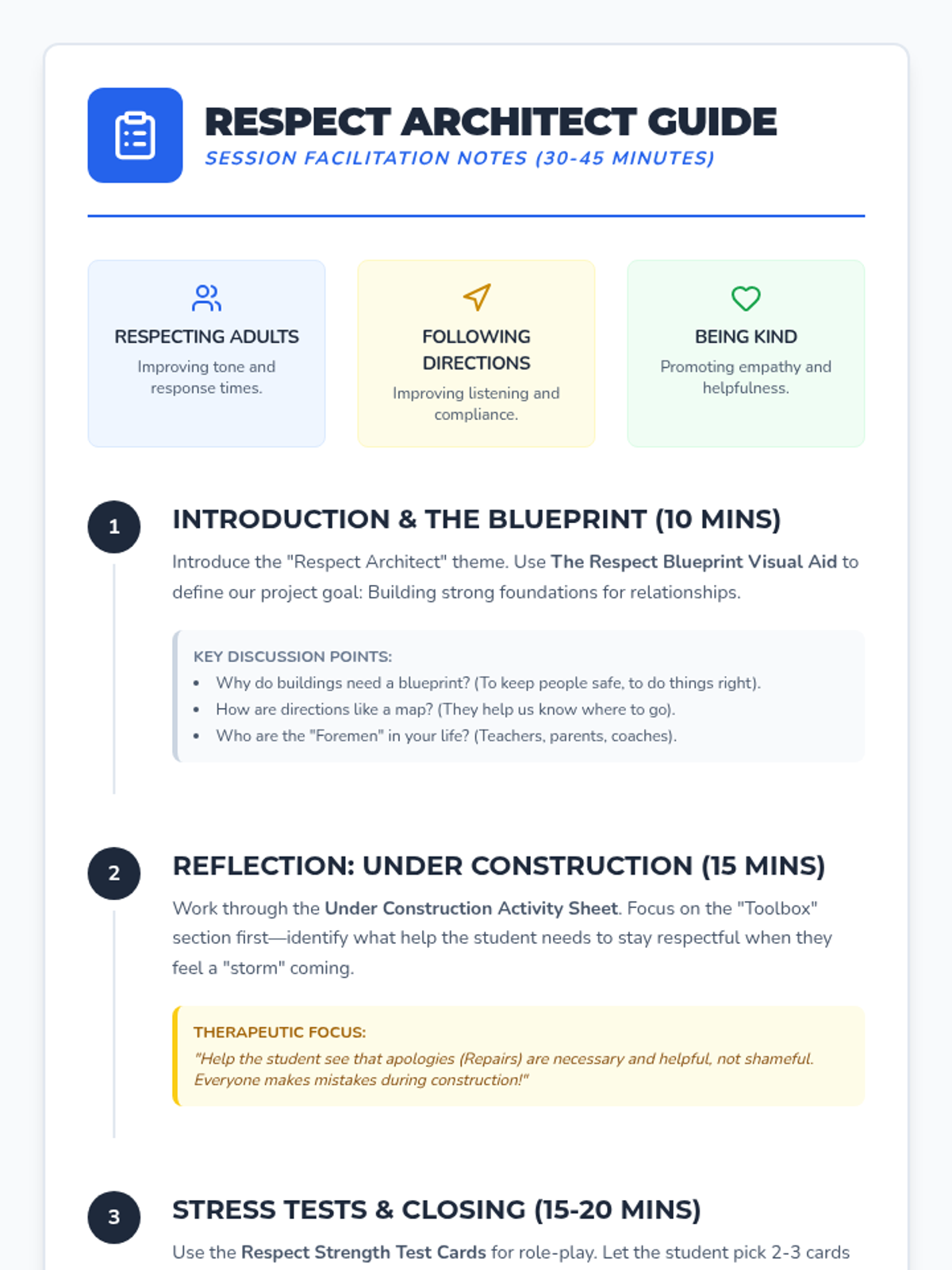 A comprehensive individual therapy session focused on building respect toward adults, following directions, and being kind to others. The session uses a 'Respect Architect' theme to help students visualize their social interactions as building projects that require care and the right tools.
