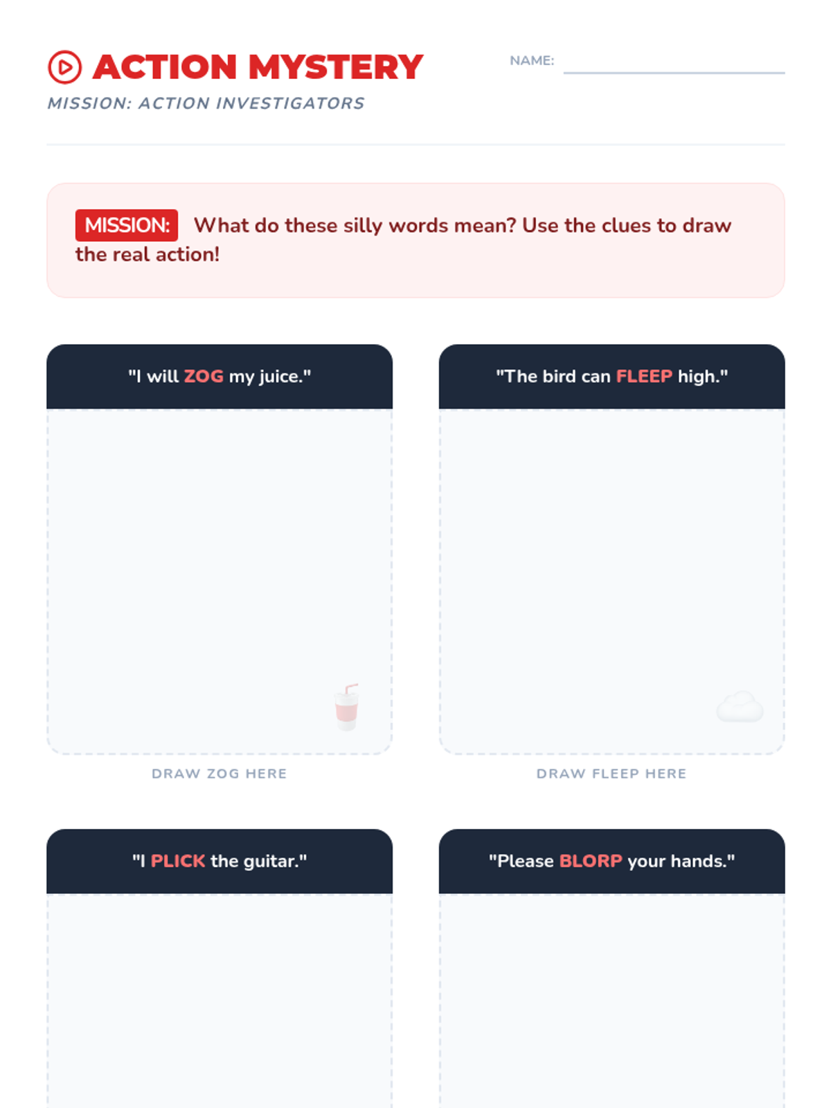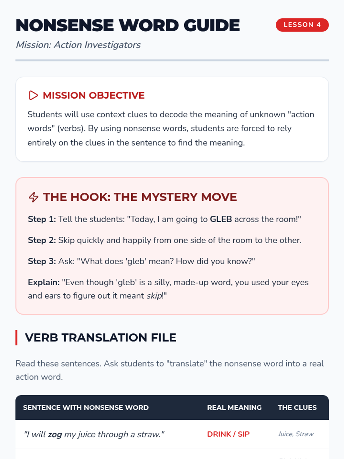 Students decode action words using nonsense verbs in context to determine real meanings.