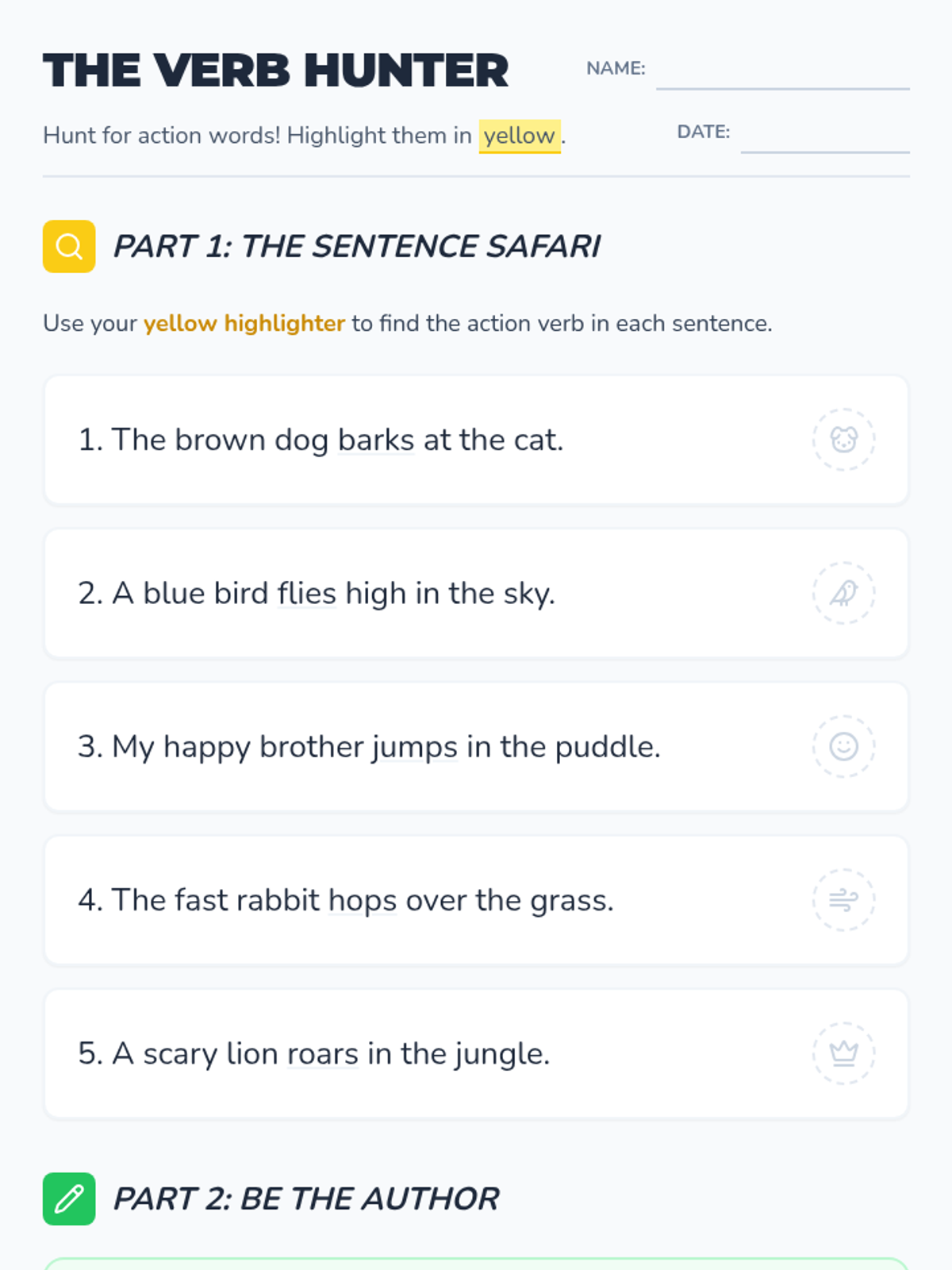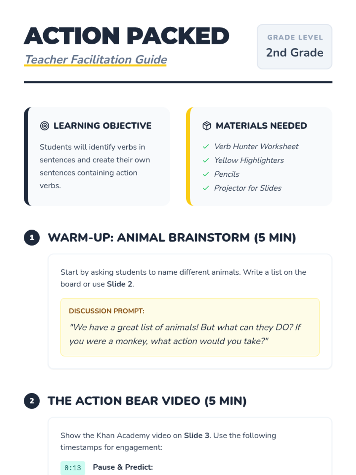 An introductory lesson on action verbs for 2nd graders, featuring animal brainstorming, a Khan Academy video, and a 'Verb Hunter' sentence-building activity. Students learn that every sentence needs a verb to show action.