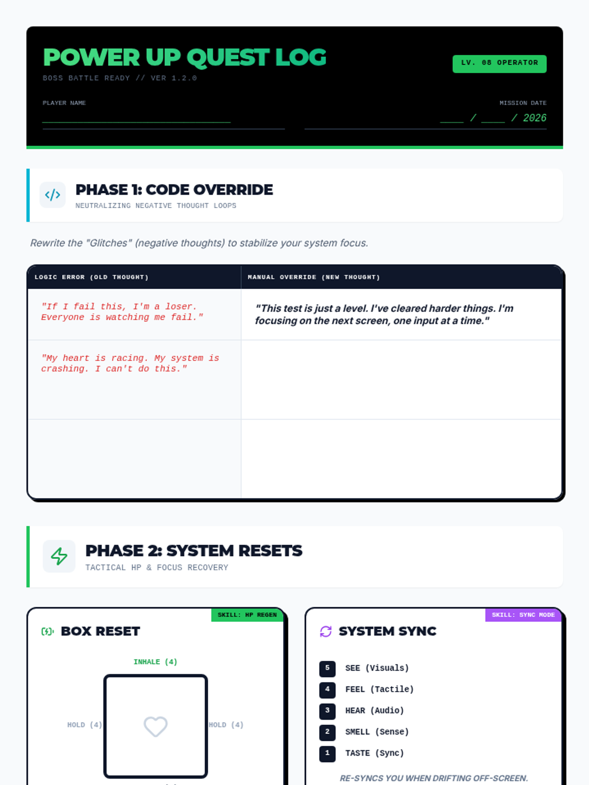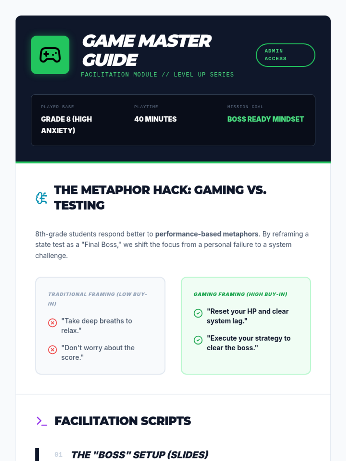 A gaming-themed toolkit for 8th-grade students to master state testing anxiety. This lesson uses video game metaphors like 'power-ups' and 'boss battles' to teach tactical reframing and grounding techniques.