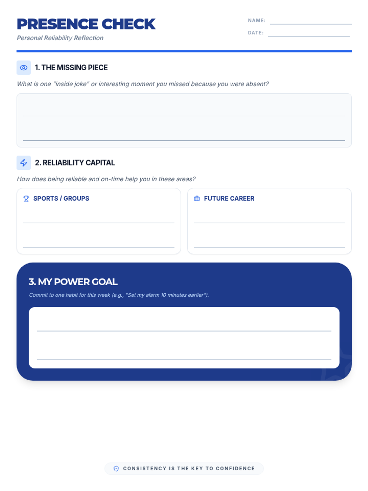 This lesson helps students identify personal barriers to school attendance, set actionable attendance goals, and reflect on the connection between presence and their future aspirations. It also provides teachers with a supportive framework for family communication regarding attendance.