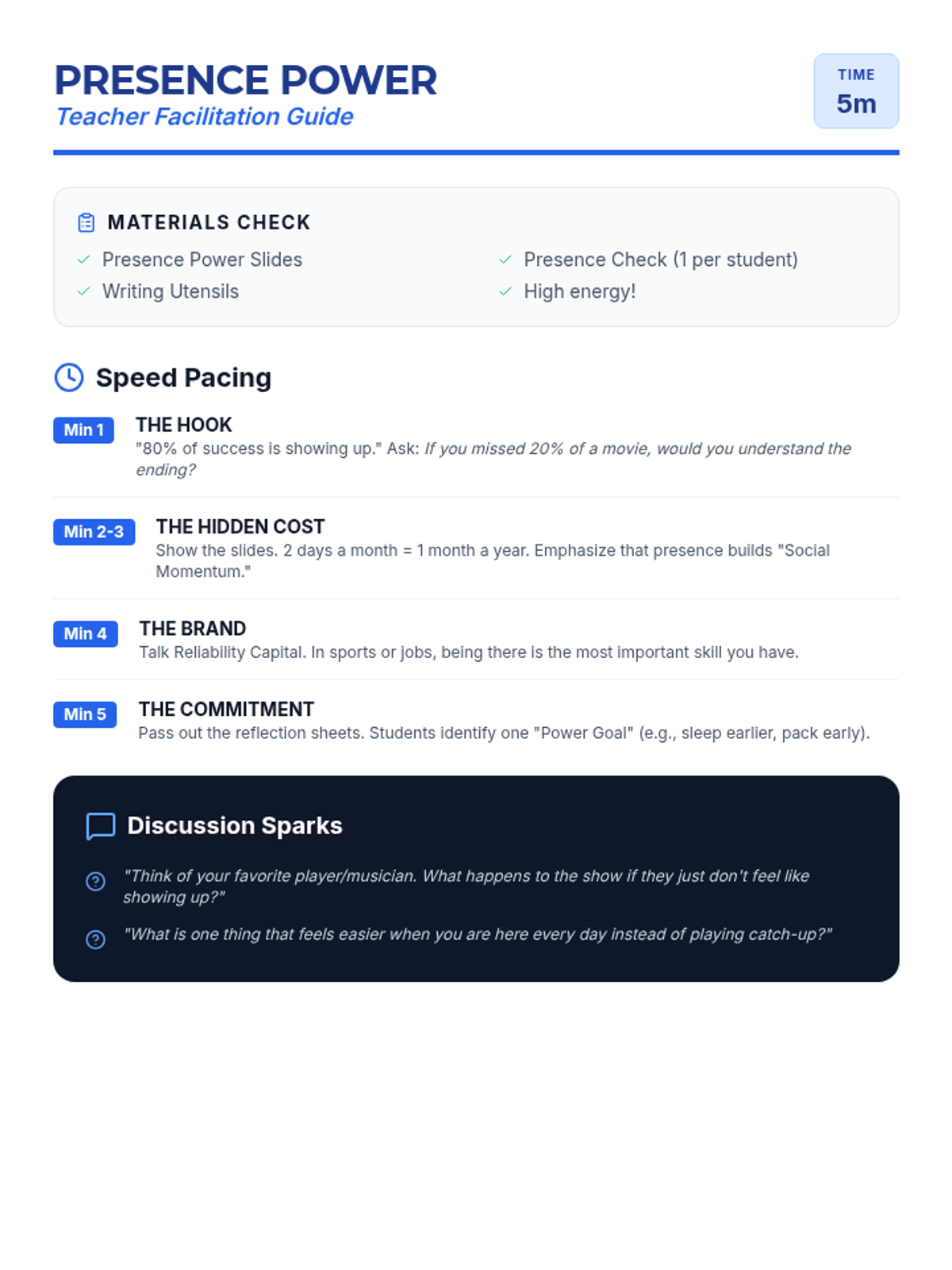 A high-impact, five-minute lesson designed to help middle school students understand the connection between attendance and their personal success.