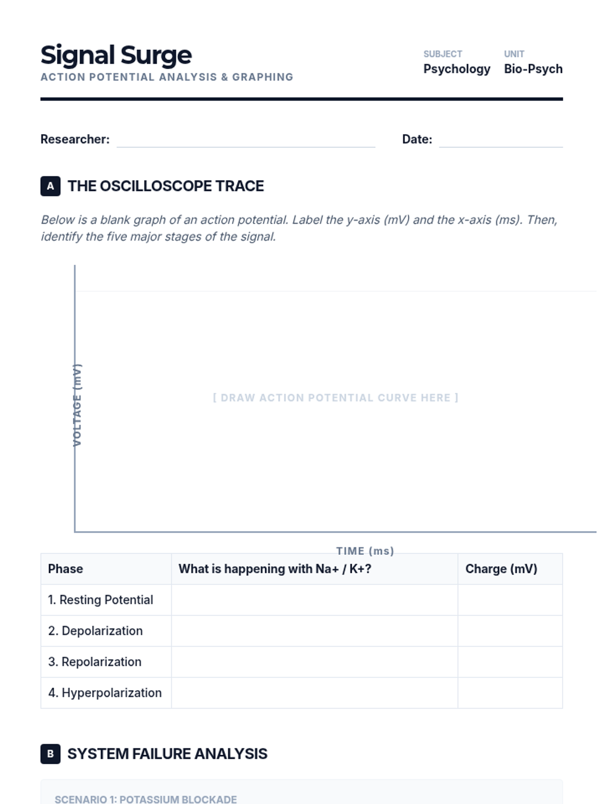 Focuses on the electrochemical 'all-or-none' firing process, modeling ion movement and the sequential phases of the action potential.
