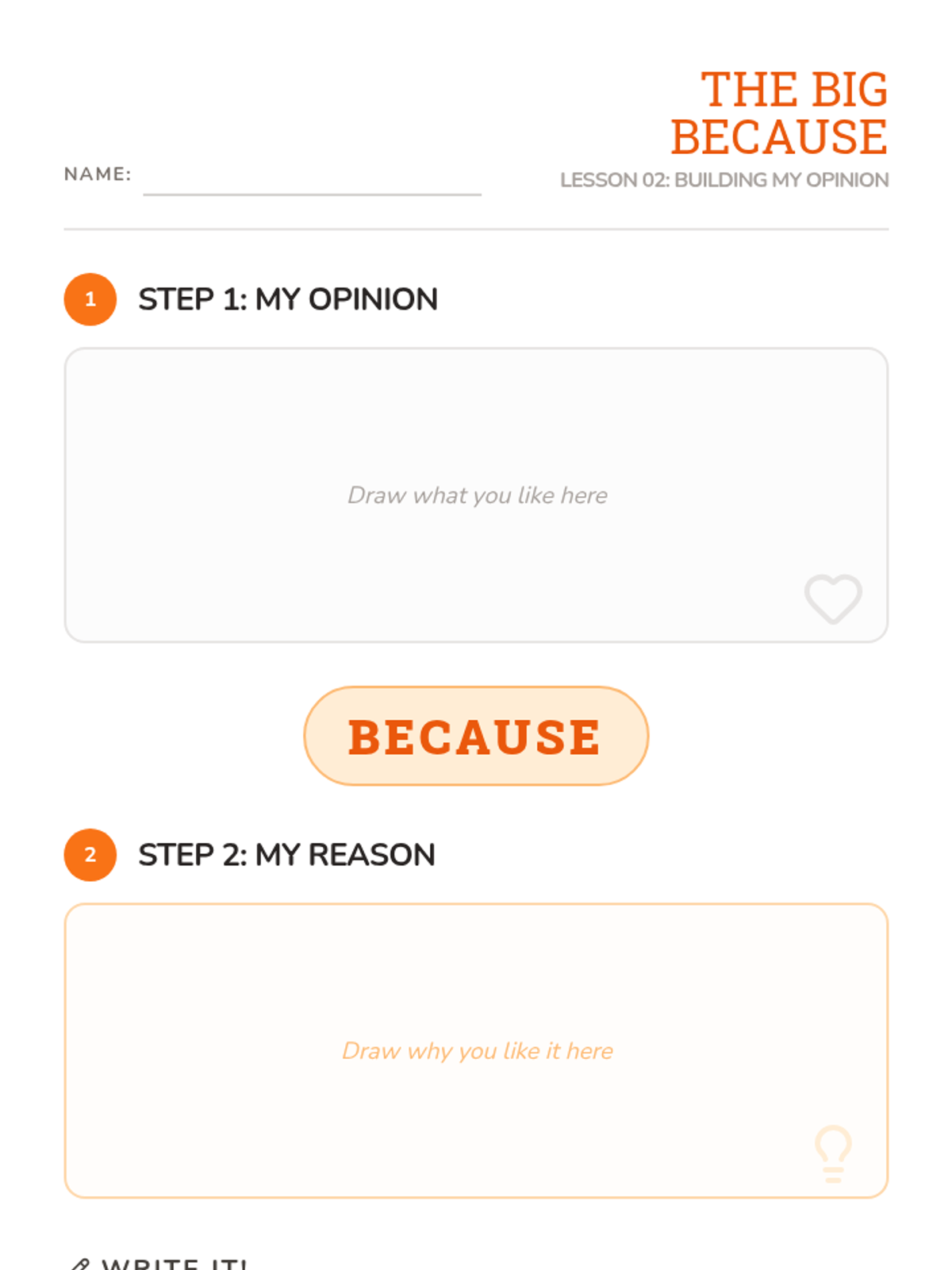 A foundational lesson for kindergarten students on using the word 'because' to link an opinion with a supporting reason, using relatable examples like food and play.
